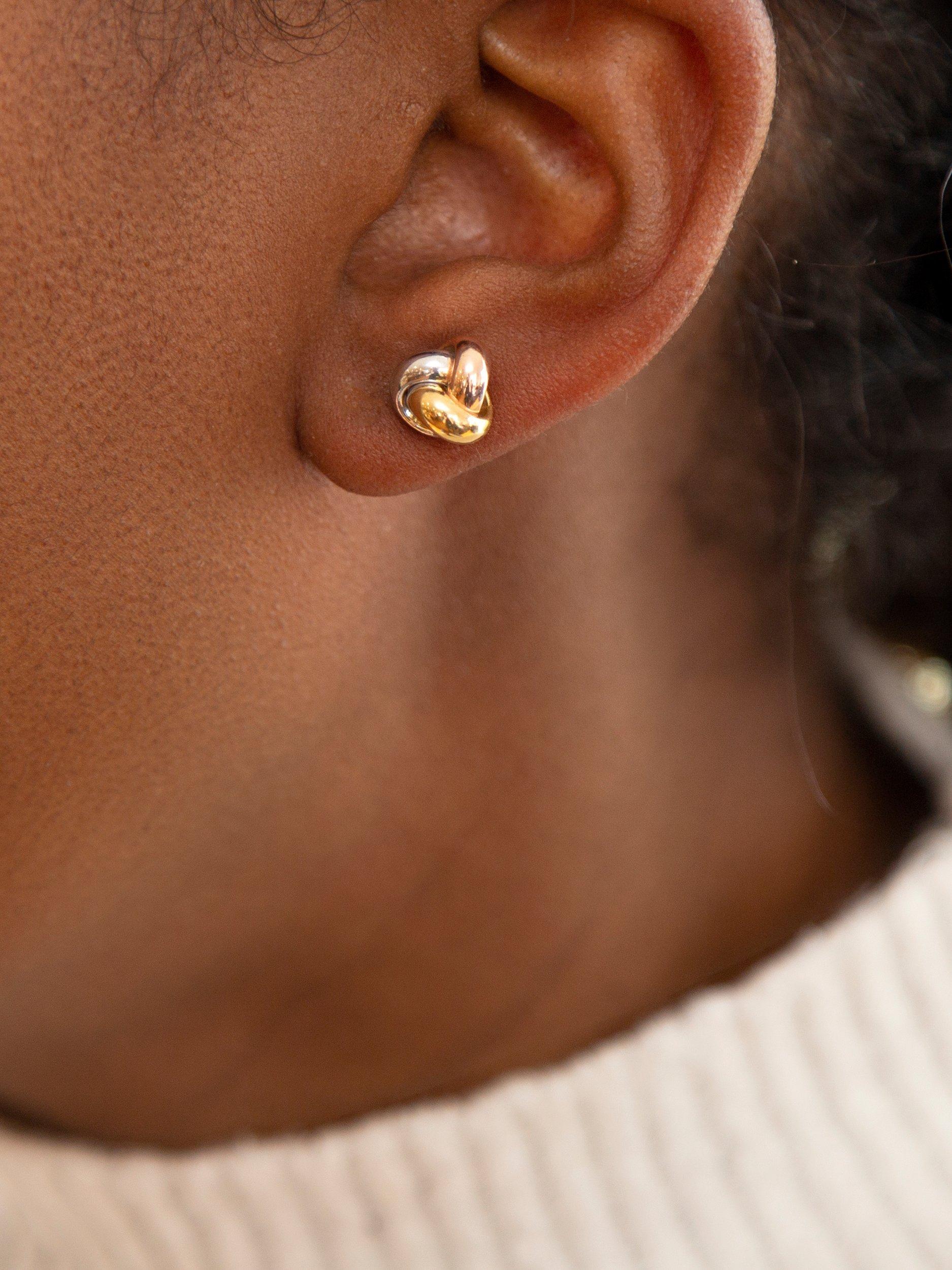 A stunning design by IBB, these triple-knot stud earrings are ideal for any occasion - from everyday wear to nights out. Made from 18ct white, yellow and rose gold and complete with post fittings, they are suitable for pierced ears only.