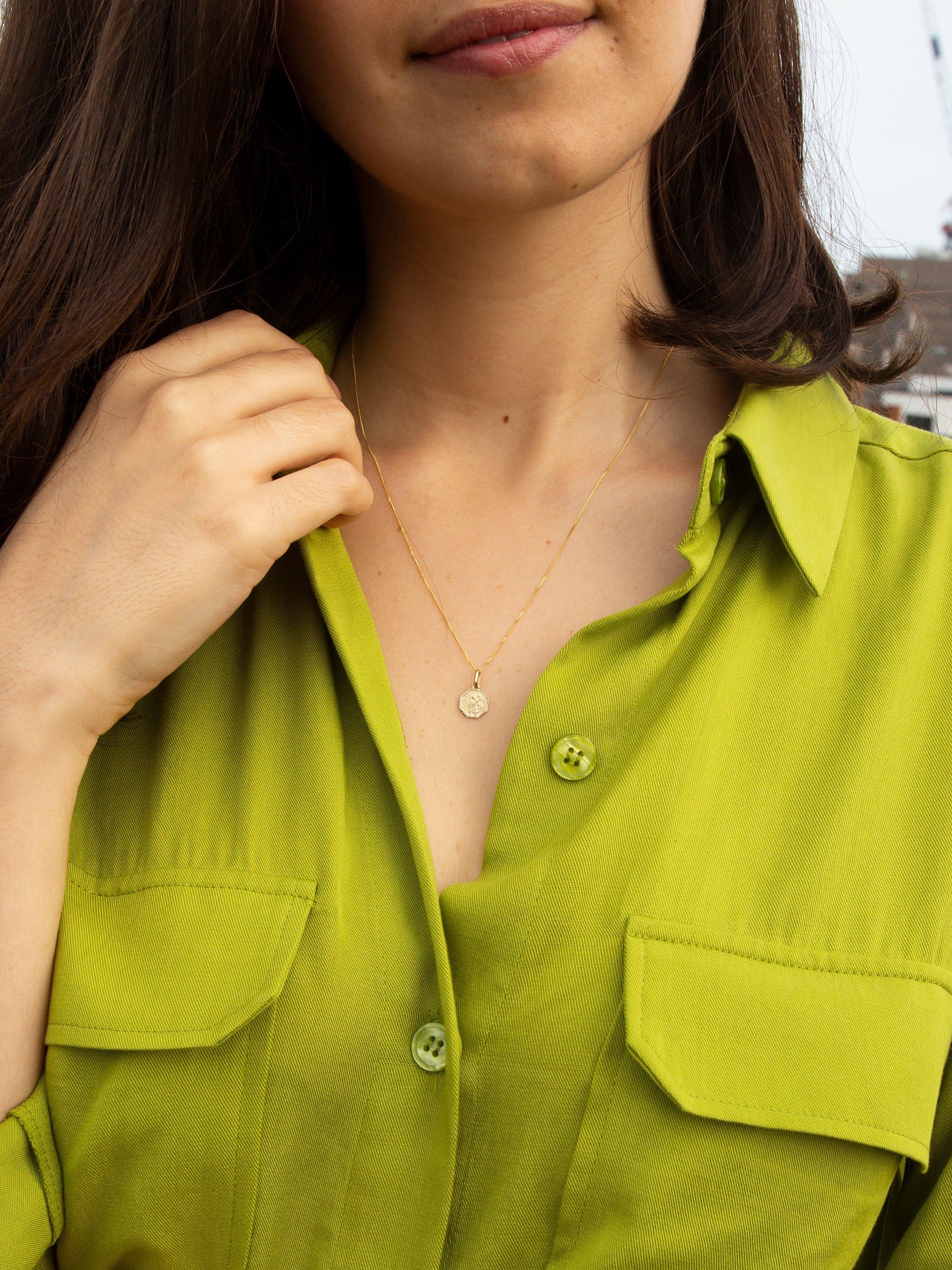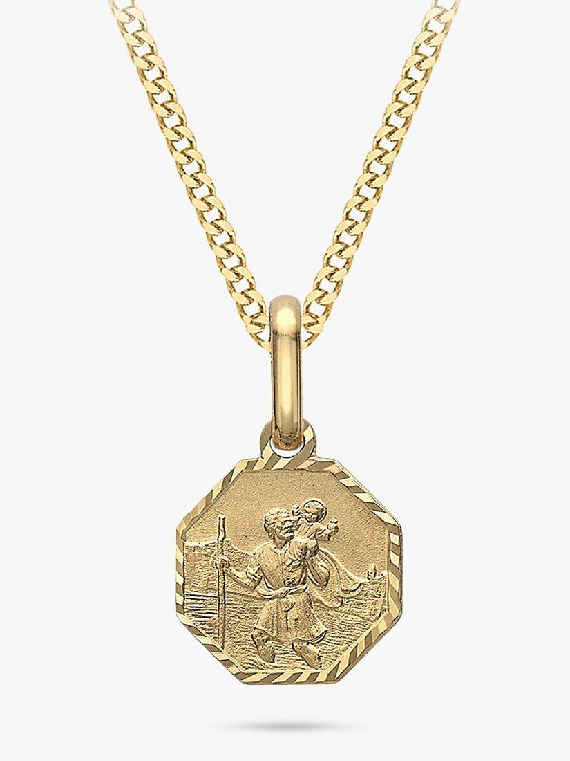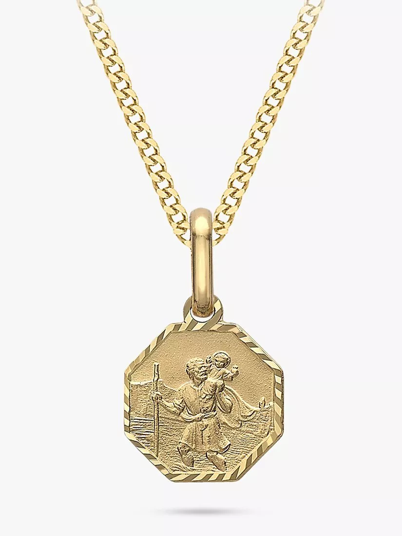 This IBB necklace comes with an octagonal pendant with an elegant satin finish. The pendant depicts the image of St Christopher, patron saint of travellers. Suspended on a curb chain, the pendant will protect you wherever you go.