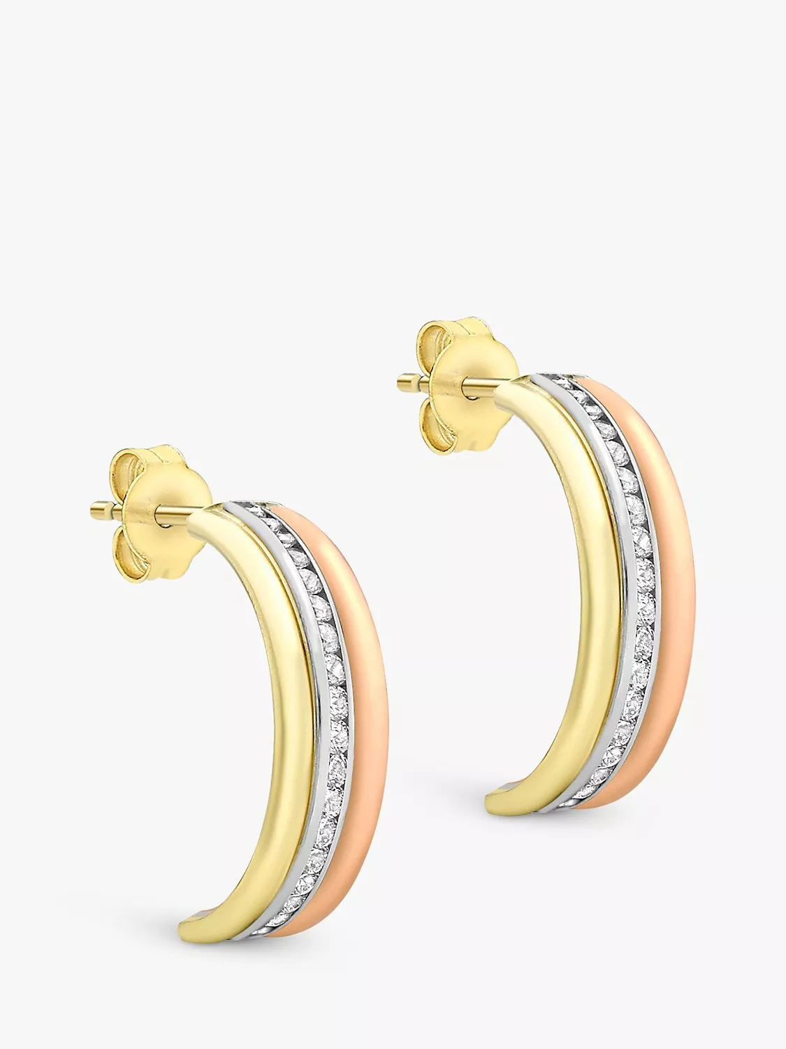These striking and luxurious half hoop earrings feature three gleaming metallic tones. Gold and rose gold lie either side of a silver band of sparkling cubic zirconia stones.