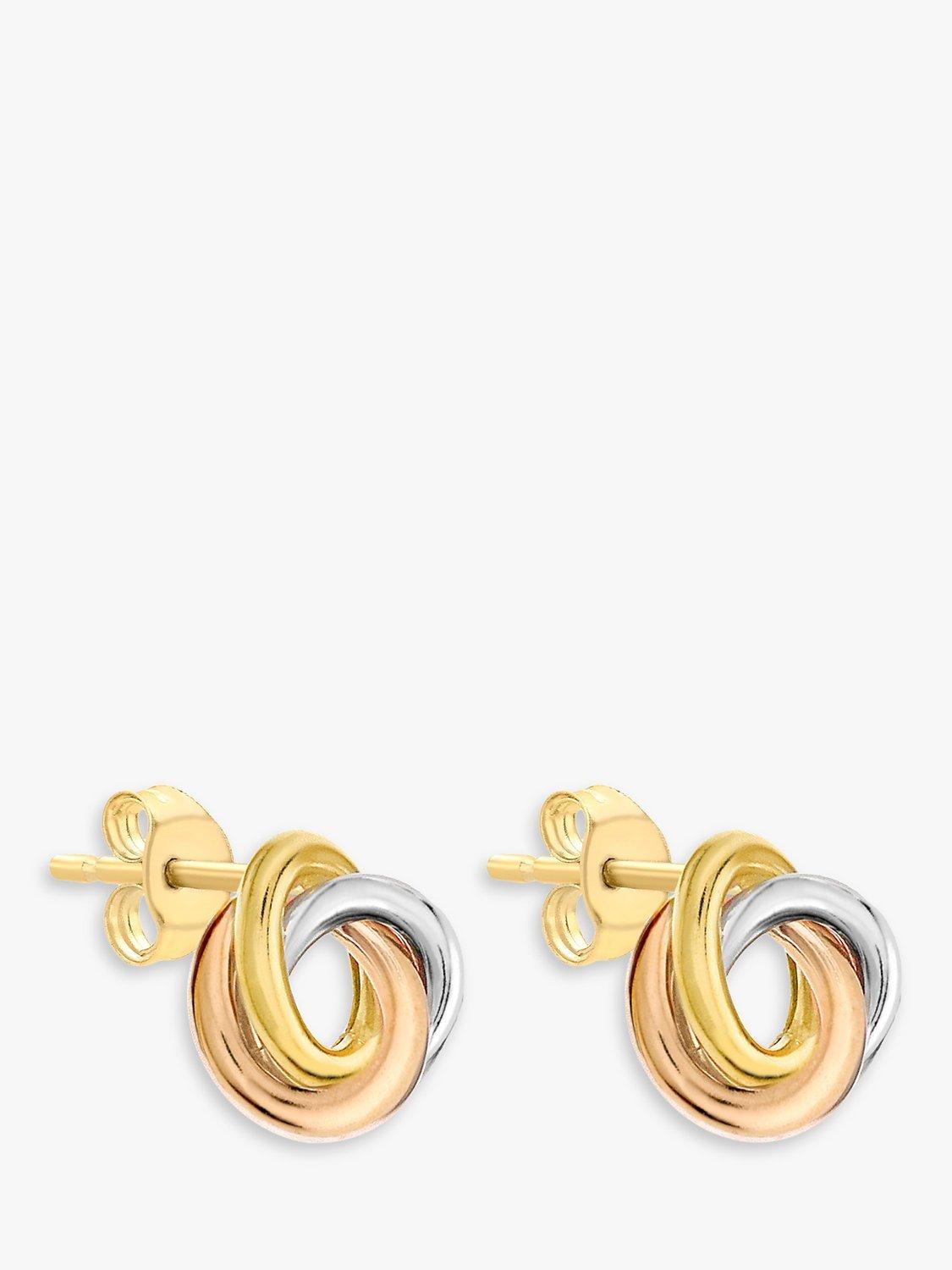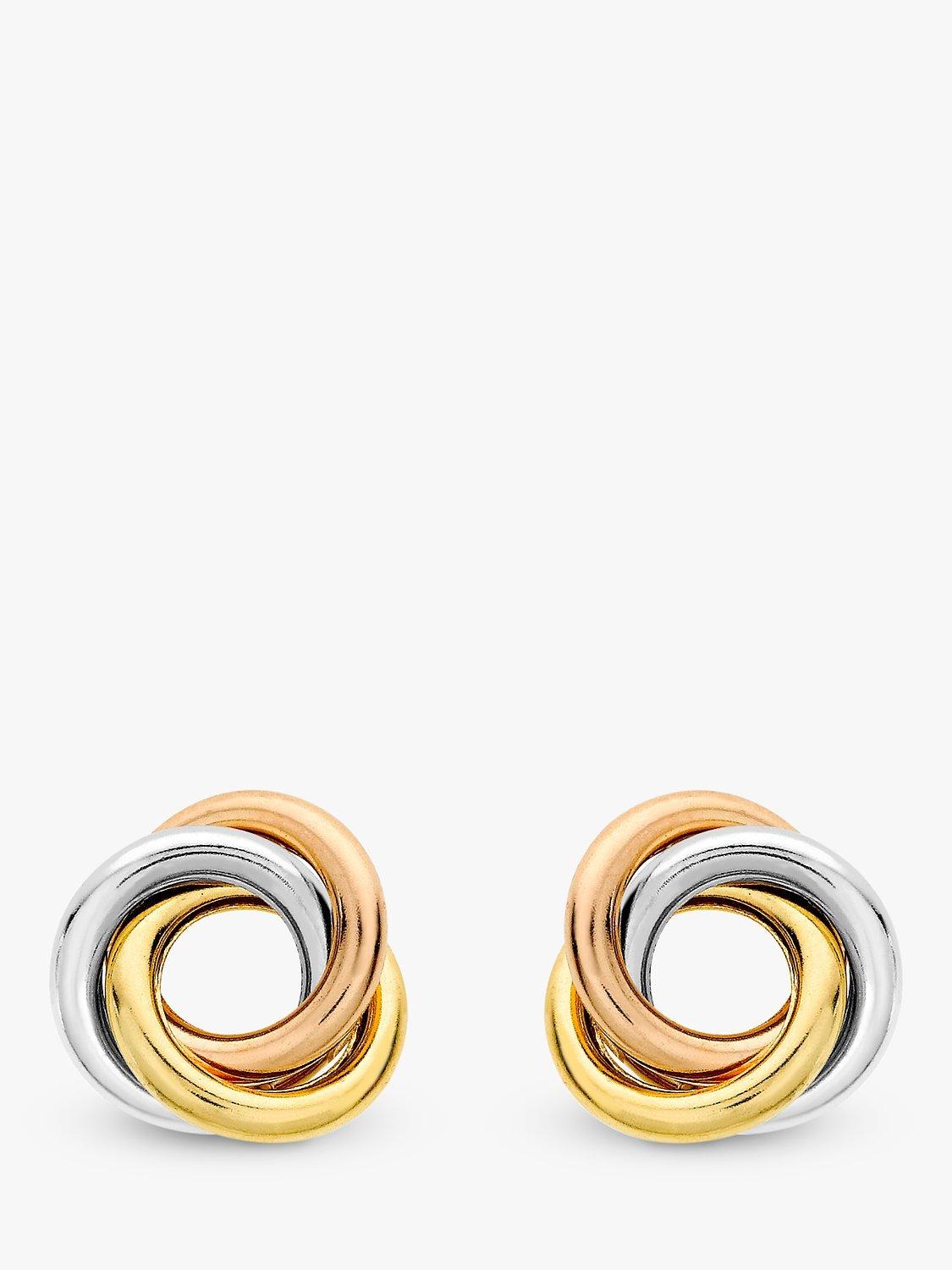 These unique earrings have an open hoop shape with knotted rings in yellow, white and rose gold.