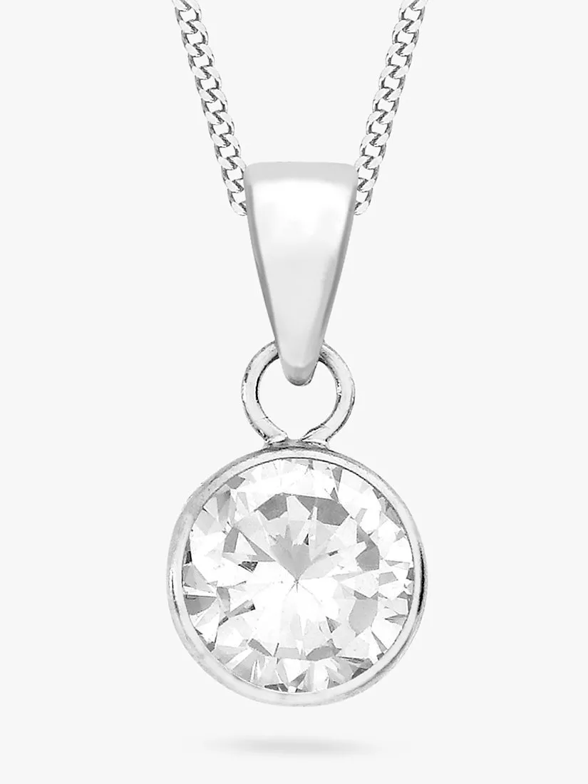 A slender chain leads down to a striking portion of cubic zirconia. The round-cut faceted stone is set in a 9ct white gold surround.