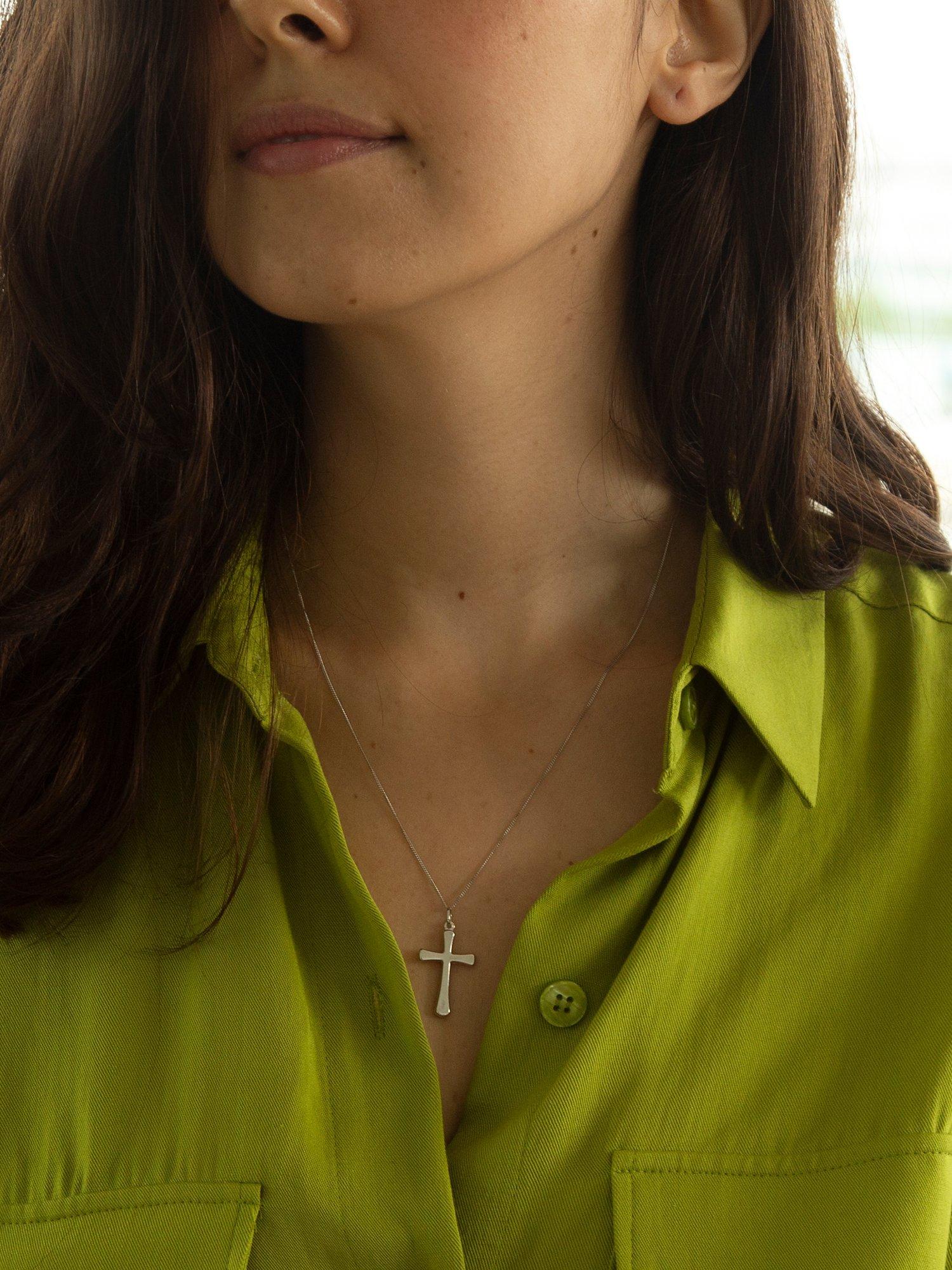 This polished cross pendant from IBB is crafted from 9ct white gold and suspended onto a delicate white gold chain.