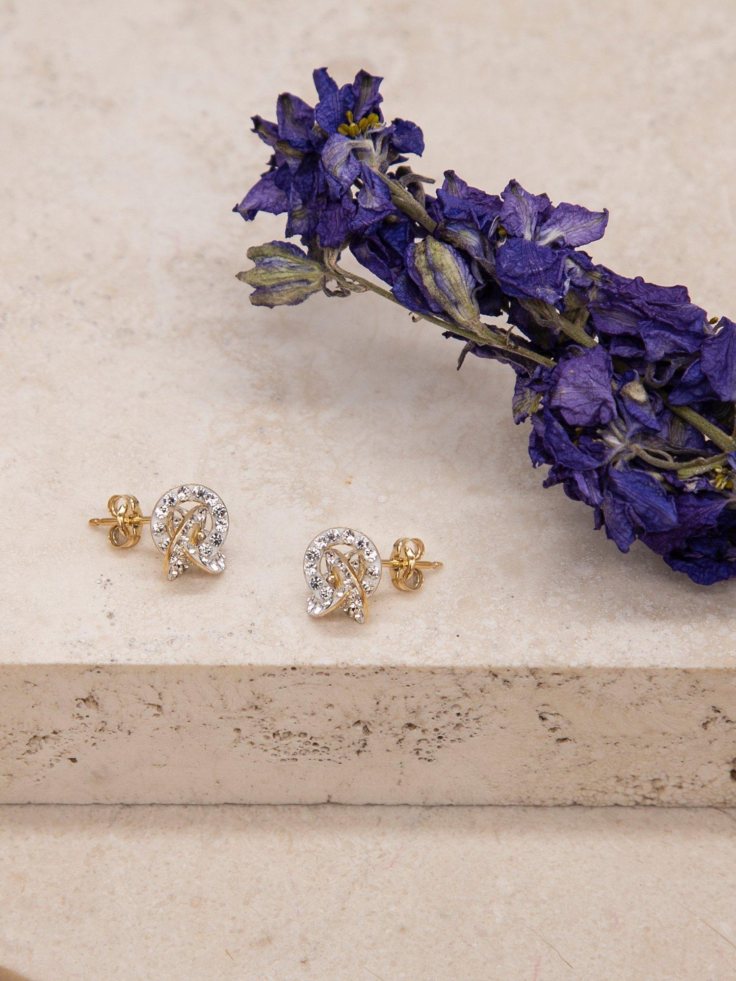 The pair comes in 9 karat yellow gold and boasts an intriguing knot design punctuated by clear round-cut cubic zirconia set. The traditional stud fittings make this piece highly- wearable and comfortable.