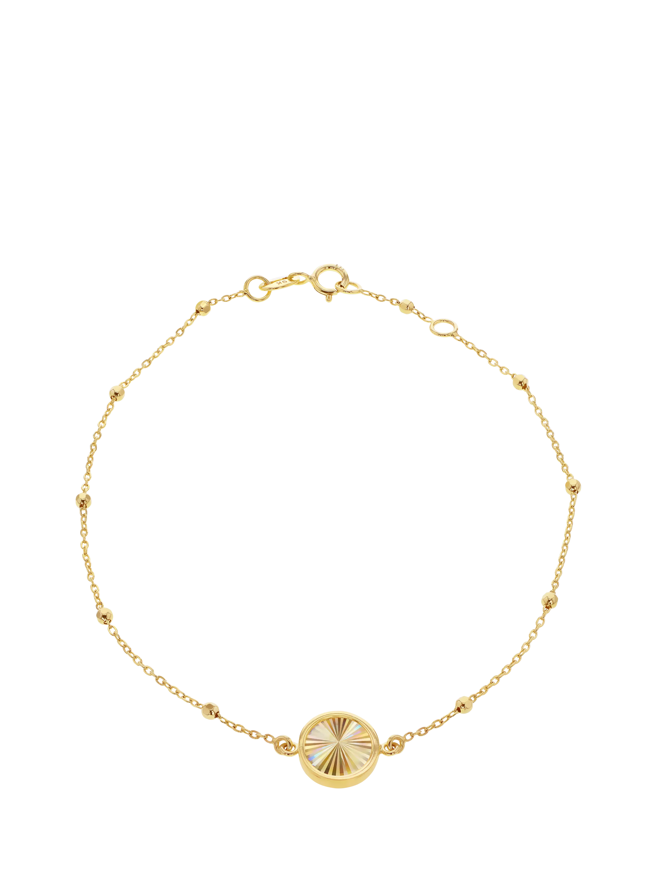 A practical piece with lasting impact, this 9ct gold trace and ball bracelet from IBB features a rainbow circle charm and a spring ring fastening.