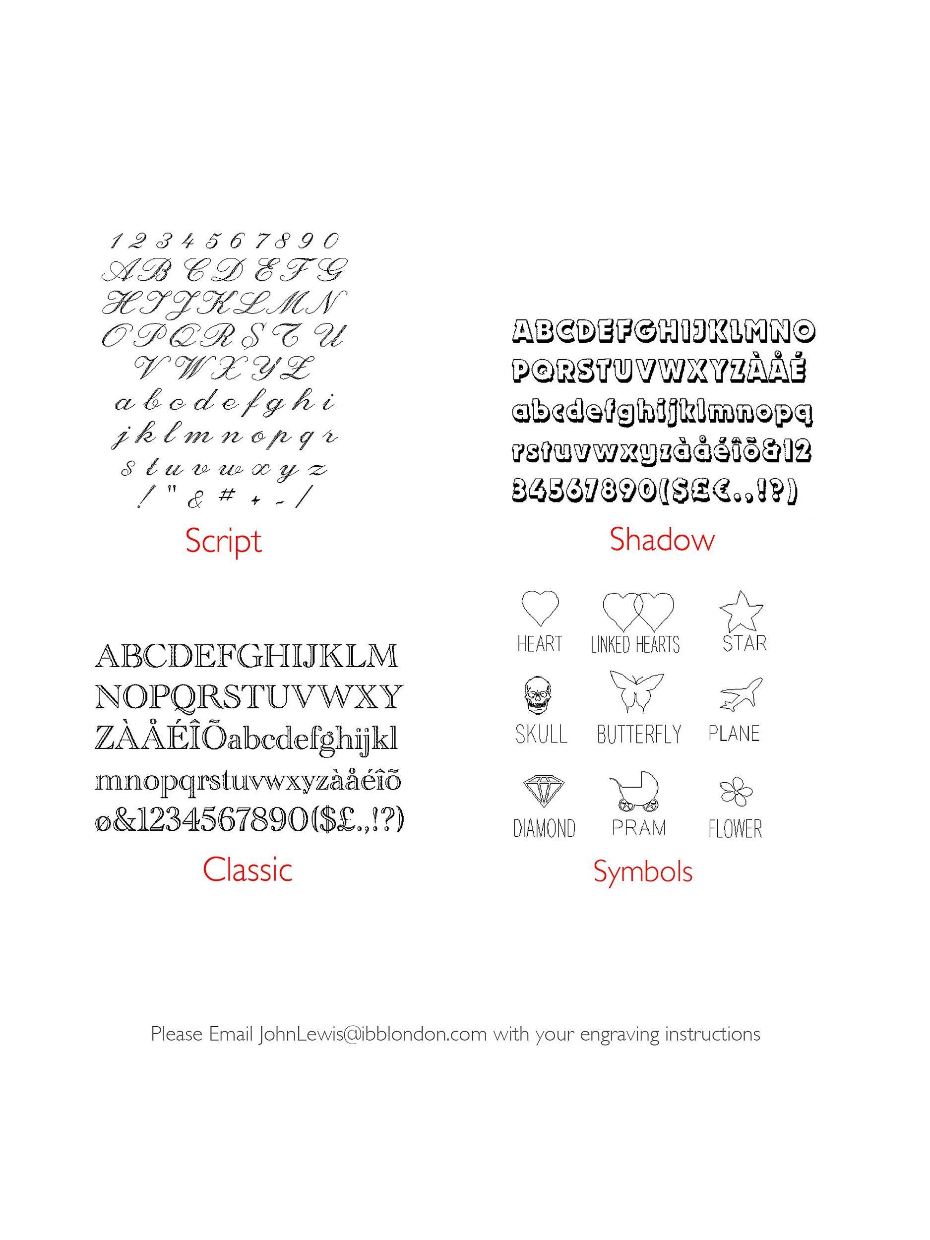 | 2. | Decide how you would like to personalise your product, please see the product images for character limit, available font styles and engraved examples. | |