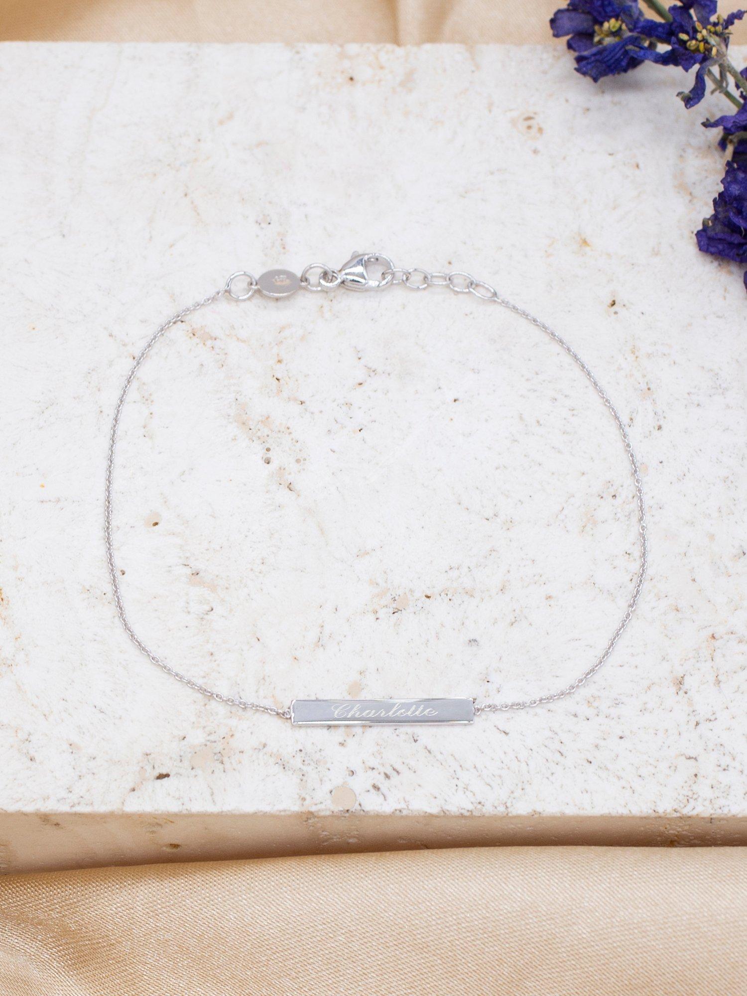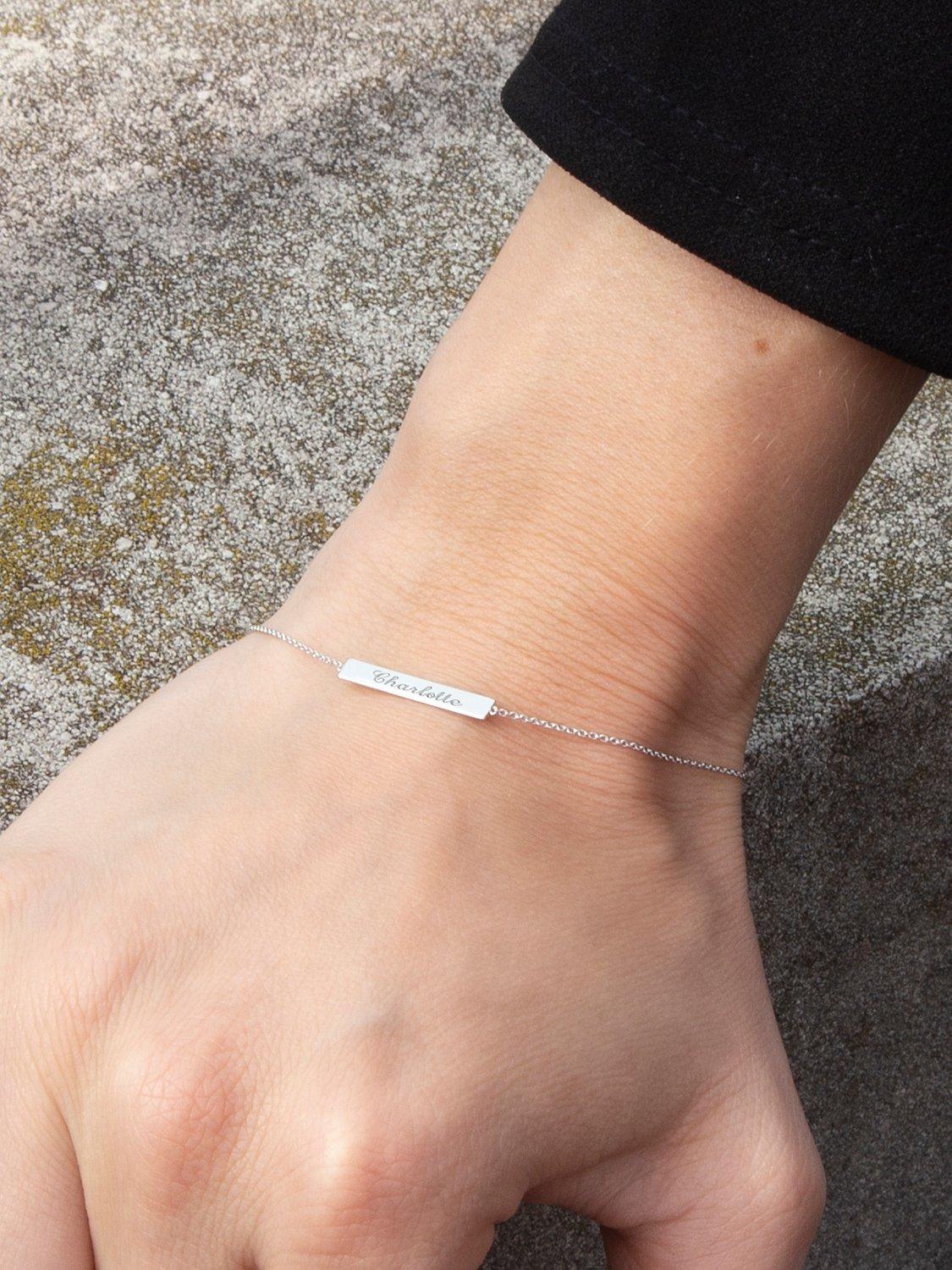 Crafted from solid gold in different tones, this bracelet displays a fine chain with an adjustable lobster clasp fastening. The chain presents a polished bar element which can be engraved and carry a message of up to 9 characters in either script or block font.