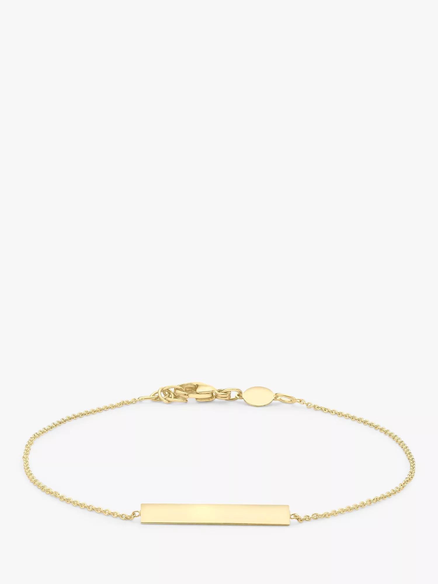Crafted from solid gold in different tones, this bracelet displays a fine chain with an adjustable lobster clasp fastening. The chain presents a polished bar element which can be engraved and carry a message of up to 9 characters in either script or block font.