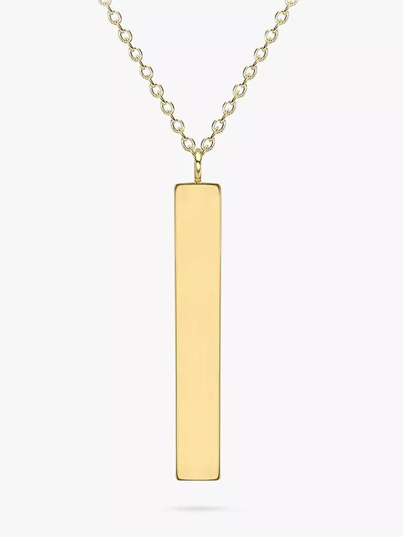 This IBB bar pendant necklace combines a pared-down design and precious metals. The slim bar can carry up to 9 characters, executed in a choice of fonts and delivering a very personal message. The vertical pendant is great for punctuating a deep V neckline.