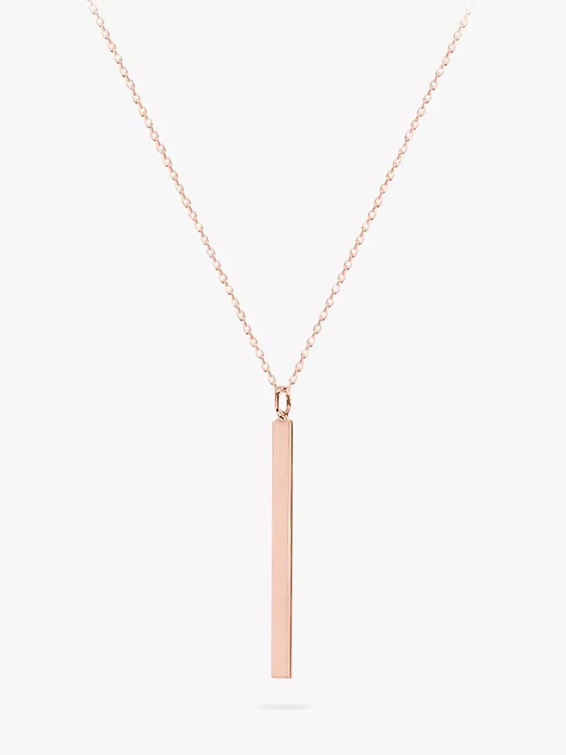 This IBB bar pendant necklace displays a sharp geometric shape made from silver and finished in a choice of gold plating. The slim bar can carry up to 12 characters, executed in a choice of fonts and delivering a very personal message.