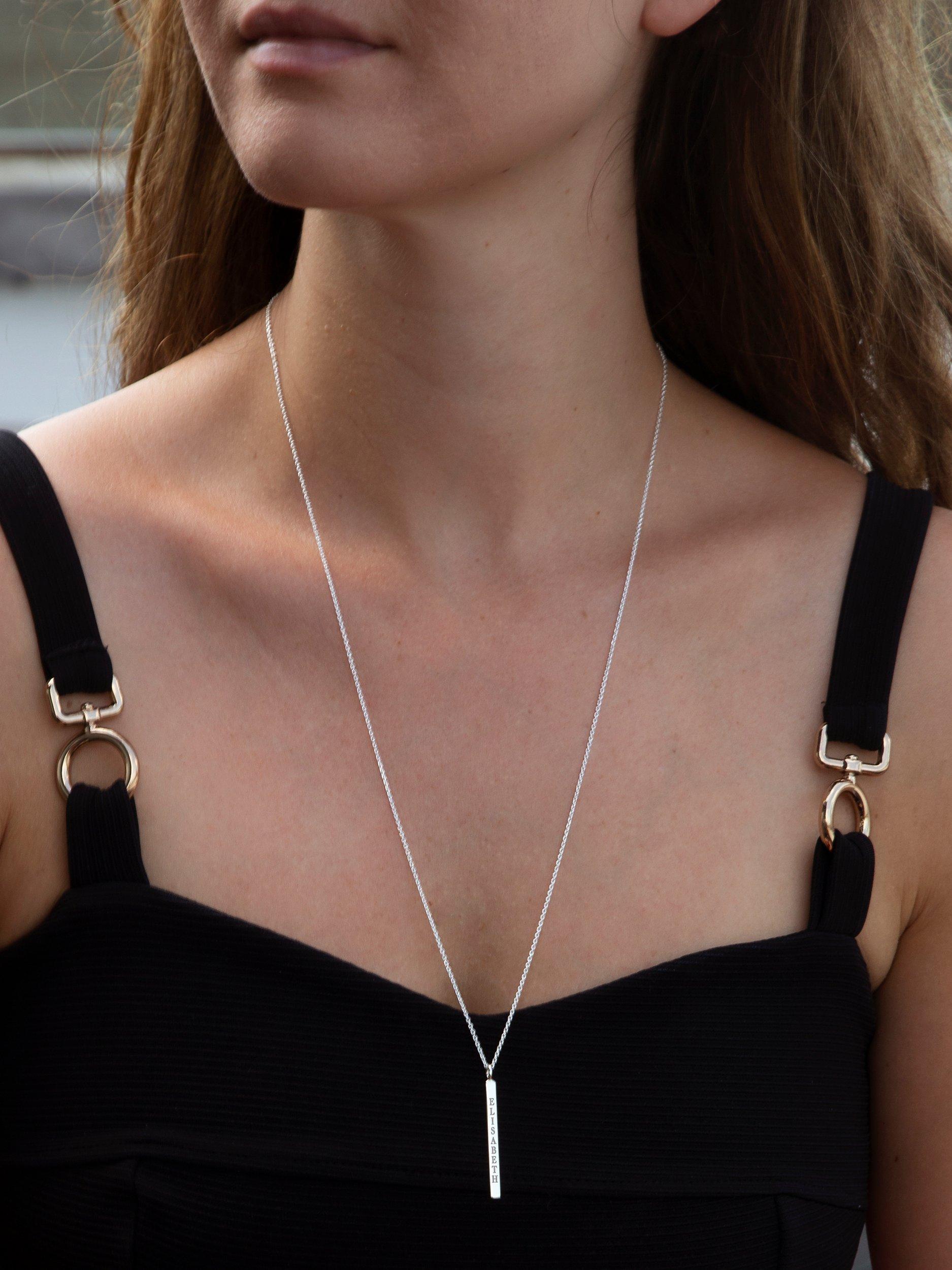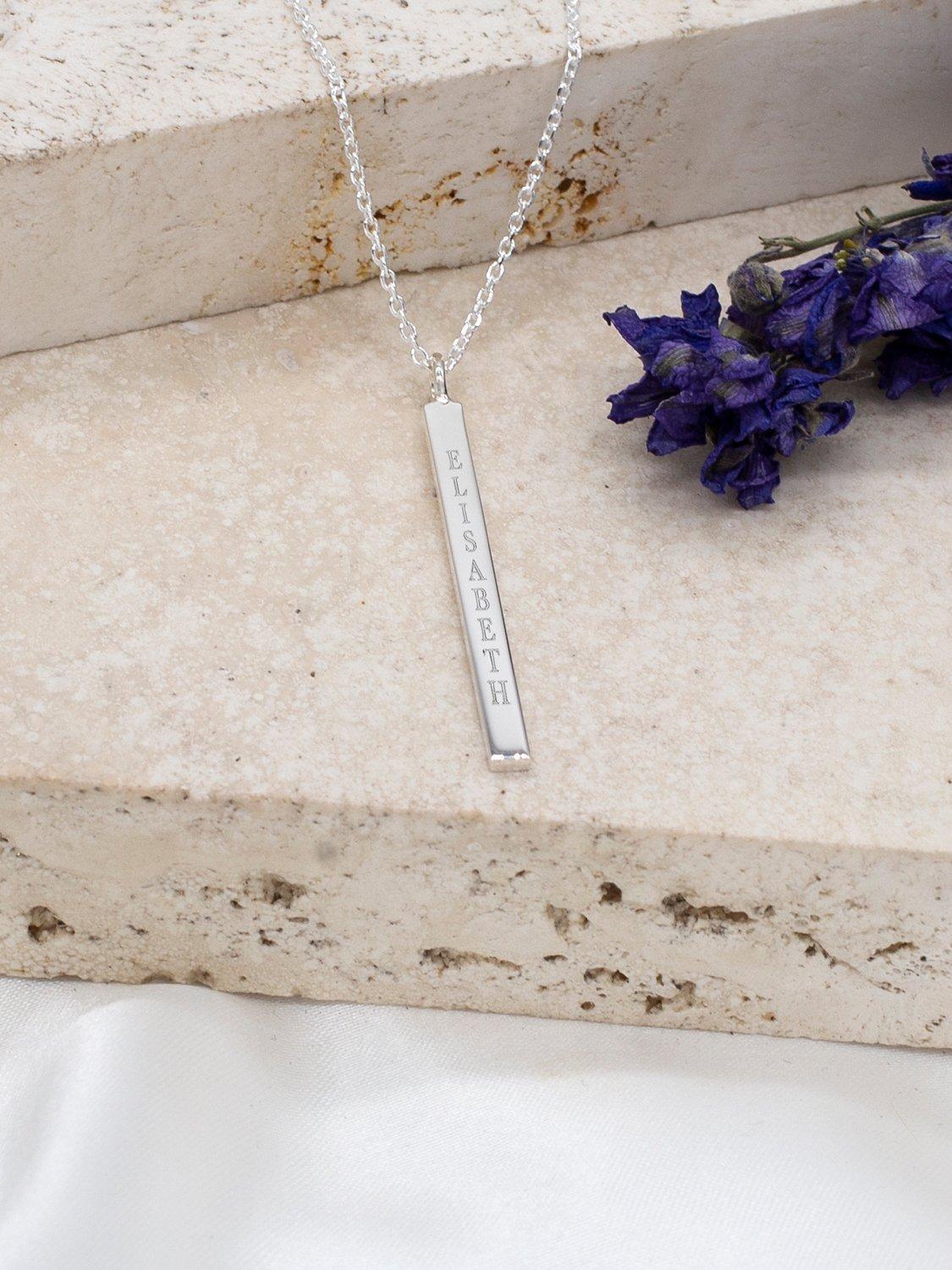 This IBB bar pendant necklace displays a sharp geometric shape made from silver and finished in a choice of gold plating. The slim bar can carry up to 12 characters, executed in a choice of fonts and delivering a very personal message.