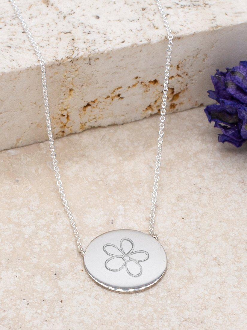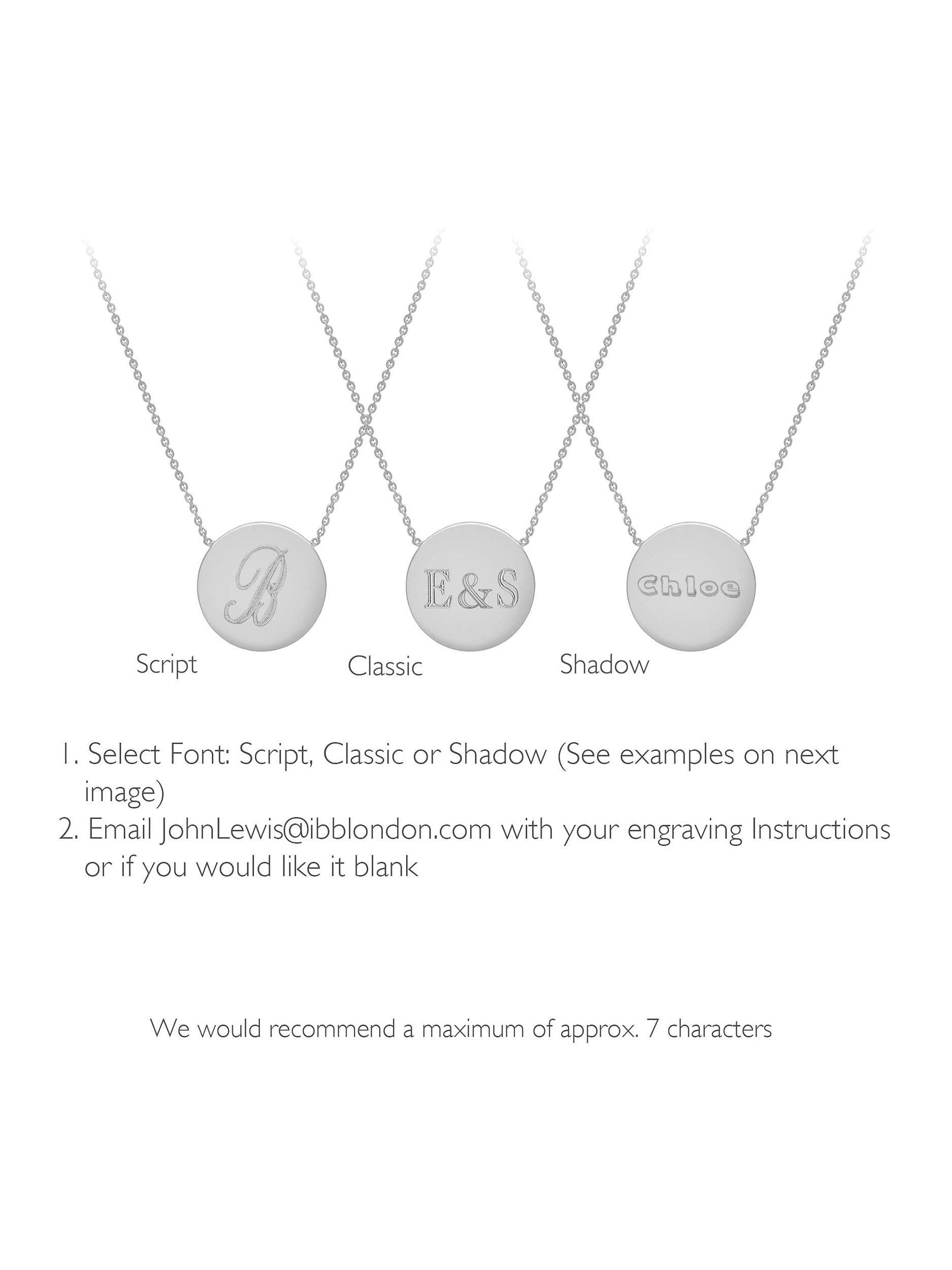 The pretty necklace is made from solid sterling silver and comes in a choice of optional gold-plated finishes. It has a classic link chain with a lobster clasp and a pretty circular disc pendant. The pendant can carry a personal message of up to 6 characters in a horizontal direction and in a choice of fonts.