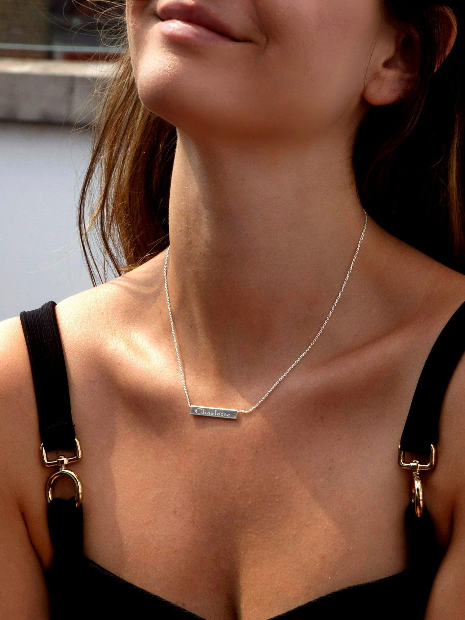 The necklace is made of sterling silver and offers optional gold-plated finishes. It features a slim bar pendant and an adjustable chain with a lobster clasp. The bar can hold up to 9 characters in script of block fonts for your very special and personal message.