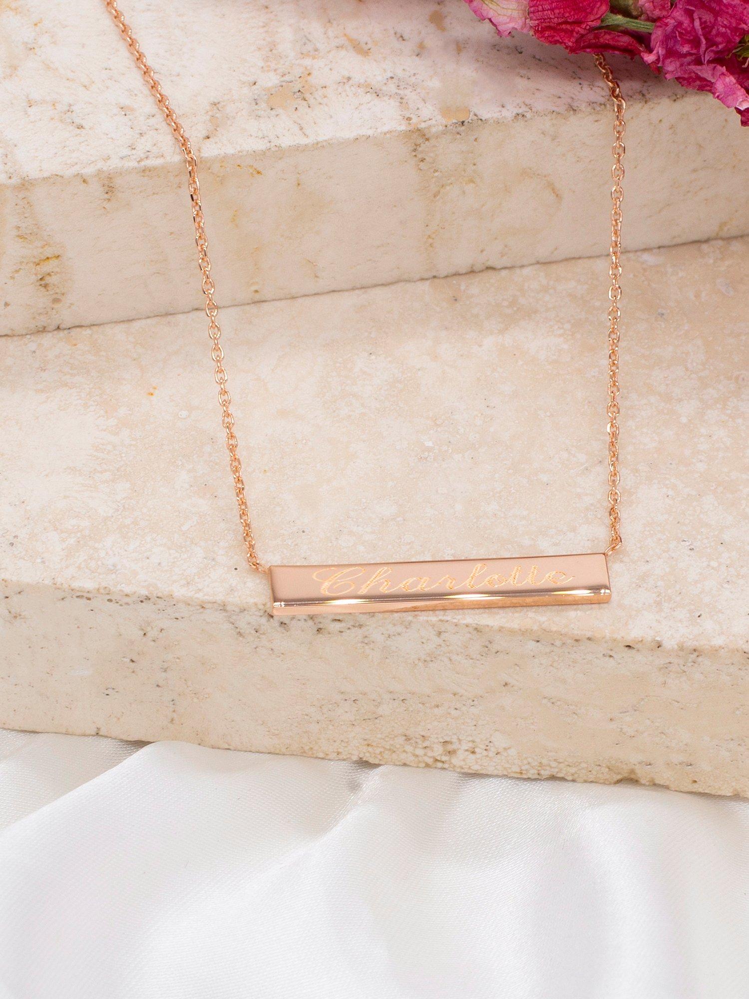 The necklace is made of sterling silver and offers optional gold-plated finishes. It features a slim bar pendant and an adjustable chain with a lobster clasp. The bar can hold up to 9 characters in script of block fonts for your very special and personal message.