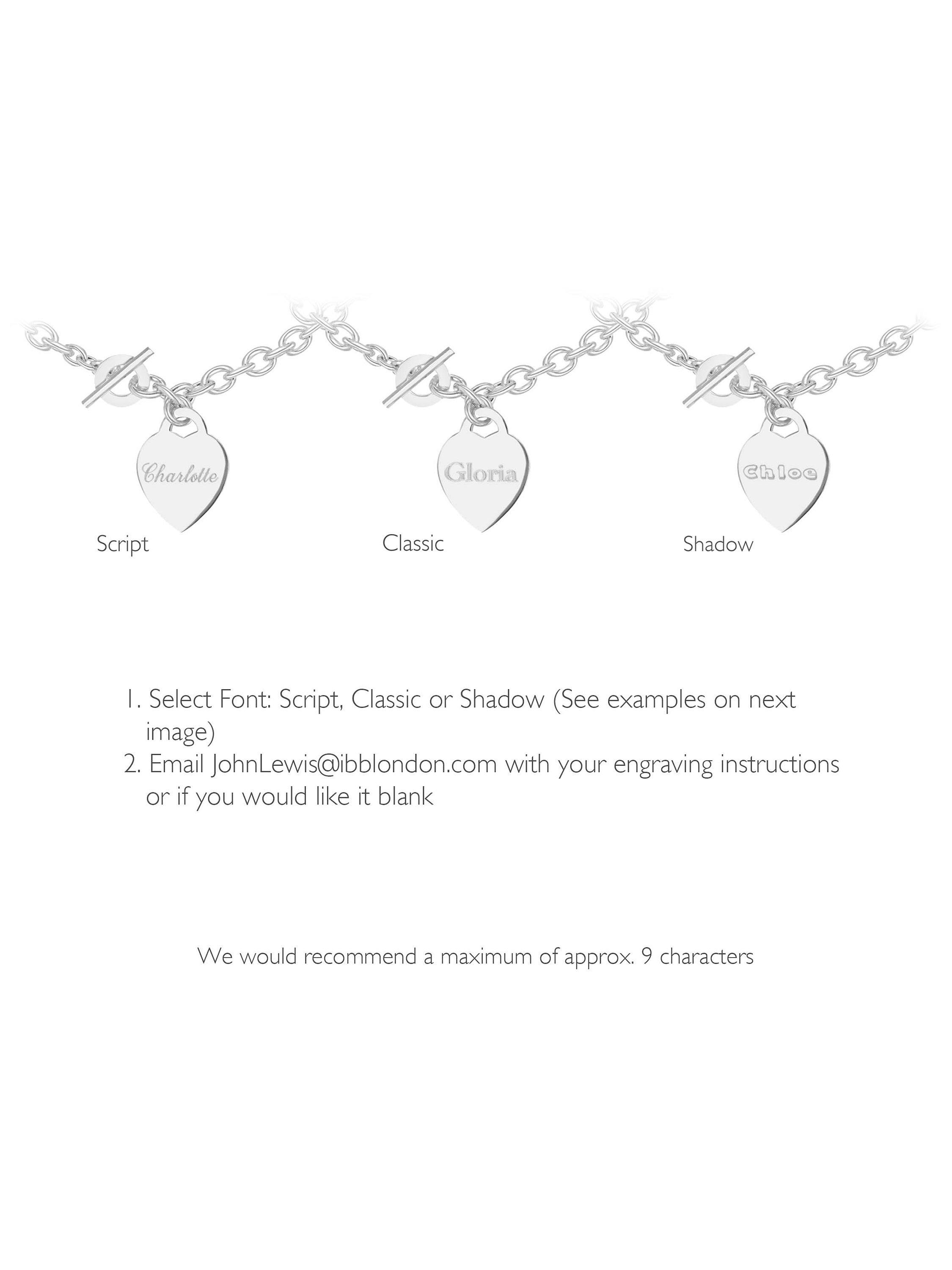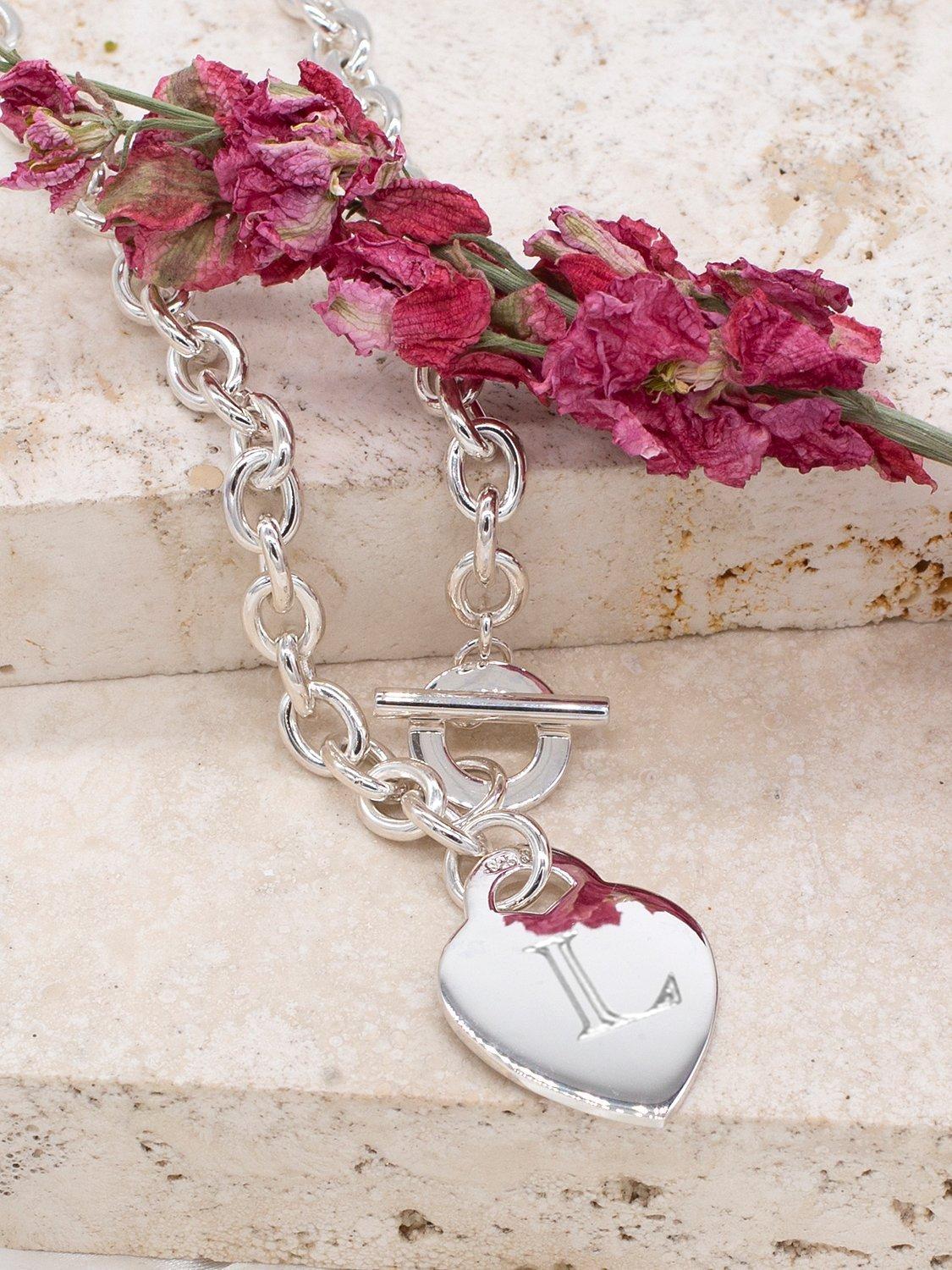 Made from solid sterling silver, this pretty linked chain is secured with a toggle clasps and features a cute, engravable heart charm. The pendant can carry a personal message of up to 7 characters in a choice of fonts.