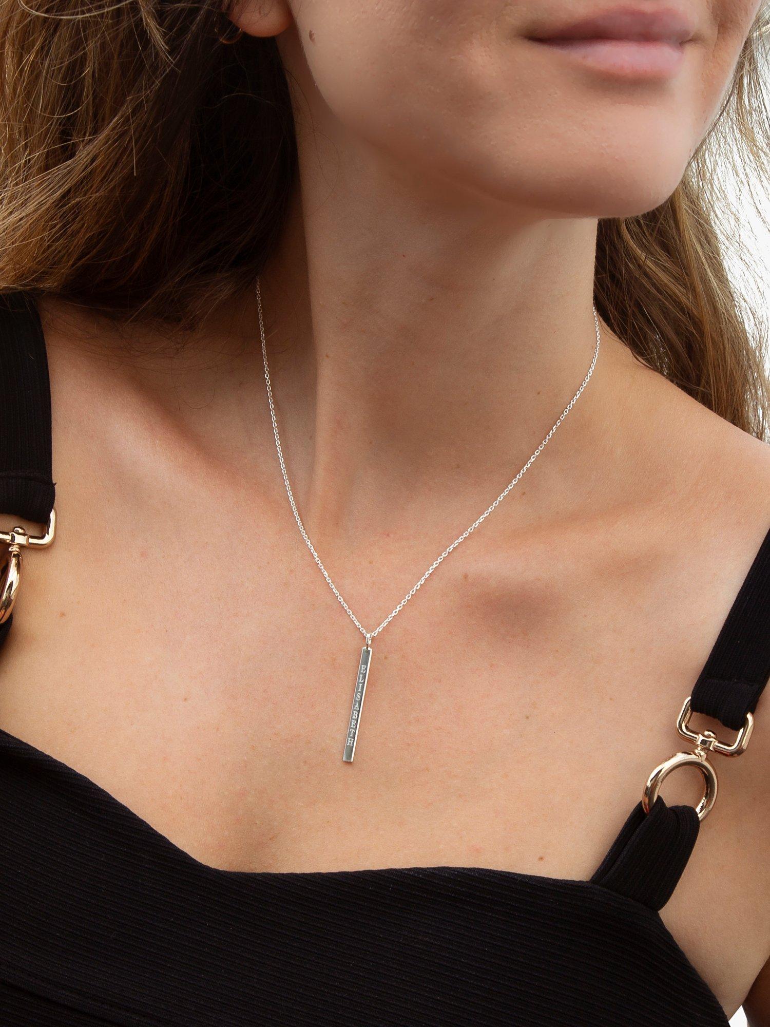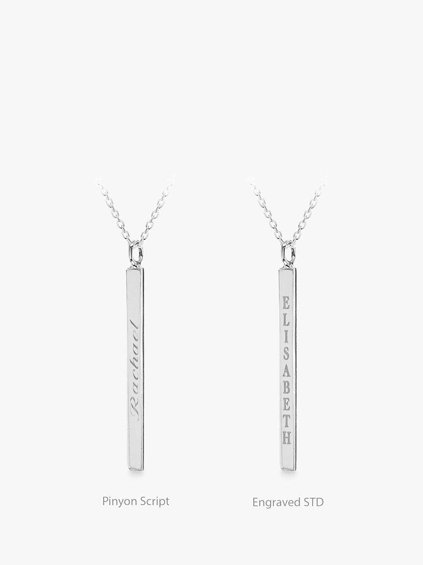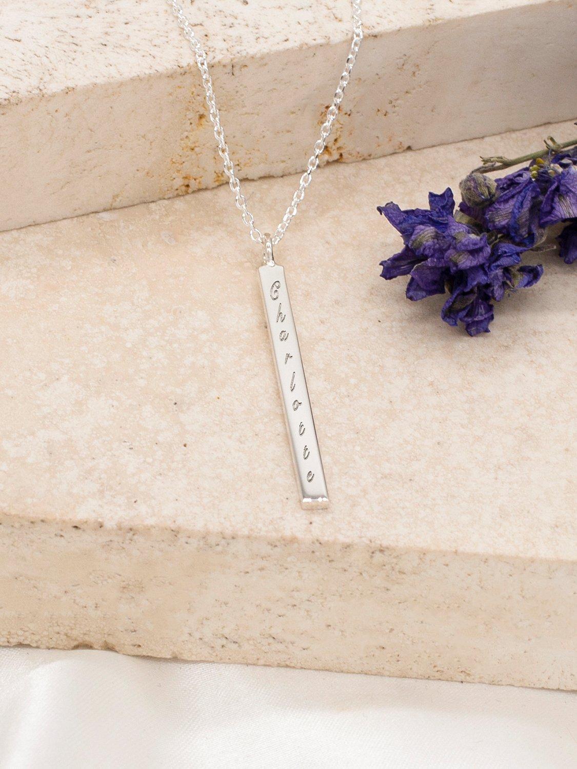 The pretty necklace is made from solid sterling silver and comes in a choice of optional gold-plated finishes. It has a classic link chain with a lobster clasp and an elongated vertical bar pendant. The pendant can carry a very personal message of up to 13 characters in a vertical or horizontal direction and in a choice of fonts.