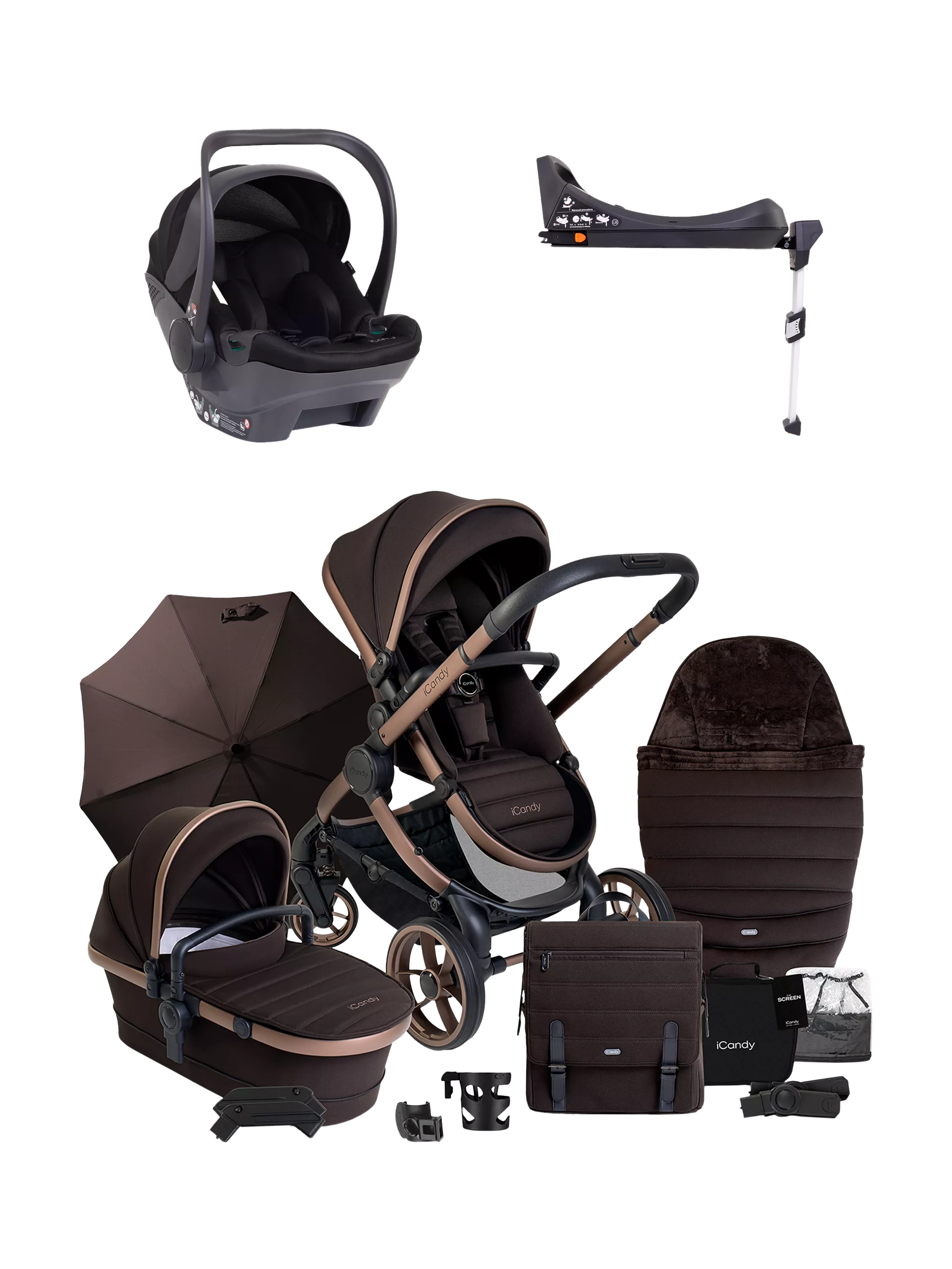 This bundle offers the complete travel system with the complete Peach 7 pushchair and the compatible iCandy Cocoon Car Seat and i-size base. It comes with a complete chassis with a seat unit, a complete carrycot, a rain cover, elevators and car seat adaptors. As well you'll also get handy accessories like a changing bag, Duopod footmuff, parasol, sun shield and cup holder.