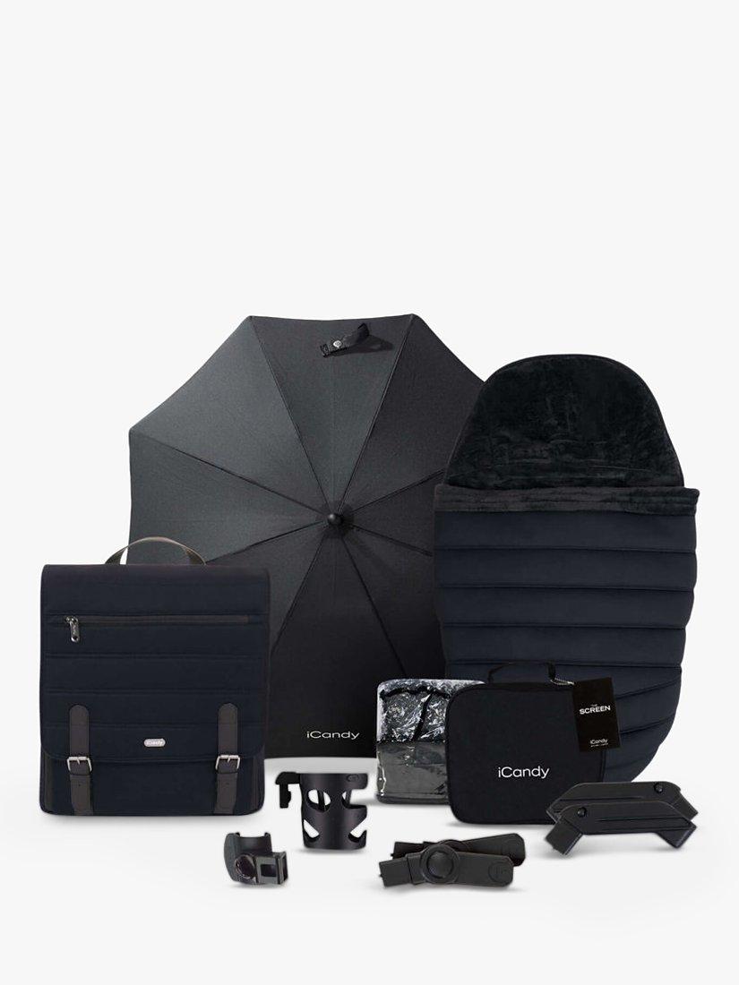 This handy bundle is the full package of stroller and accessories. It includes the Peach 7 stroller, carrycot, car seat adaptors, rain cover and elevators. Additionally, you'll also get some brilliant accessories, including an iCandy changing bag, Duo-Pod, parasol, cup holder, clamp, and sunshade.