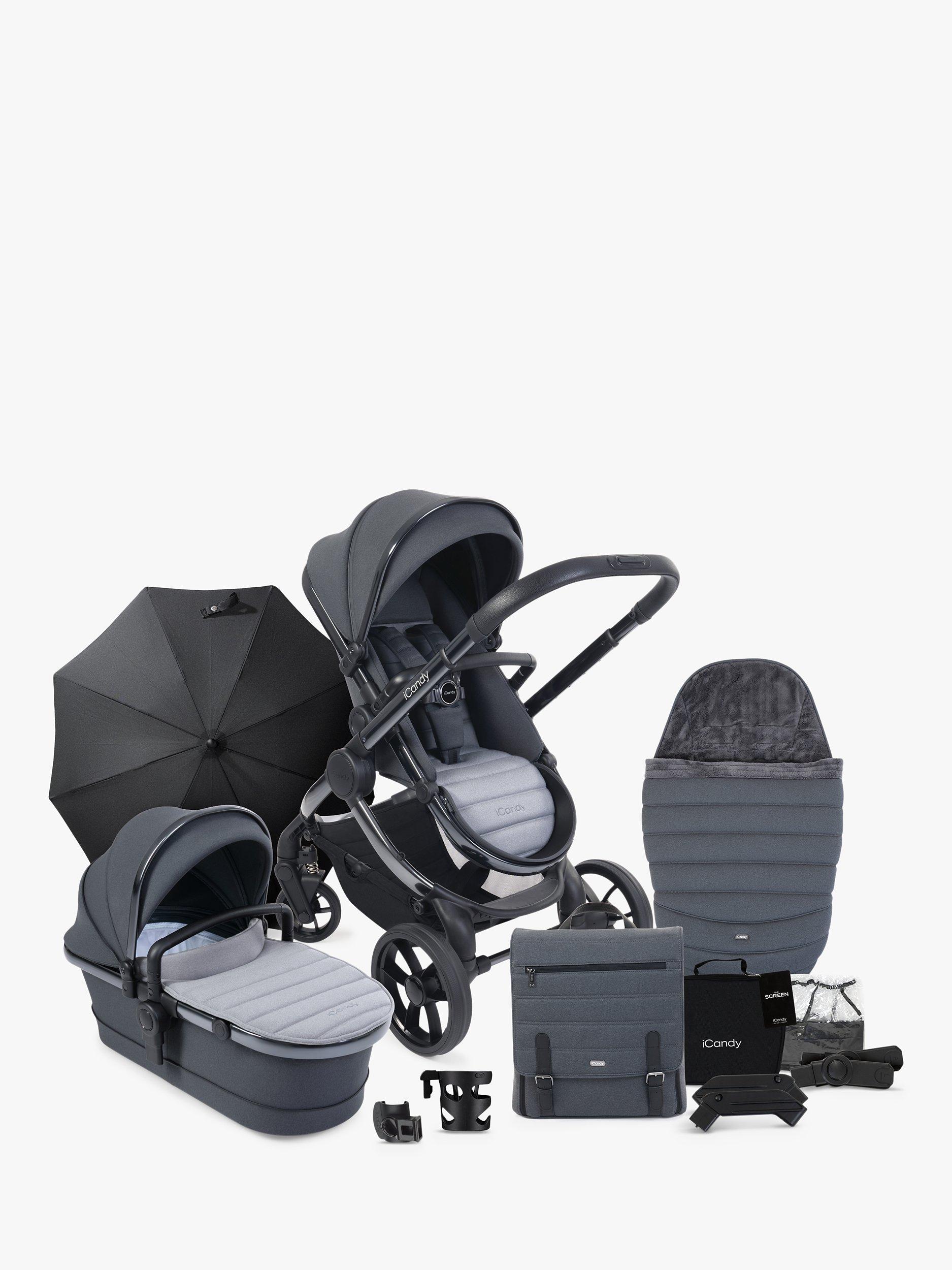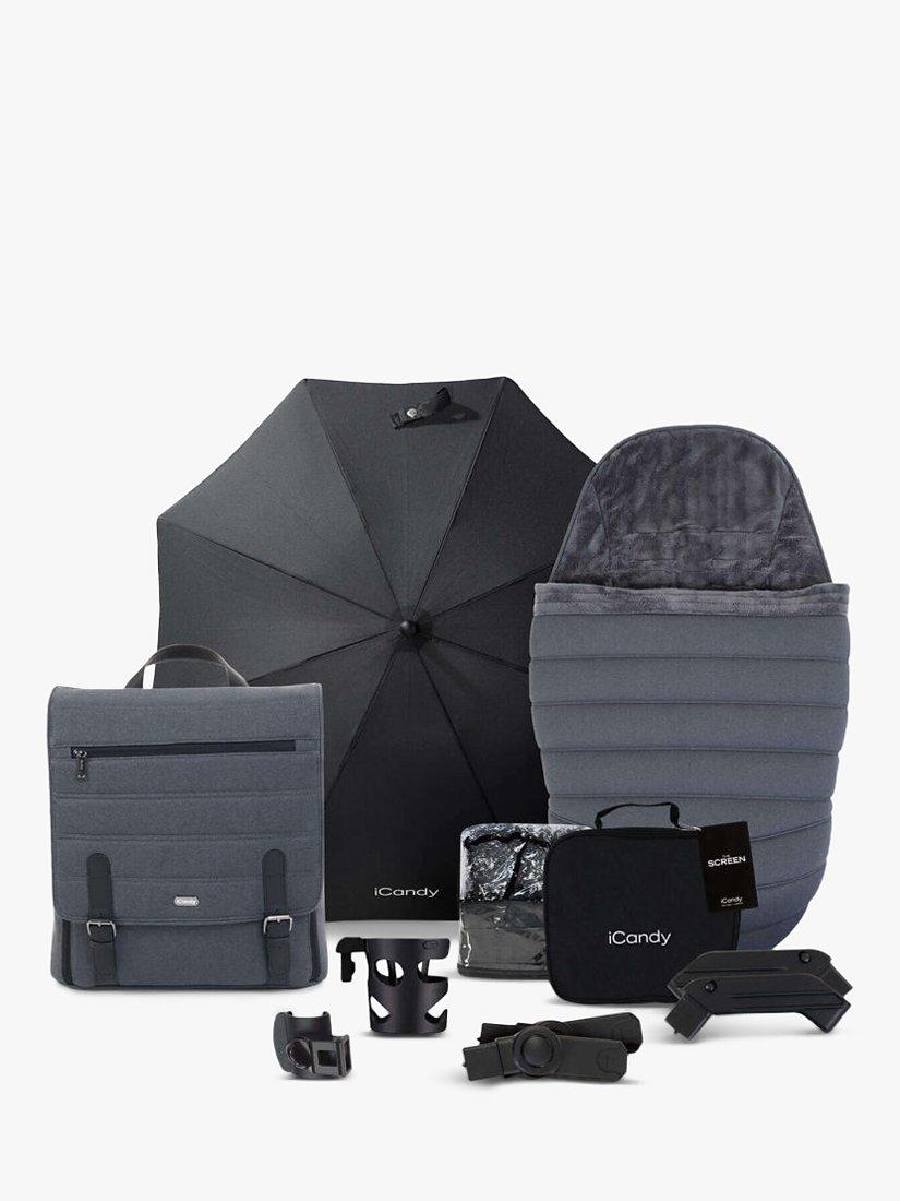 This handy bundle is the full package of stroller and accessories. It includes the Peach 7 stroller, carrycot, car seat adaptors, rain cover and elevators. Additionally, you'll also get some brilliant accessories, including an iCandy changing bag, Duo-Pod, parasol, cup holder, clamp, and sunshade.