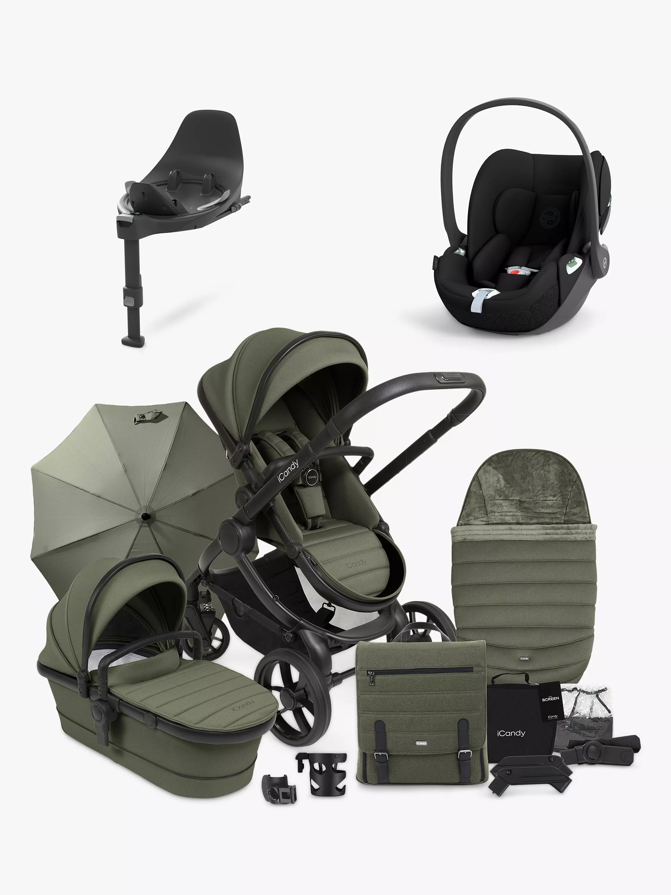 This bundle is the full package of the iCandy Peach stroller and accessories. It includes the Peach 7 stroller, a Cybex Cloud T baby car seat and base, carrycot, car seat adaptors, rain cover and elevators. Additionally, you'll also get some brilliant accessories including an iCandy changing bag, Duo-Pod, parasol, cup holder, clamp and sunshade.