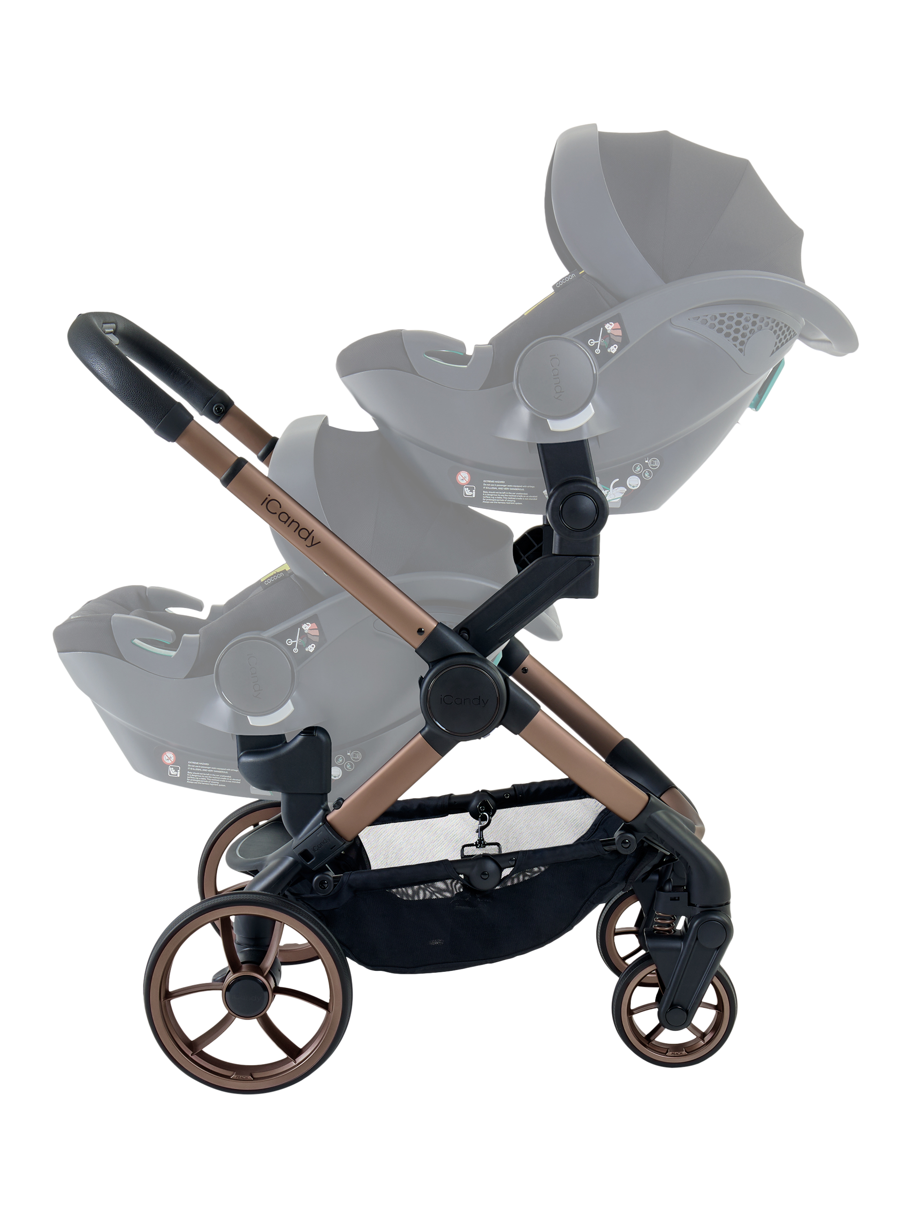 This complete bundle comes with a complete chassis with 2 seat units, 2 complete carrycots, a converter frame with hood and adaptors, elevators and upper and lower car seat adaptors. In addition, you'll get some great accessories like 2 rain covers, 2 footmuffs, 2 parasols, 2 sunscreens, the iCandy changing bag which includes a mat and bottle cooler and a cup holder