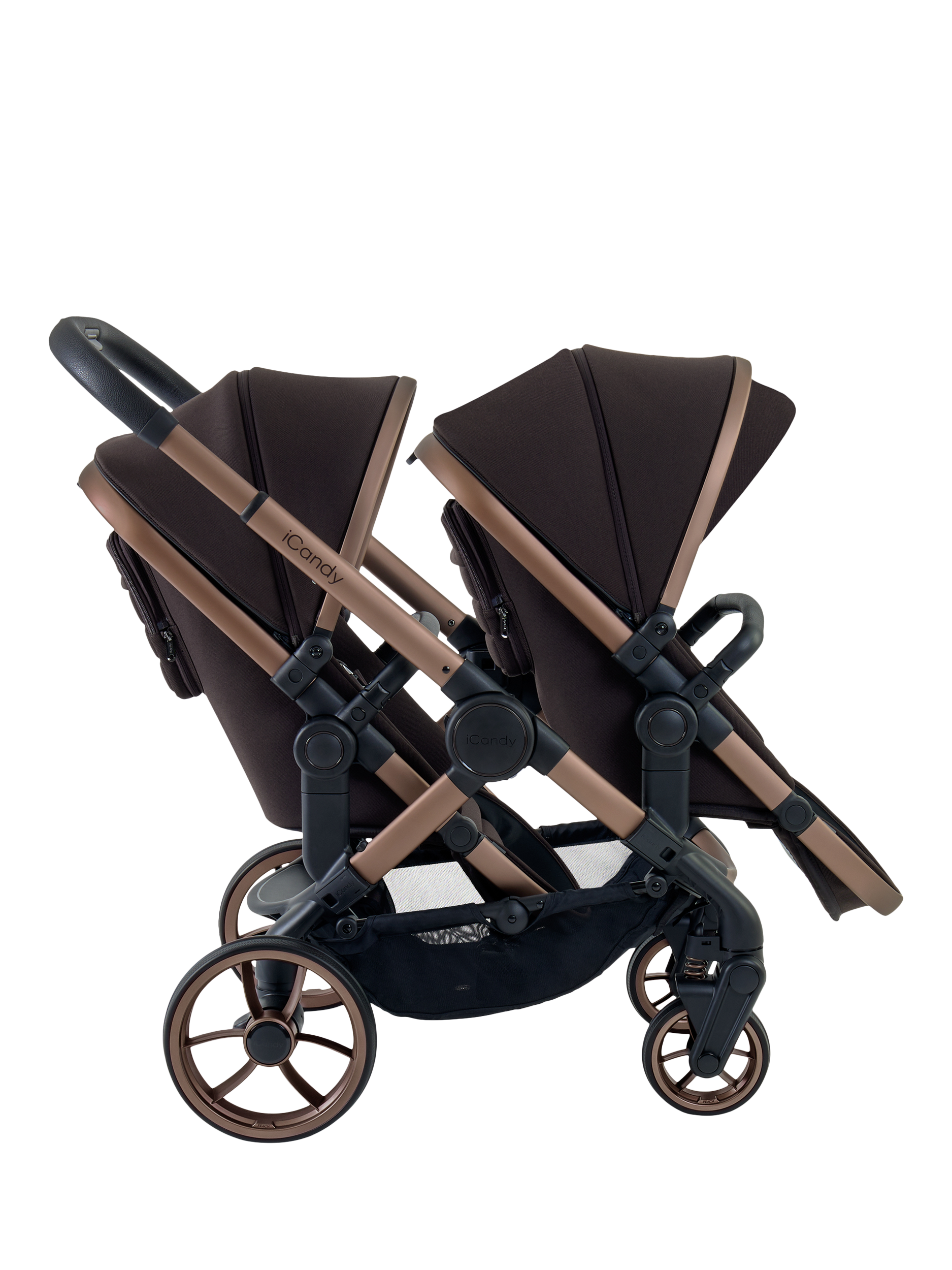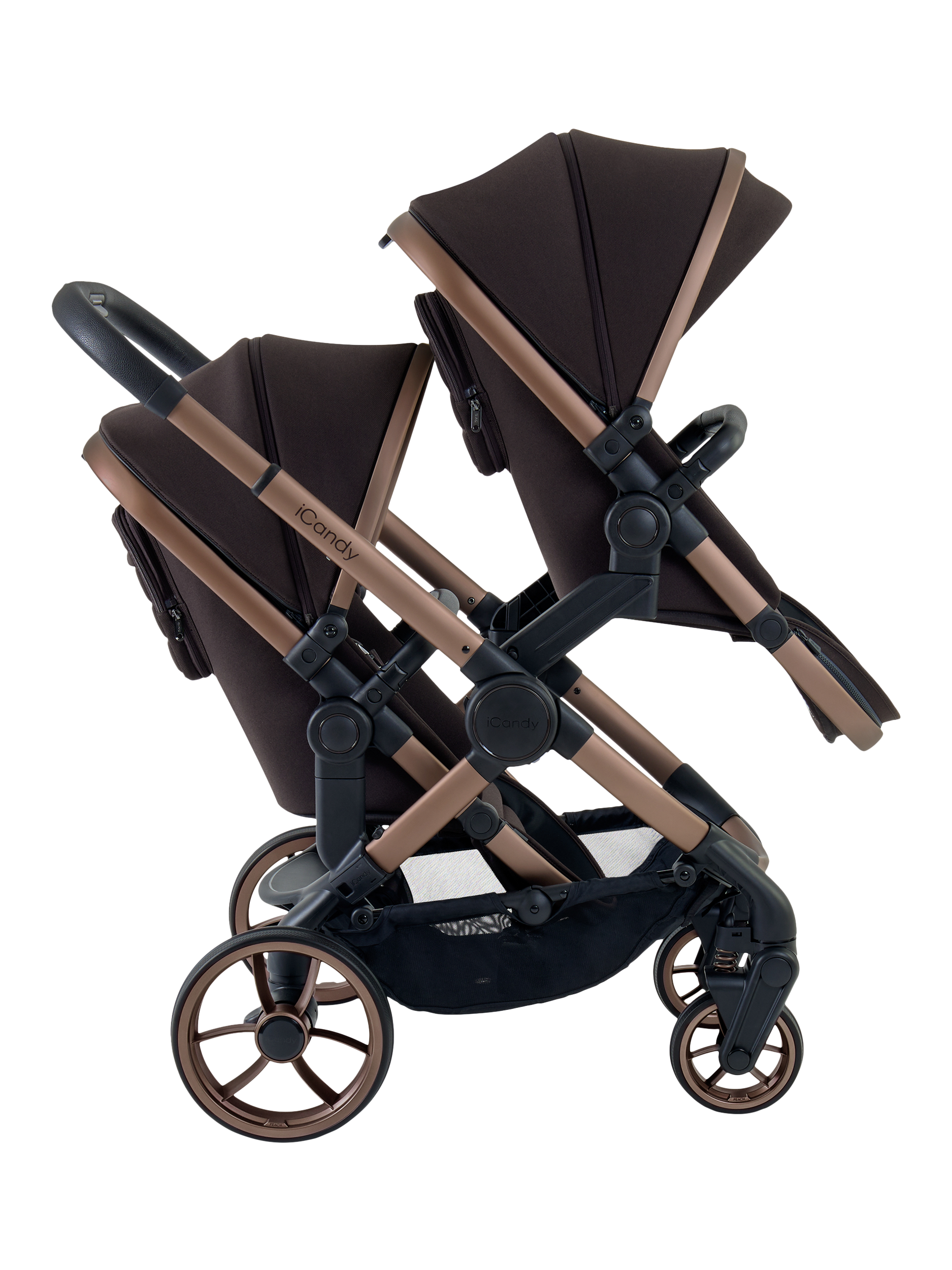 Great for growing families, the iCandy Peach Twin is a sophisticated travel system that takes two babies or toddlers from birth to 15kg. It easily converts from single to double within a single footprint. It allows parents to use it from birth with two Carrycot or two Infant Carriers. As Babies grows it easily converts to take two seat units in a range of configurations.