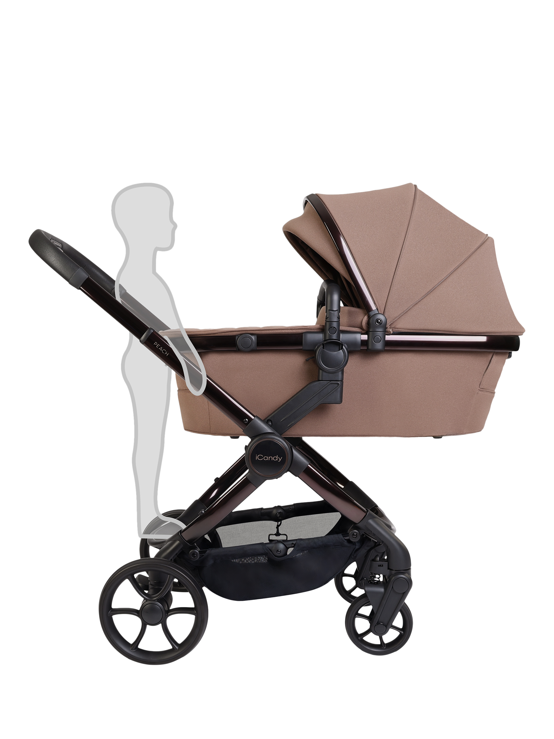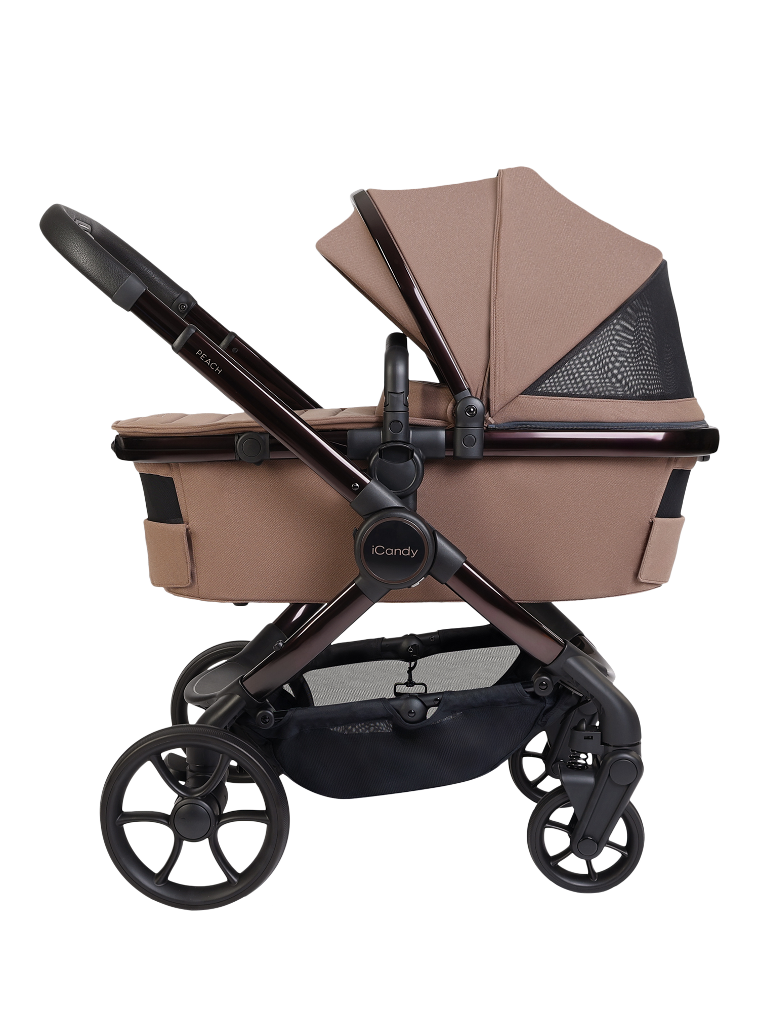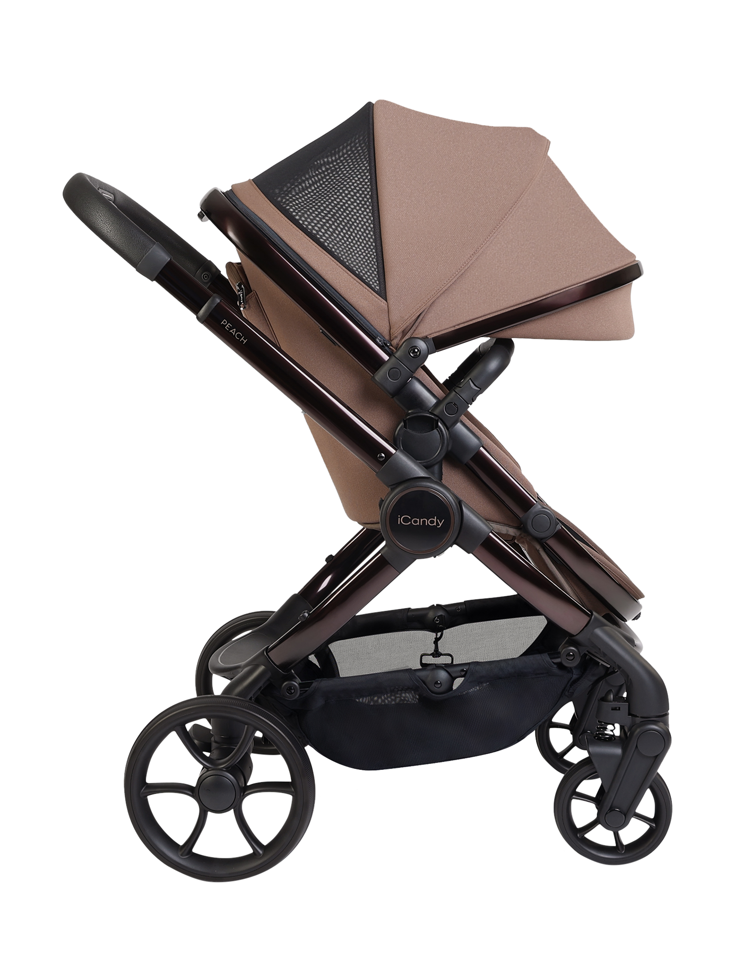 Peach 8 features a collapsible, highly ventilated carrycot (over double the airflow compared to Peach 7) approved by The Lullaby Trust for permanent overnight sleeping, enhanced suspension, single-to-double or twin conversion, one-handed fold and recline, integrated Ride-on Board, 10kg basket and iCandy MiStand compatibility.