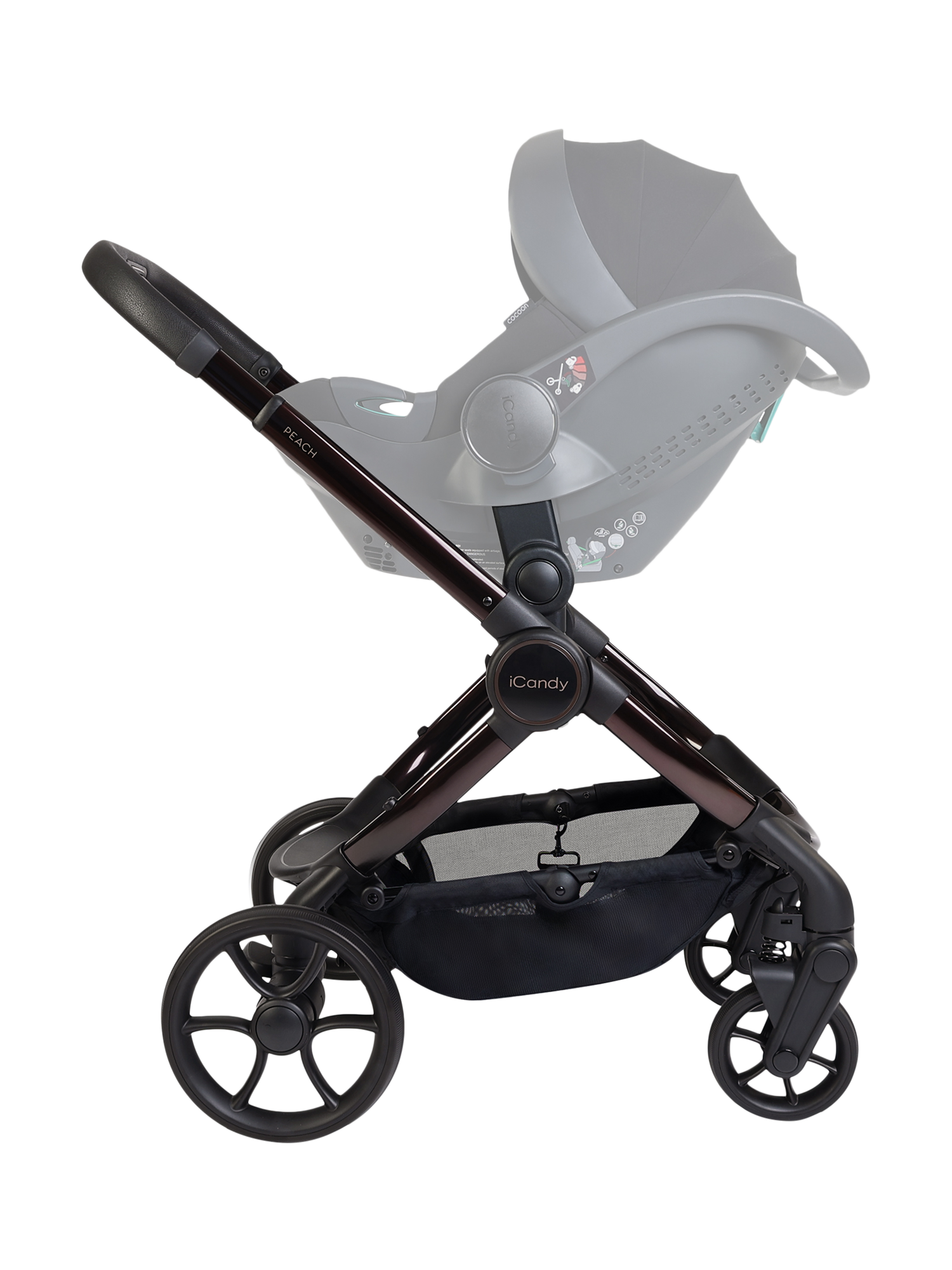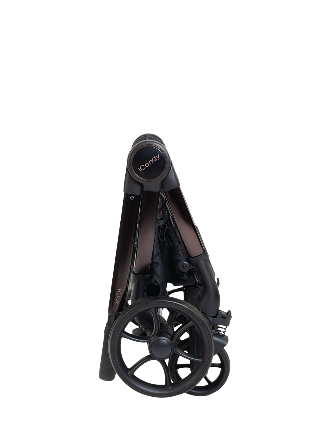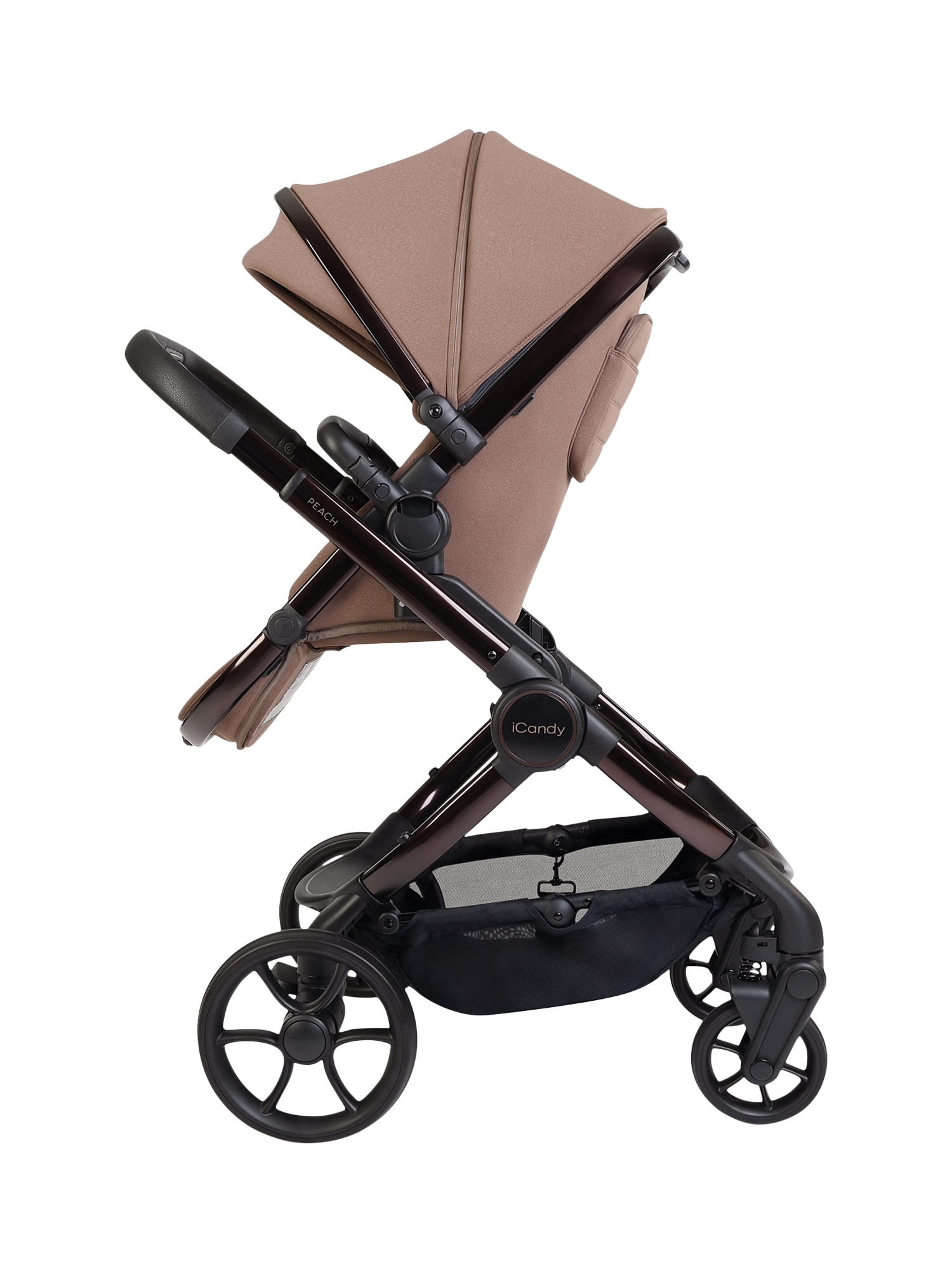Peach 8 features a collapsible, highly ventilated carrycot (over double the airflow compared to Peach 7) approved by The Lullaby Trust for permanent overnight sleeping, enhanced suspension, single-to-double or twin conversion, one-handed fold and recline, integrated Ride-on Board, 10kg basket and iCandy MiStand compatibility.