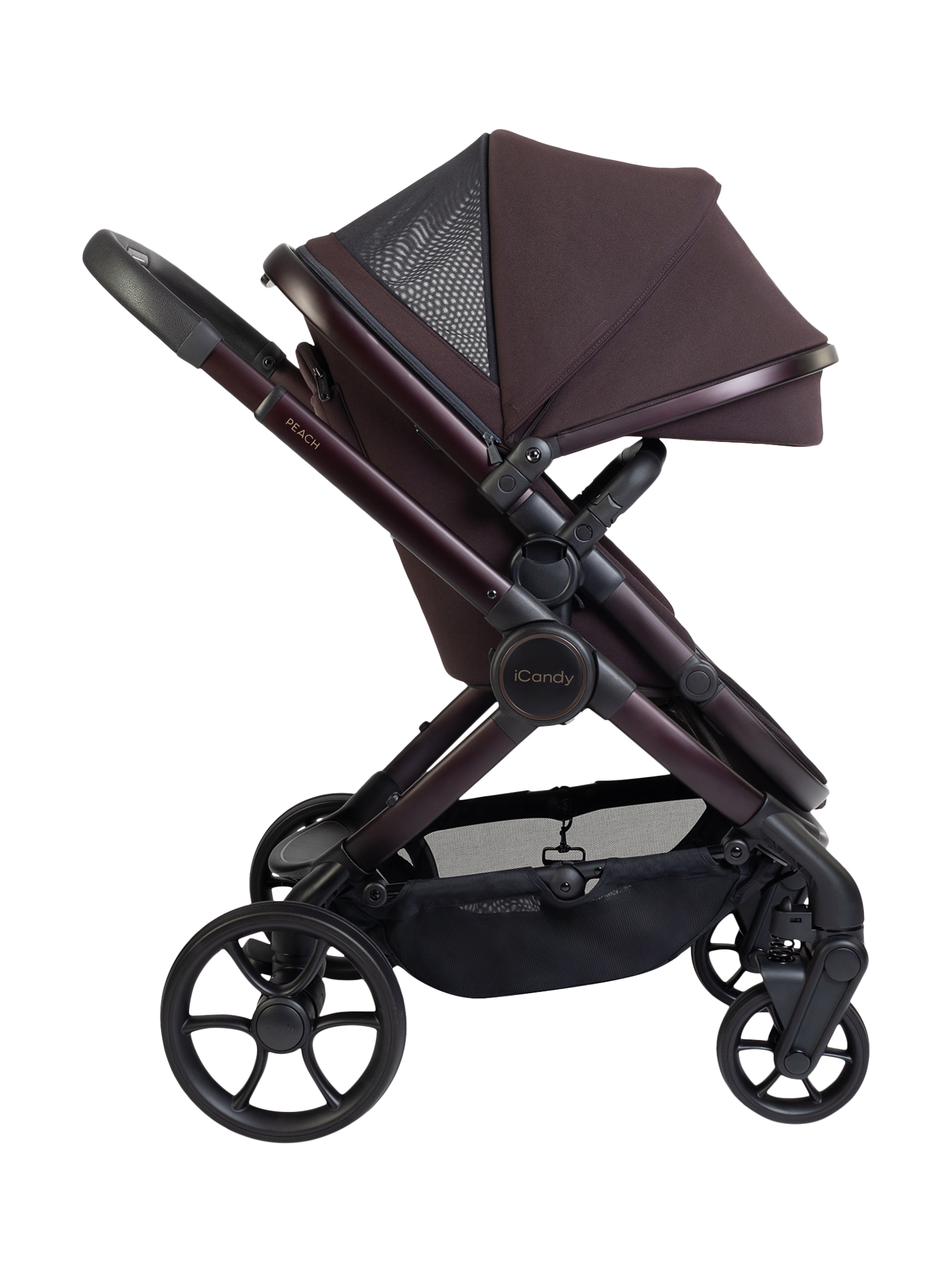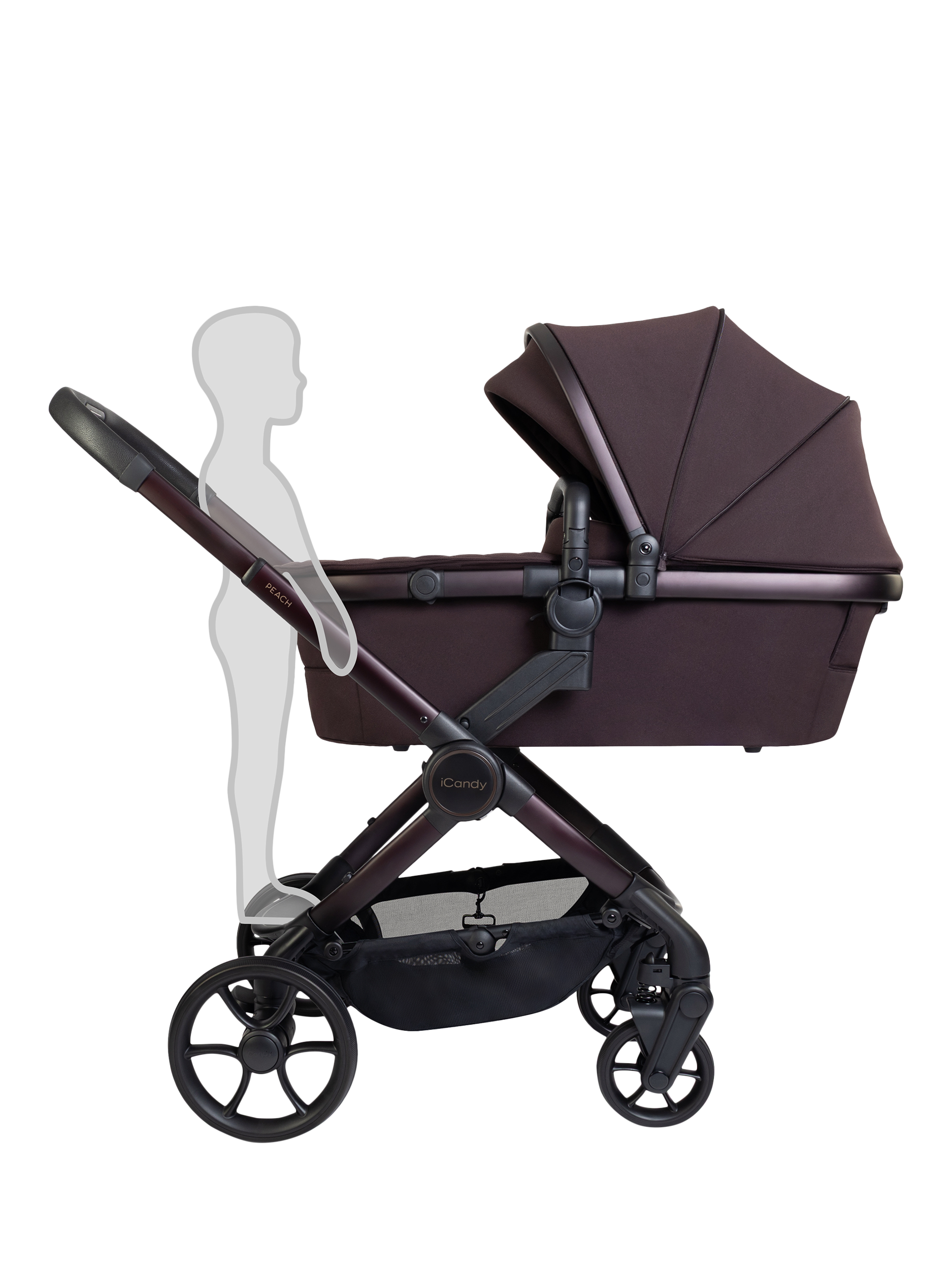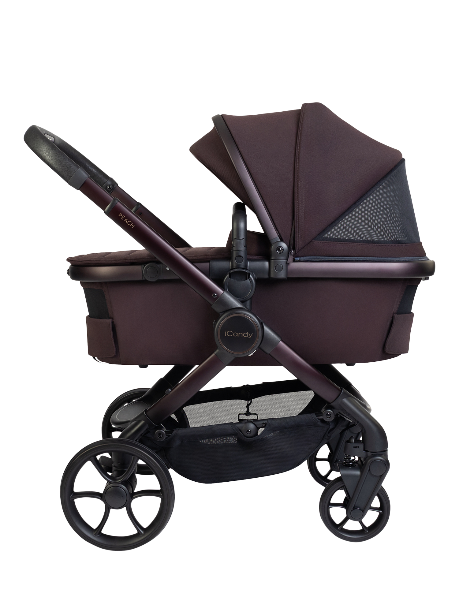 Peach 8 features a collapsible, highly ventilated carrycot (over double the airflow compared to Peach 7) approved by The Lullaby Trust for permanent overnight sleeping, enhanced suspension, single-to-double or twin conversion, one-handed fold and recline, integrated Ride-on Board, 10kg basket and iCandy MiStand compatibility.