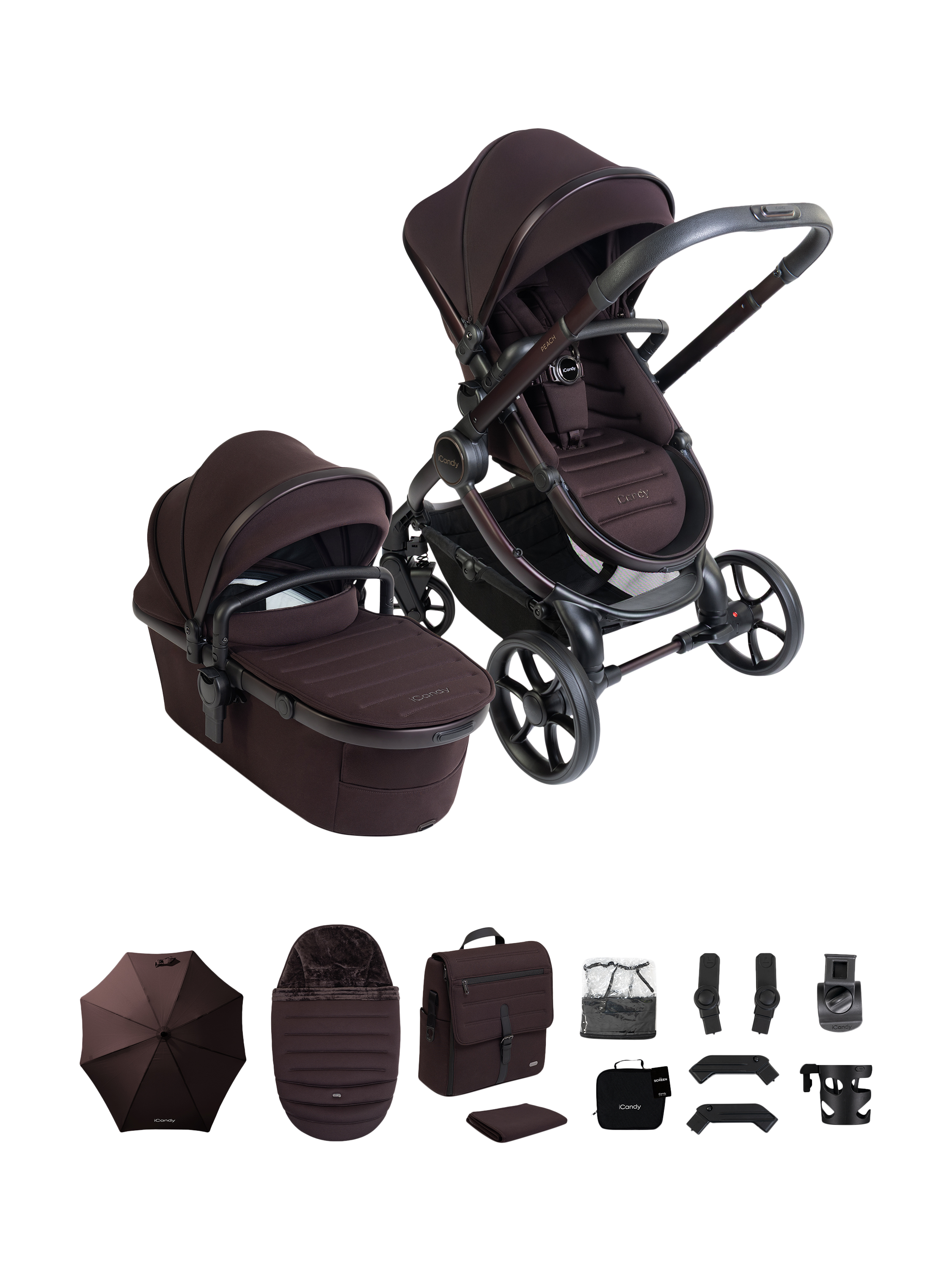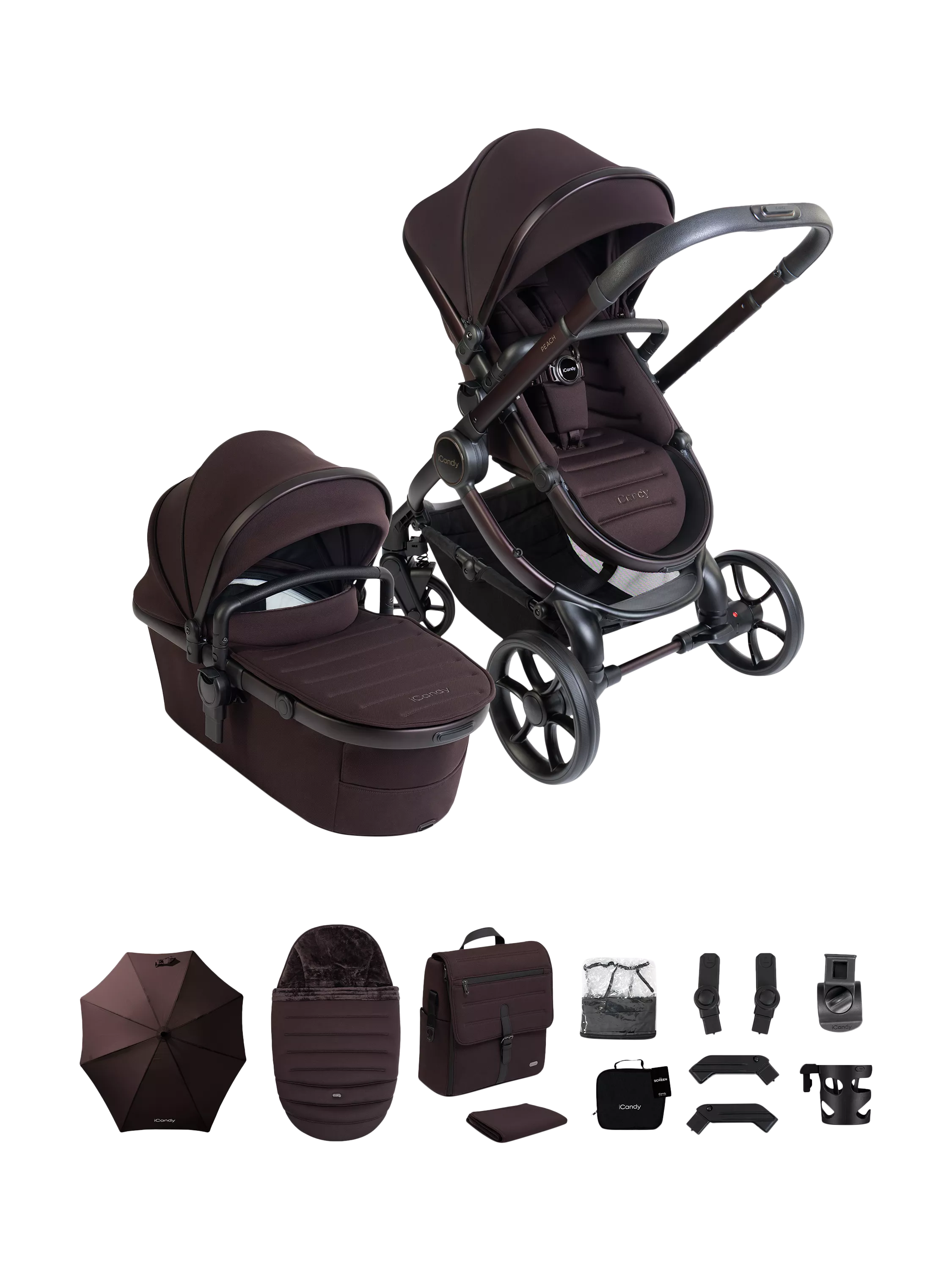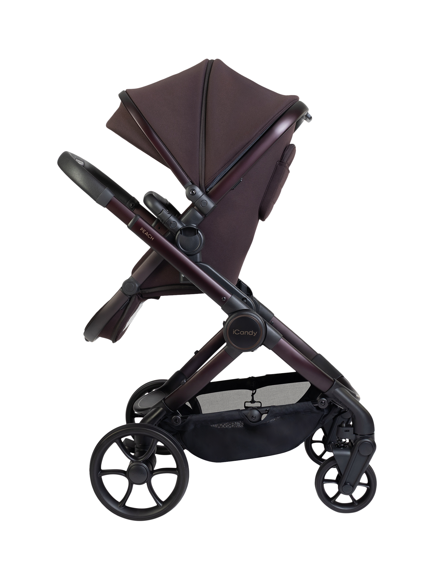 Peach 8 features a collapsible, highly ventilated carrycot (over double the airflow compared to Peach 7) approved by The Lullaby Trust for permanent overnight sleeping, enhanced suspension, single-to-double or twin conversion, one-handed fold and recline, integrated Ride-on Board, 10kg basket and iCandy MiStand compatibility.