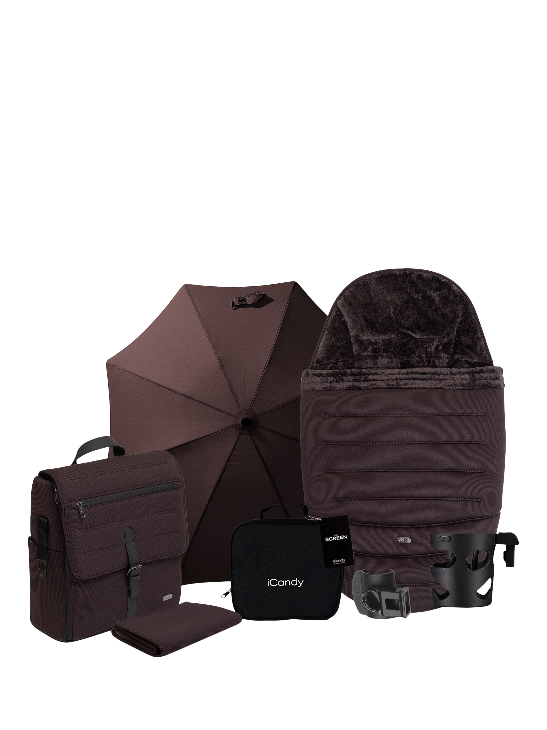 - Chassis (including wheels), Seat Unit/Carrycot Frame, Seat Unit Fabric, Carrycot Fabric, Canopy Hood Frame and Fabric, Raincover, Screen, Elevator Adaptors, Car Seat Adaptors, Footmuff & Liner, Changing Bag, Parasol, Cup Holder, Clamp