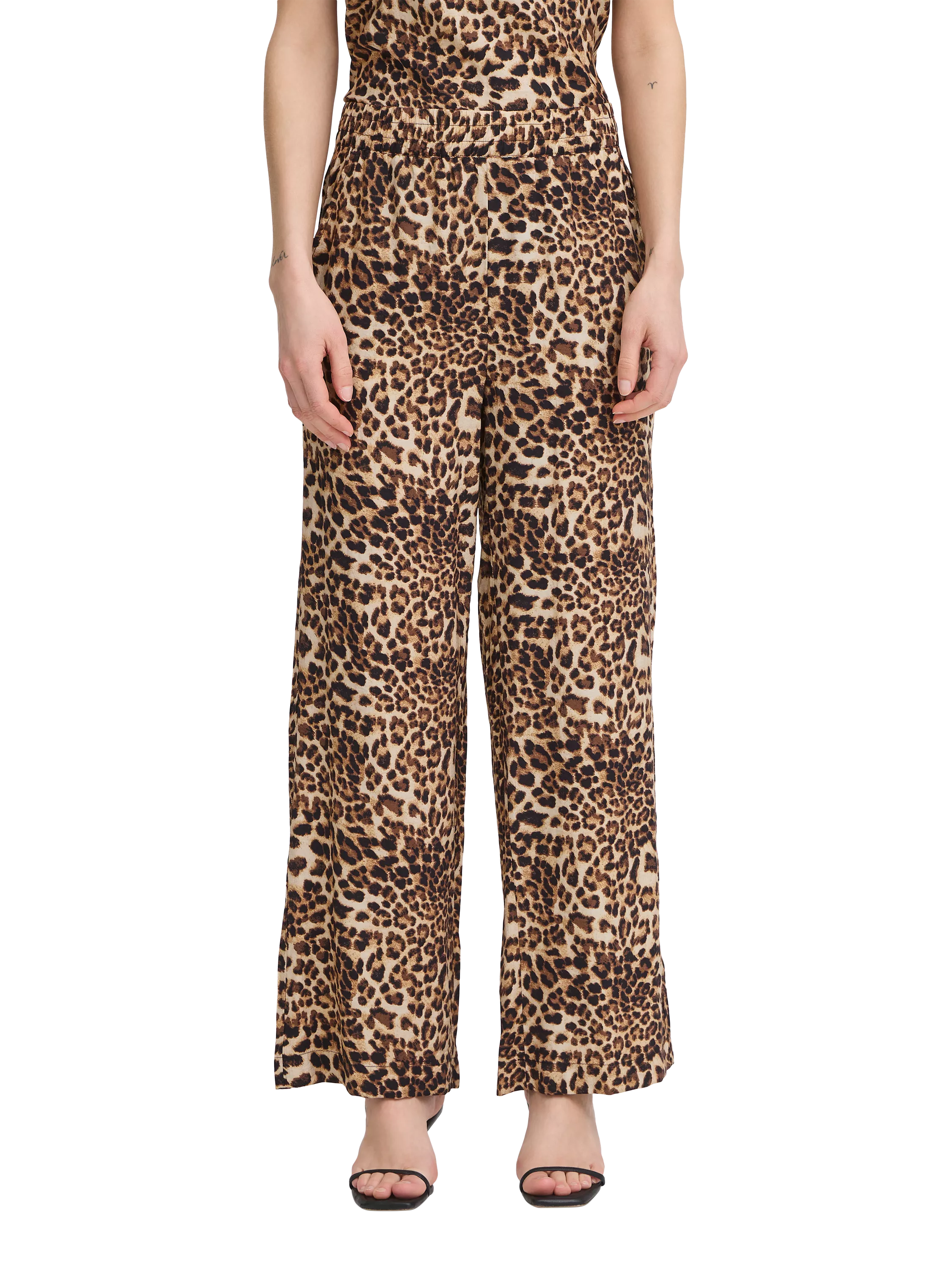 A tailored take on the of-the-moment wide leg trousers from ICHI. This style is cut to sit mid rise with all-over animal print and hems that fall to a regular length.