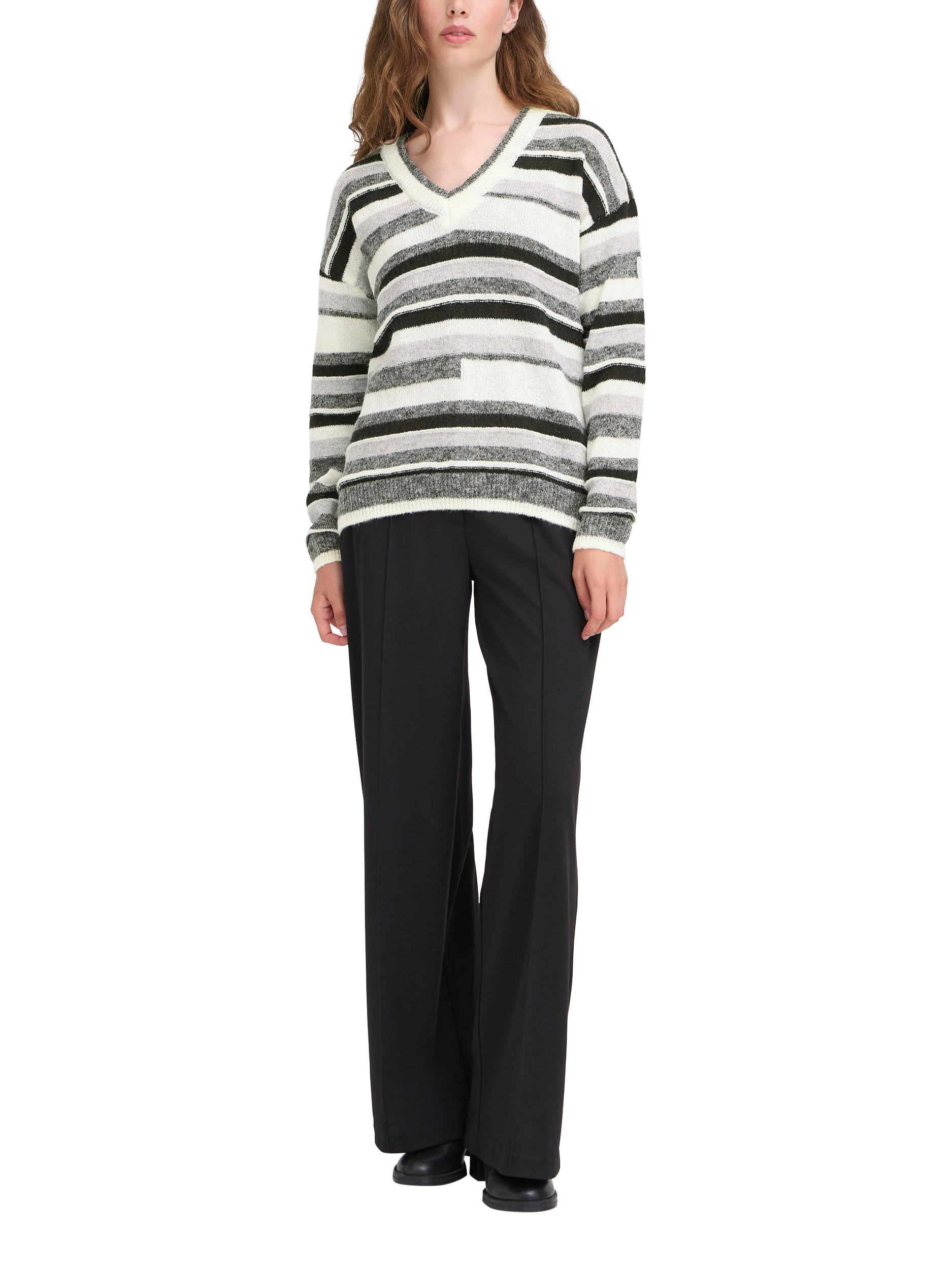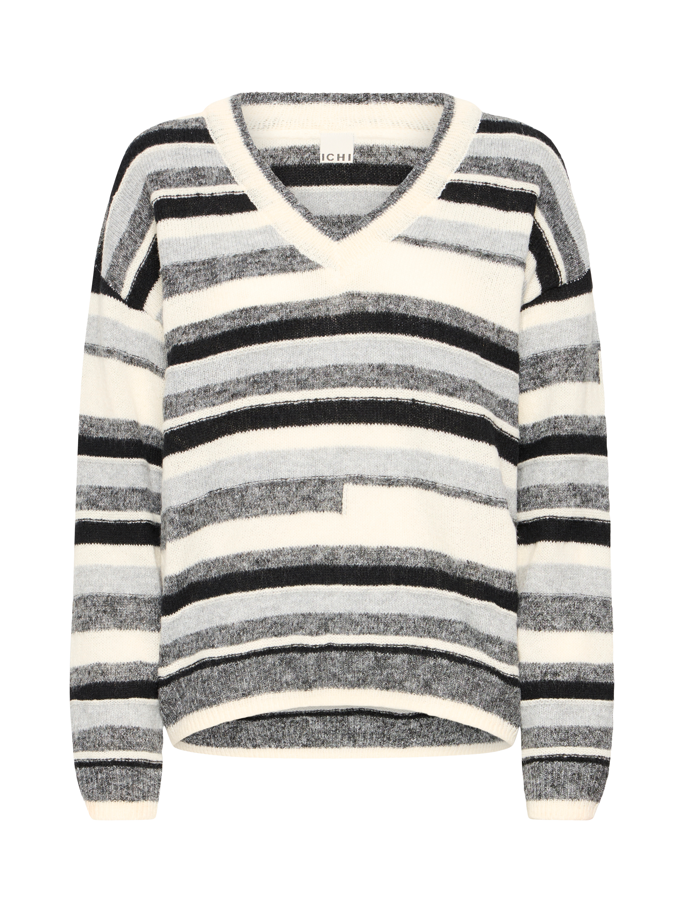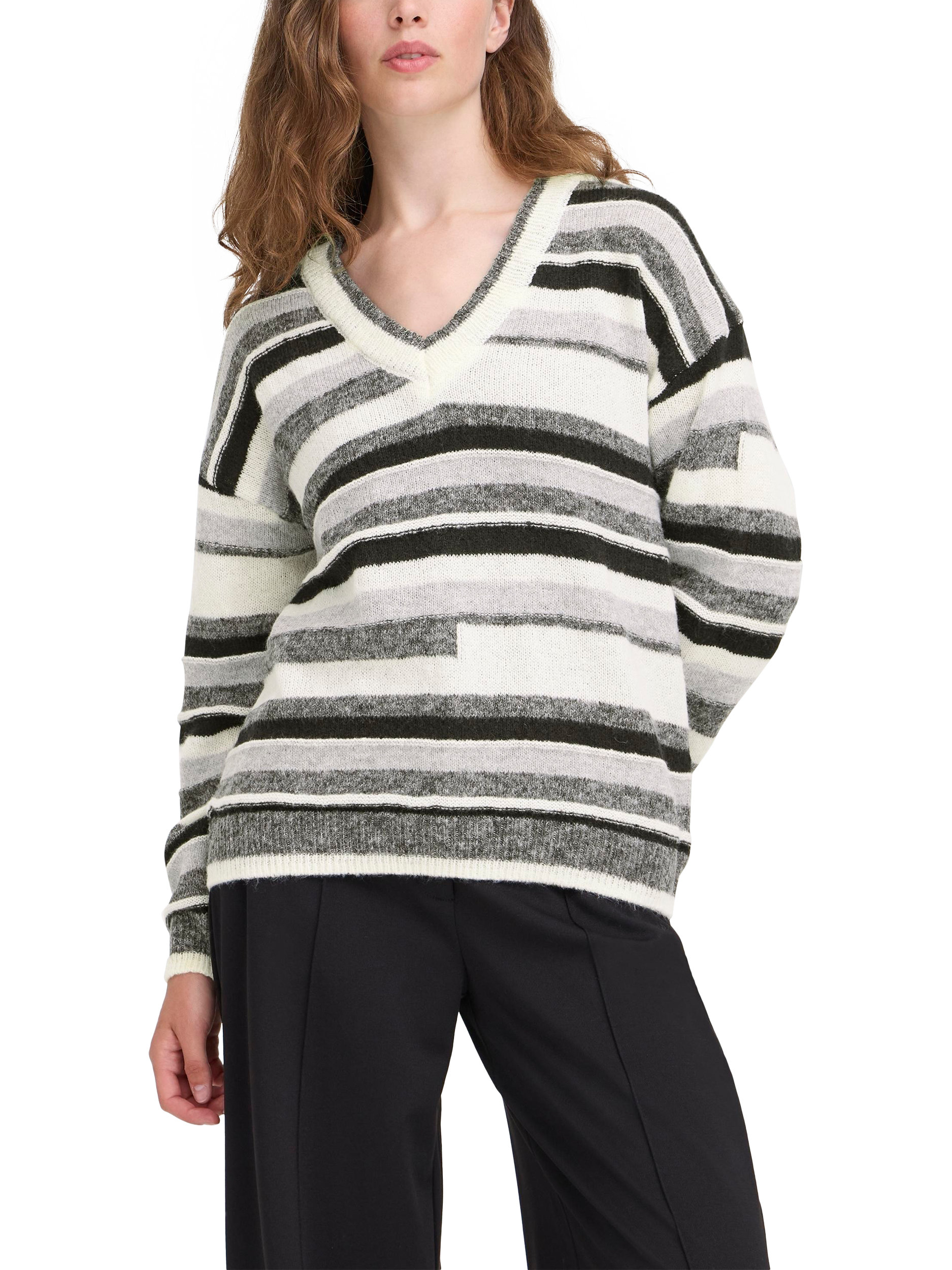 ICHI’s striped jumper. Its V-neck and comfortable fit welcome every moment, whether you are heading out or staying in. Elevate any day by pairing it easily with work or weekend looks.