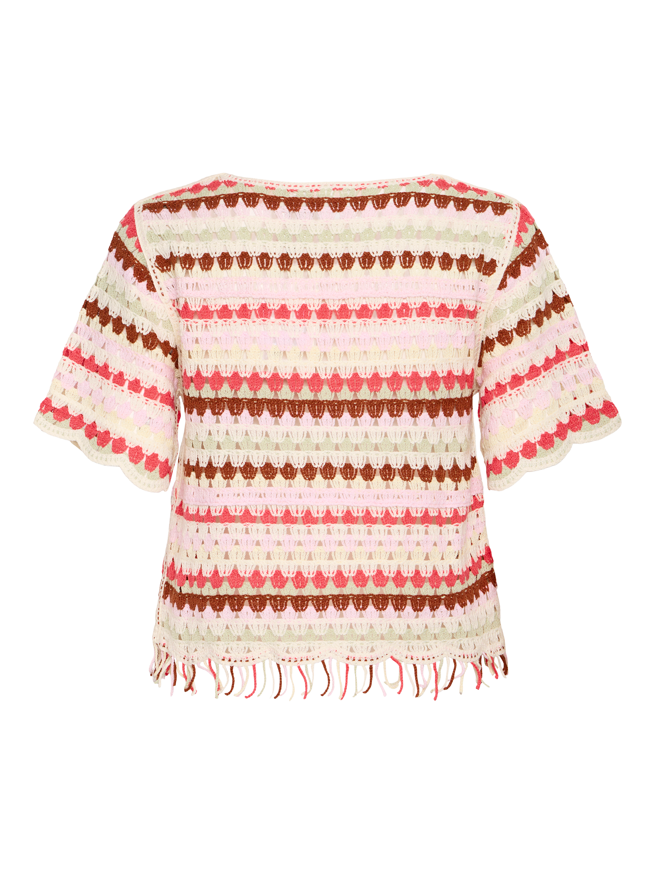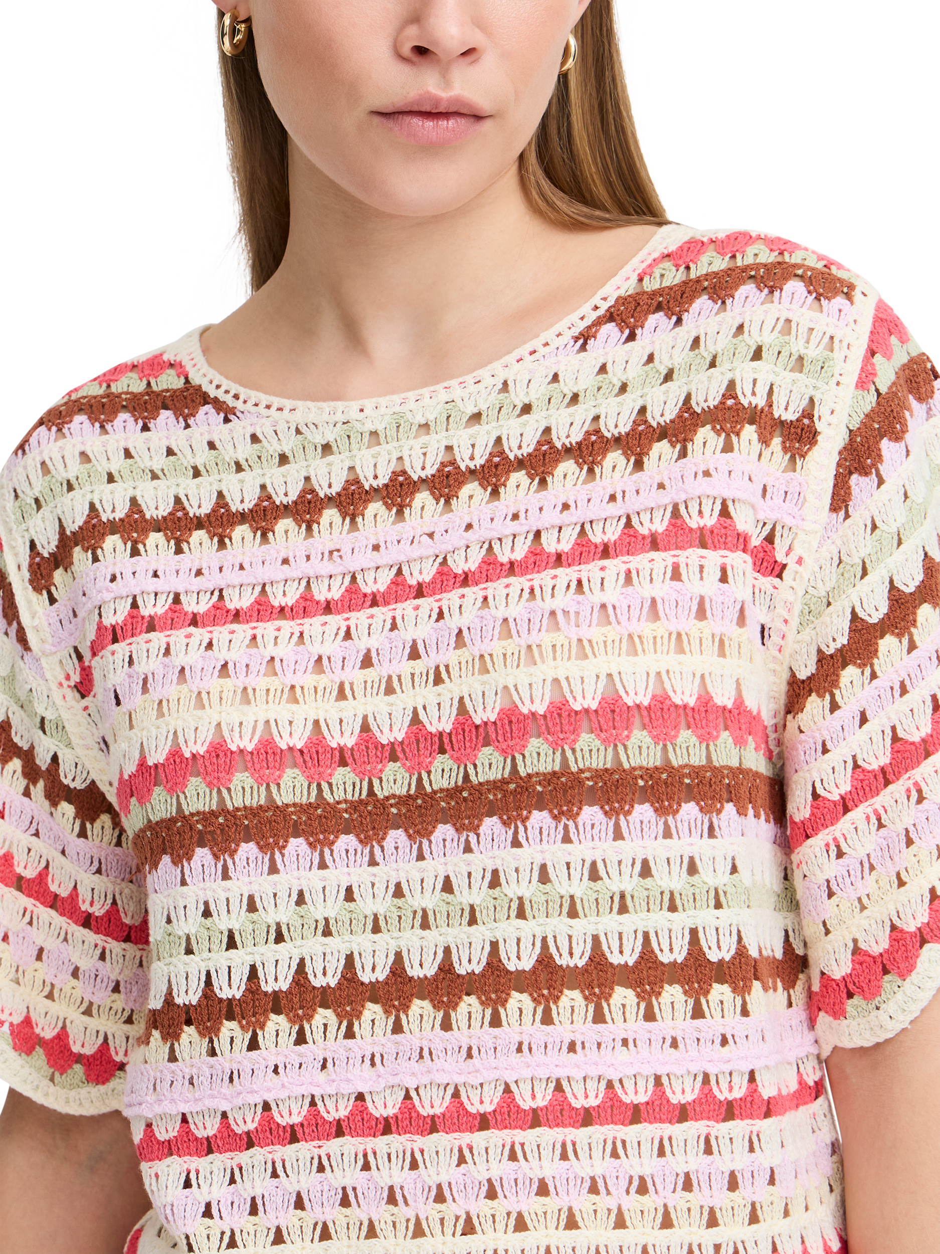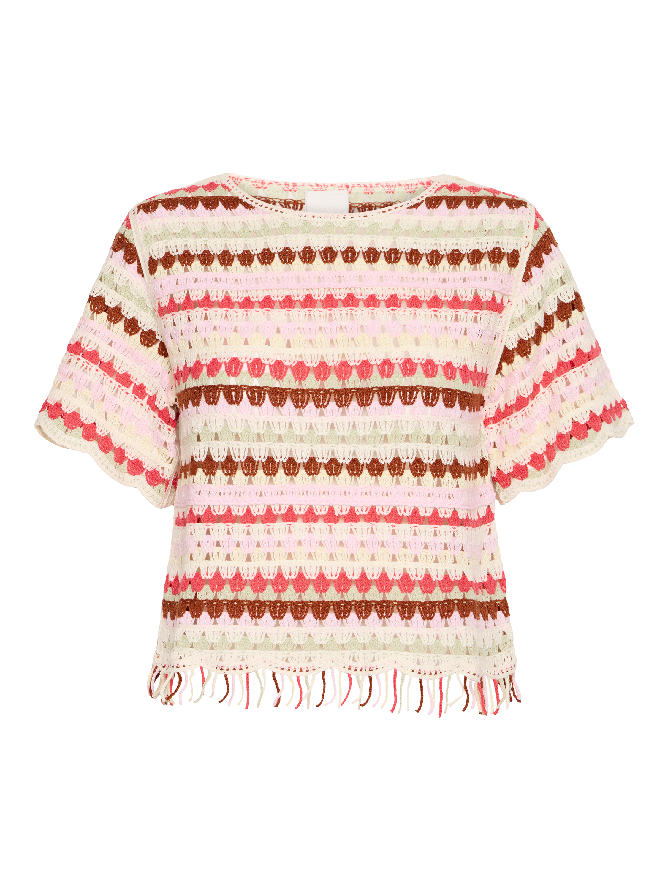 Nice and simple with a round neckline and short sleeves, this stripe crochet jumper by ICHI is whipped up from a cotton-blend fabric for its soft and long-lasting qualities.