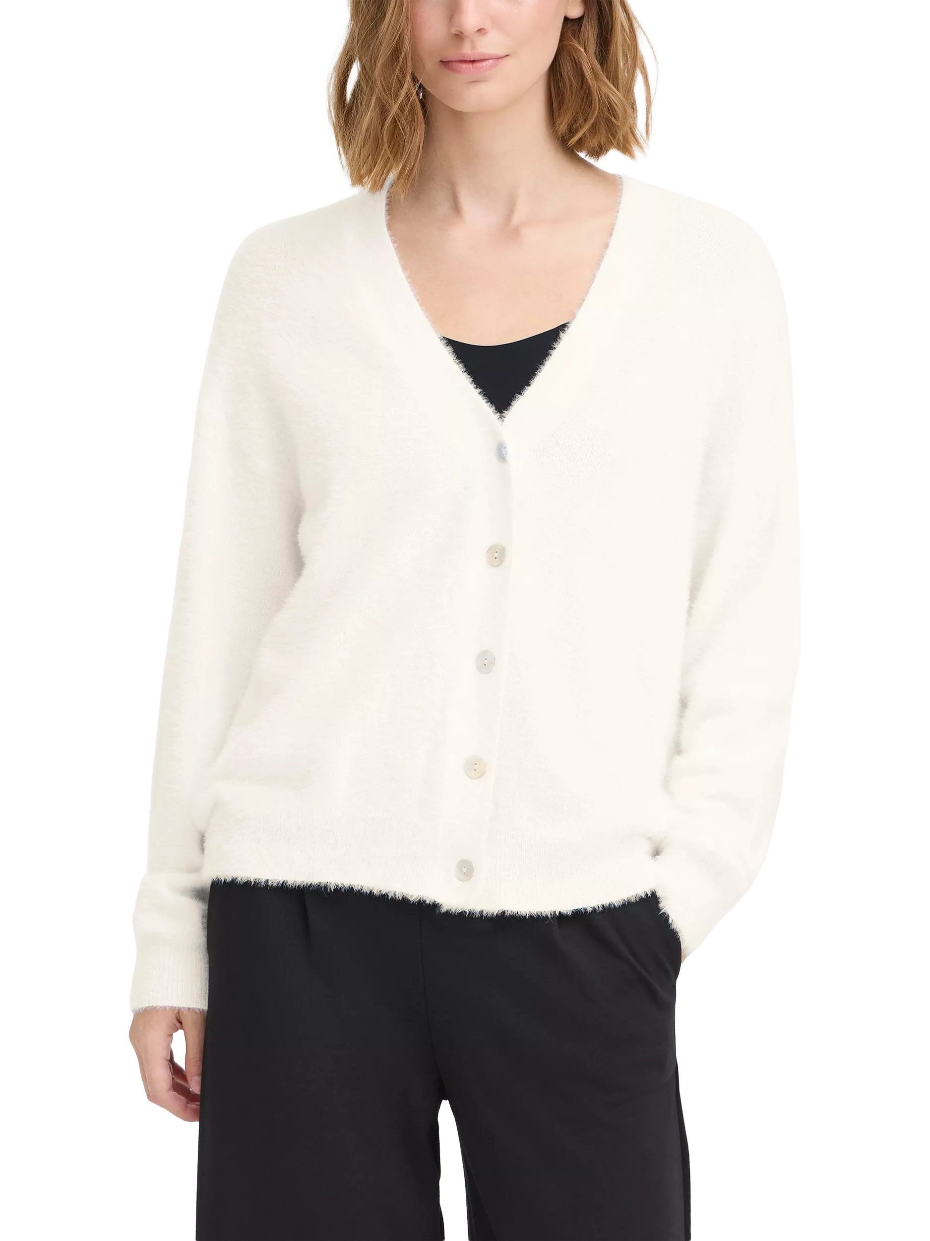 Slip on this ICHI cardigan for easy warmth and smart layering. The V-neck and button closure offer a flexible fit, while its medium weight delivers comfortable coverage for everyday moments.