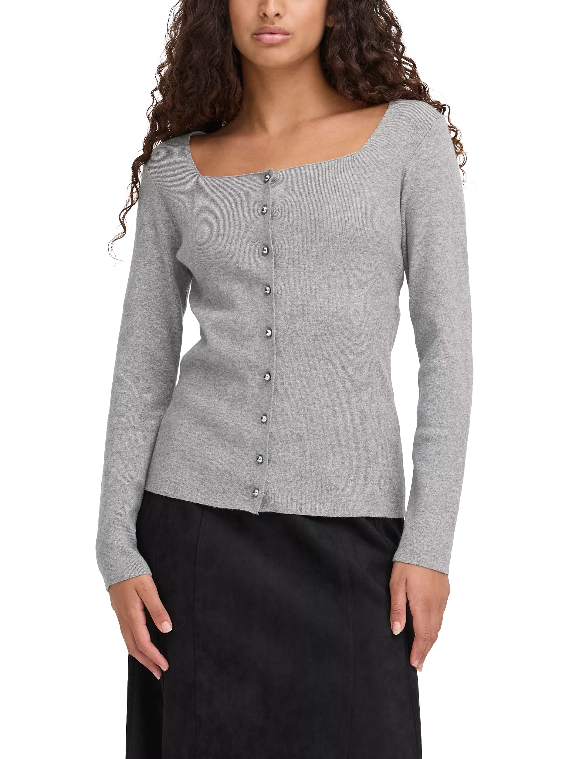 Layer up with this ICHI cardigan. Its clever button fastening and square neck add style and comfort, making it easy for you to dress up or down. Soft, medium-weight knit brings year-round versatility to your wardrobe.