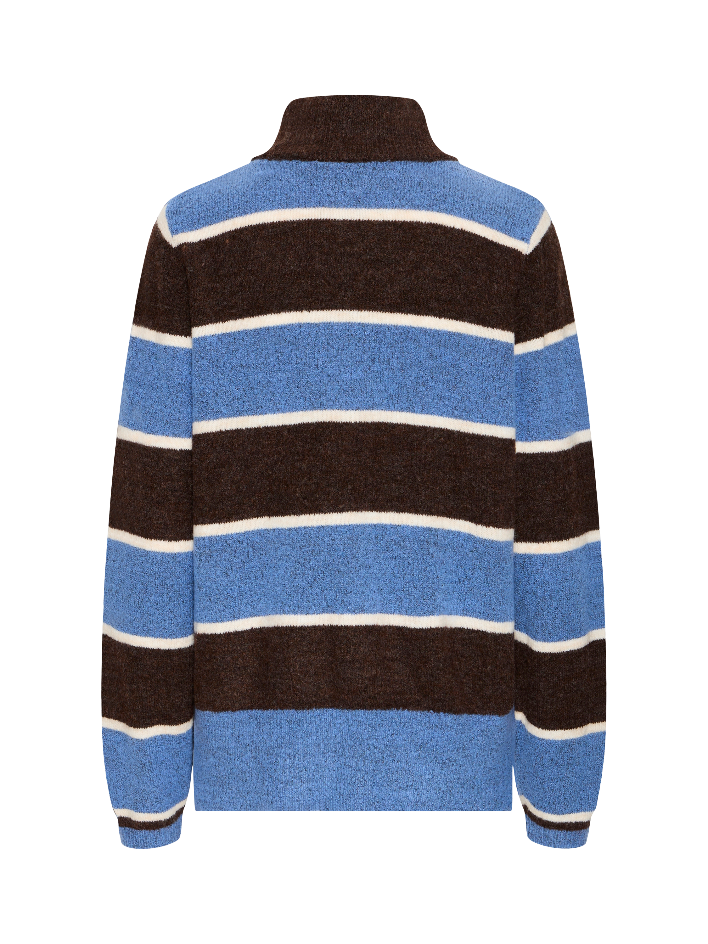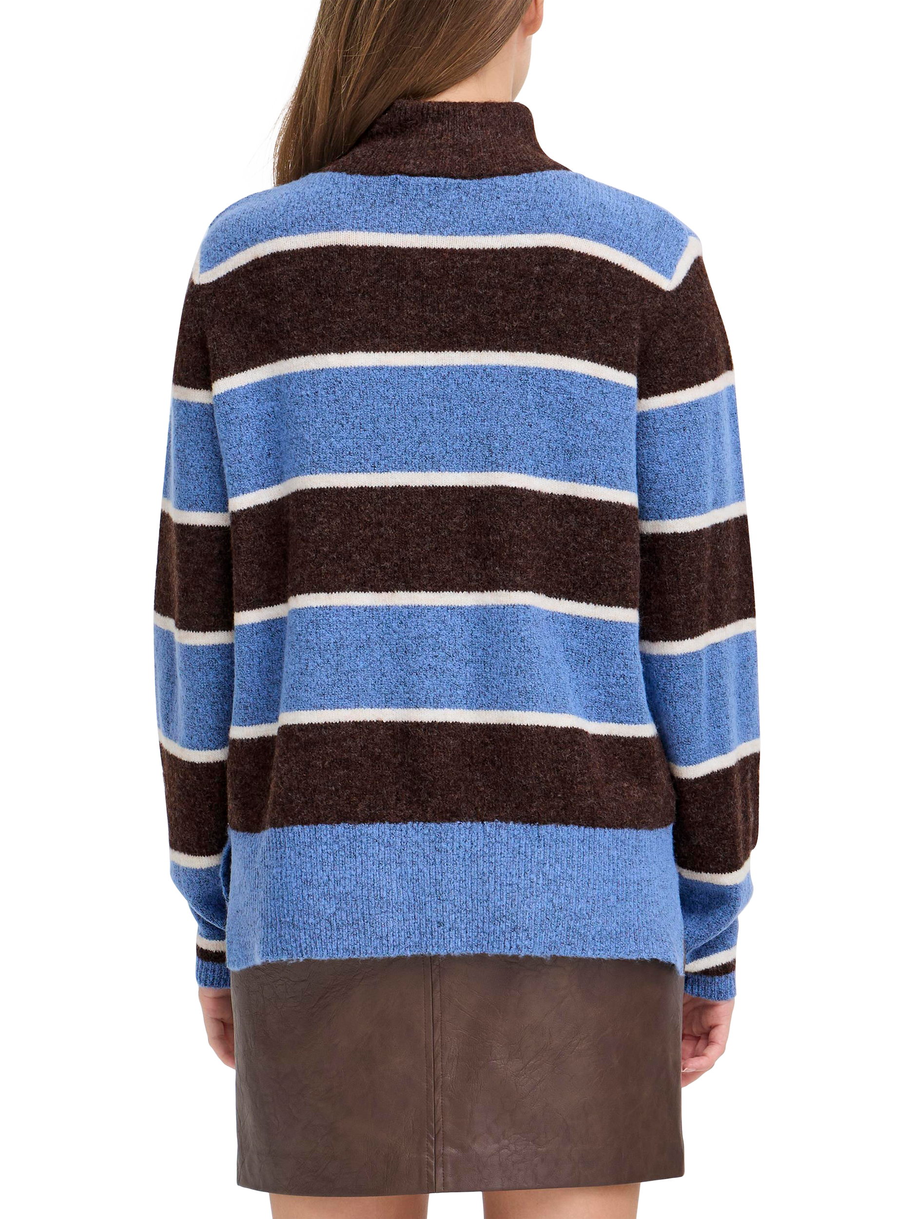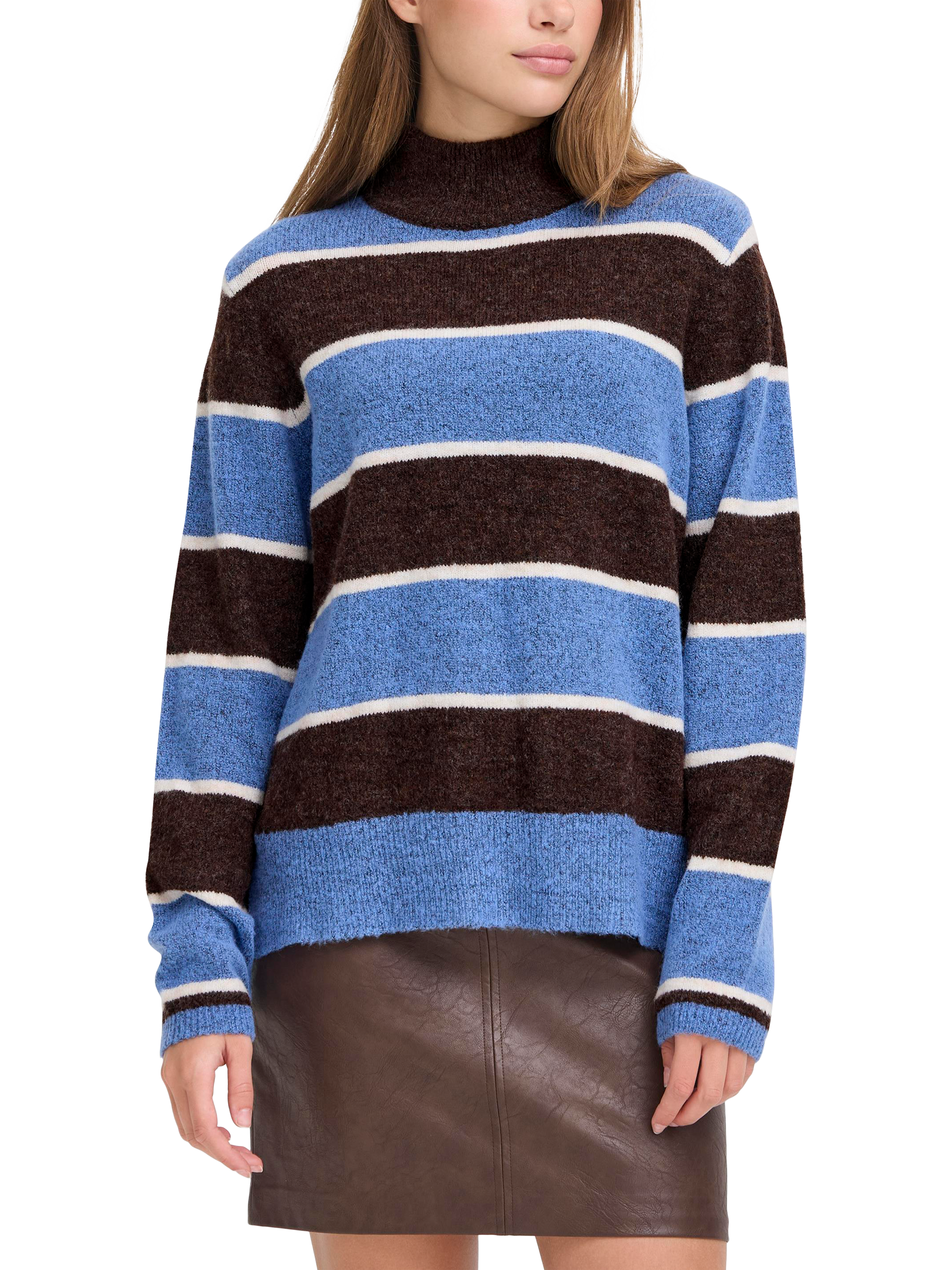 A stripe jumper from ICHI. The high neck and medium weight design are perfect for cooler days, keeping you cosy and confident wherever your plans take you.