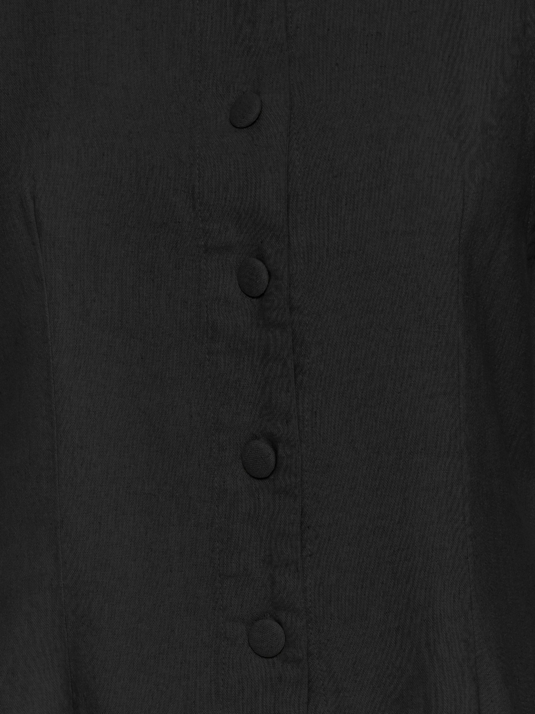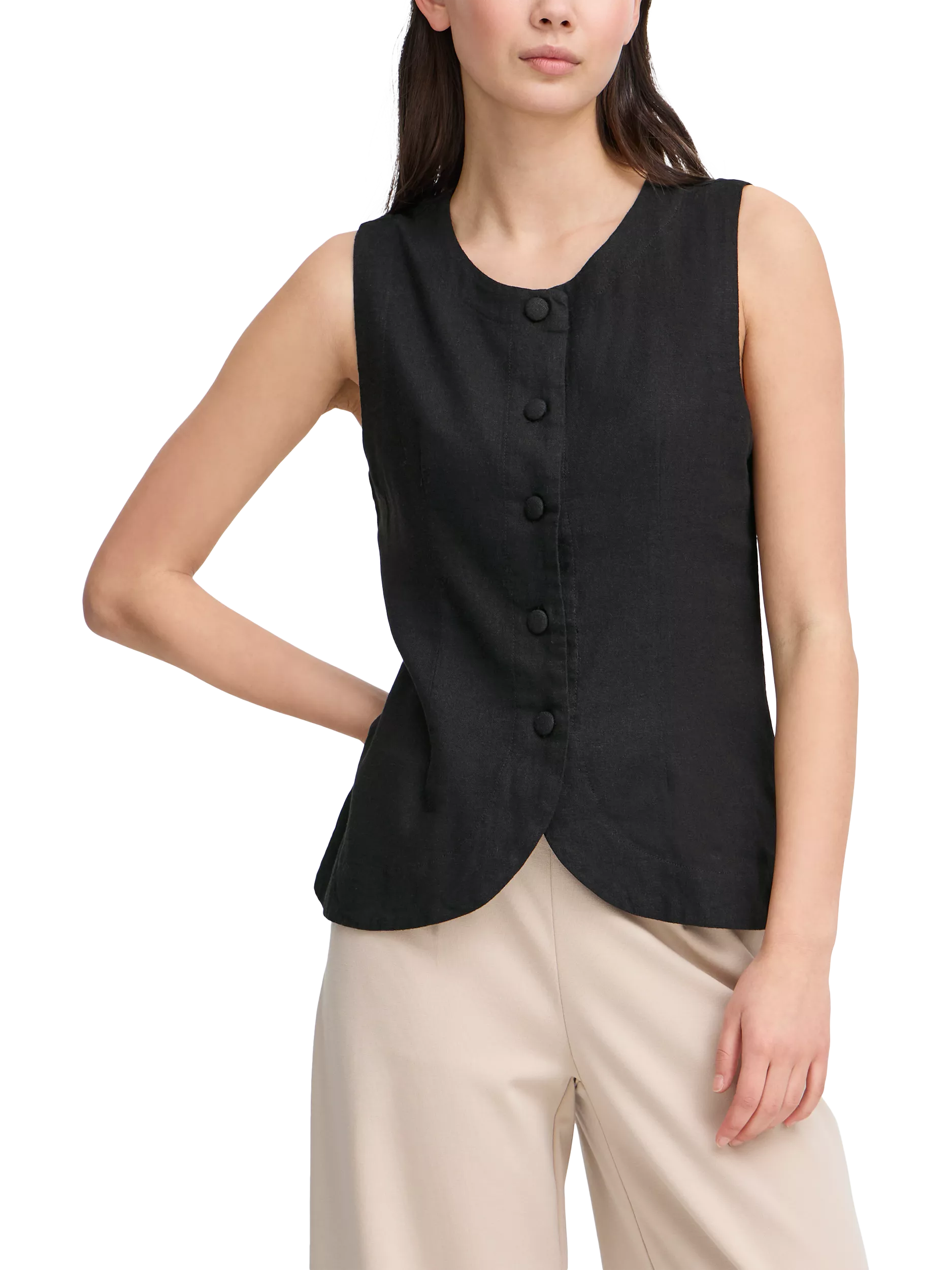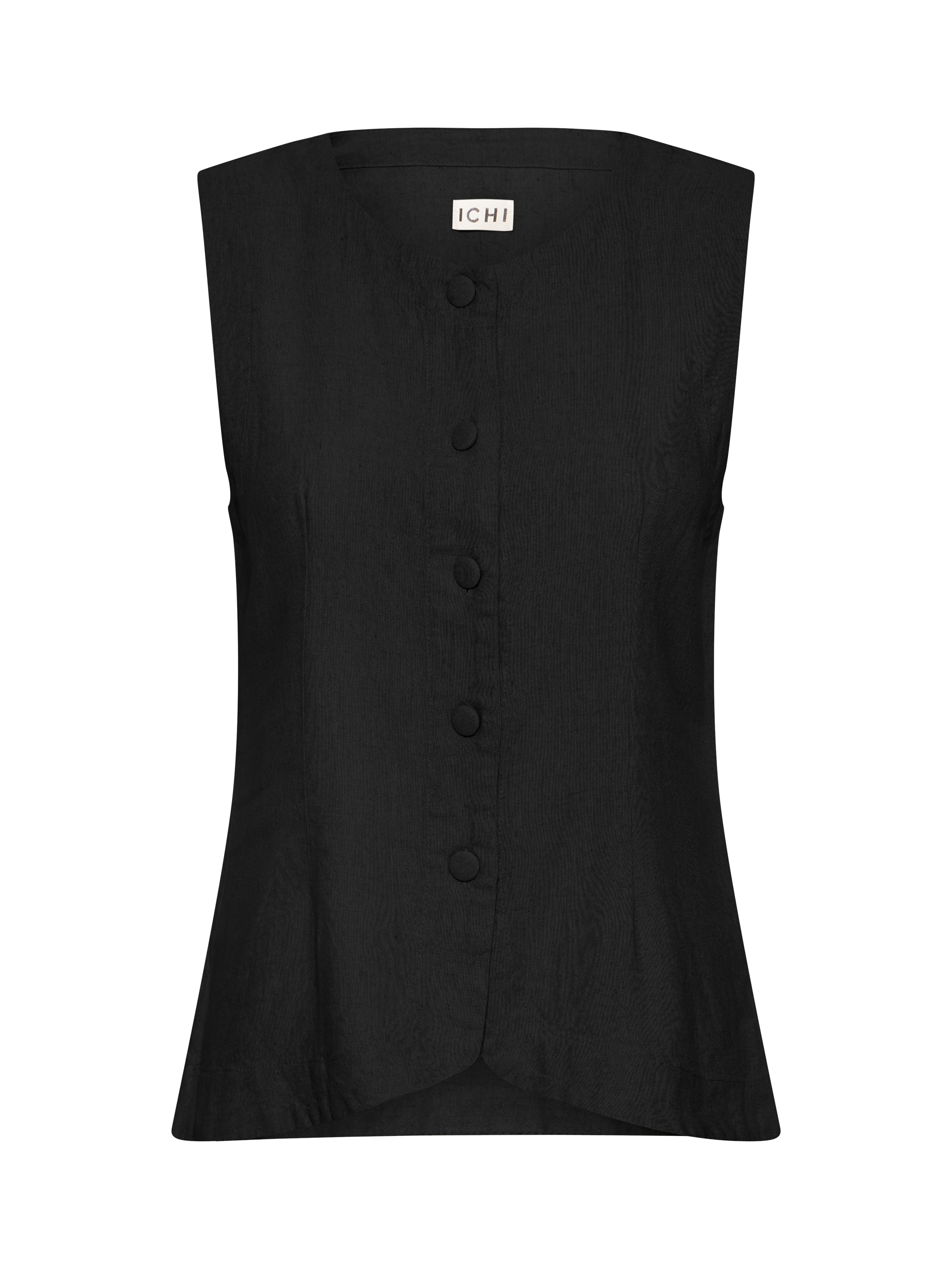 A modern style, this button-up sleeveless top from ICHI allows for endless styling opportunities. Carved with a crew neck, it has a high linen content in its mix, making it lightweight and airy in summer.