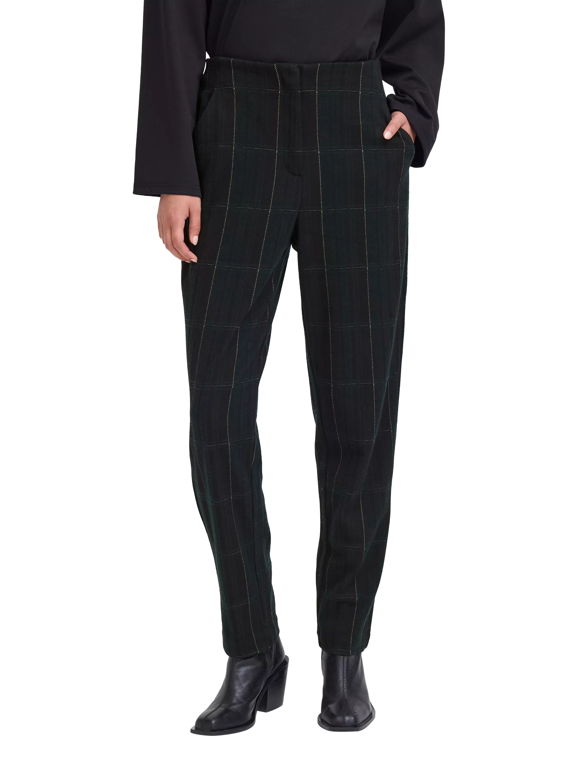A pair of slim leg tailored trousers by ICHI. They sit mid rise with a zip fly and are finished with a timeless check print.