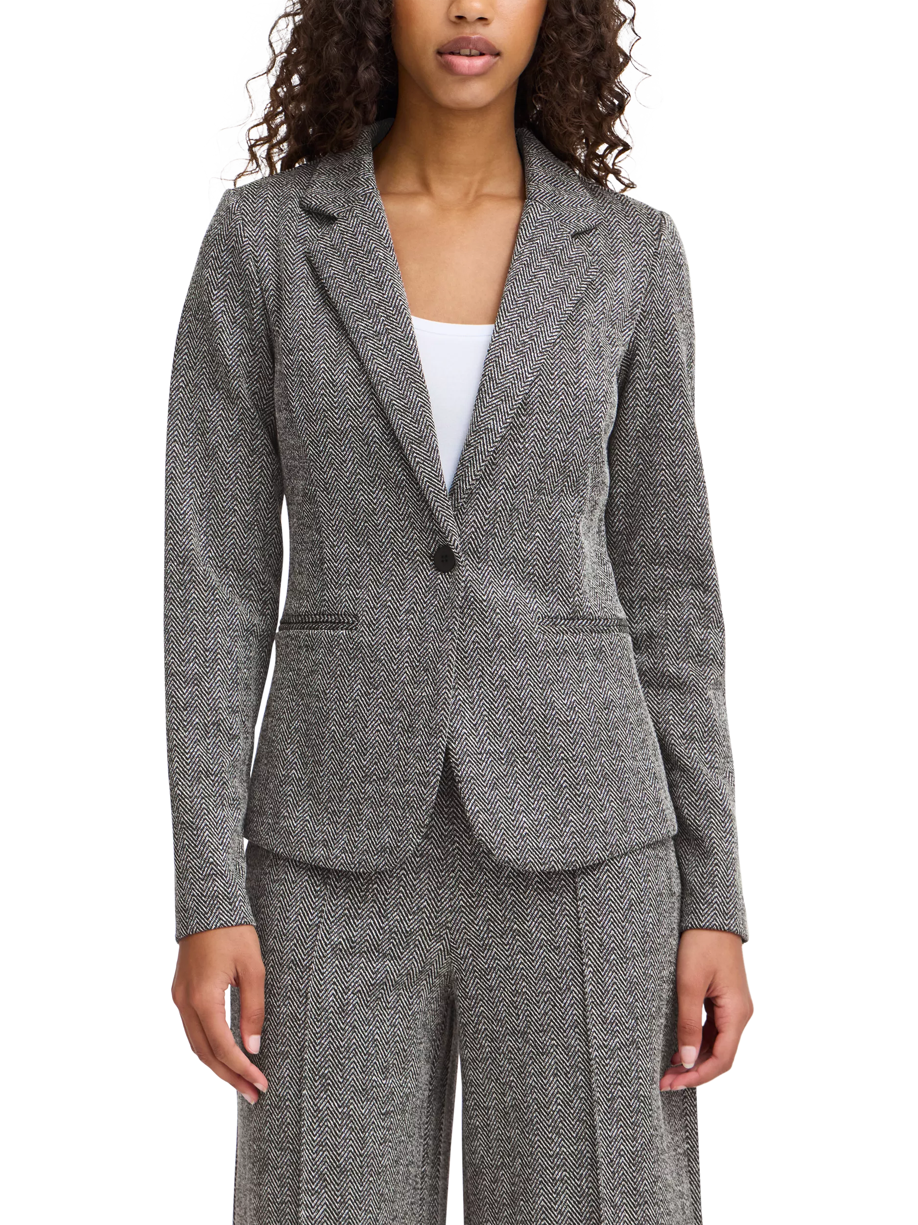 An elegant layering piece for smart events, this single-breasted blazer by ICHI is made from a softly blended fabric with a herringbone jacquard finish.
