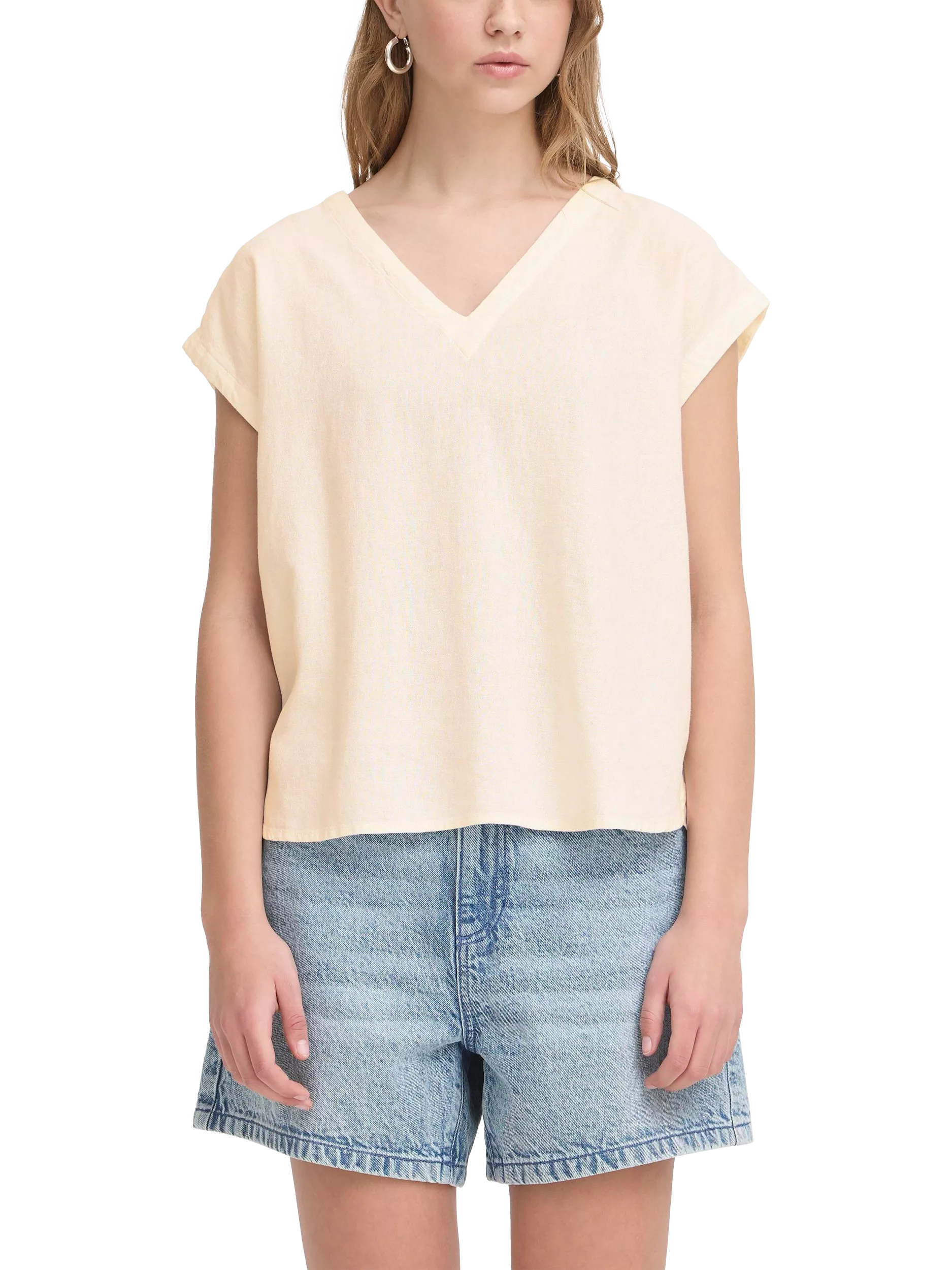 An essential addition to your wardrobe, this blouse from ICHI is free-from-fuss for timeless appeal. Framed with a classic v-neckline and cap sleeves, the linen blend fabric gives it a breathable, airy quality and slips on well with tonal denim ready for the summer.