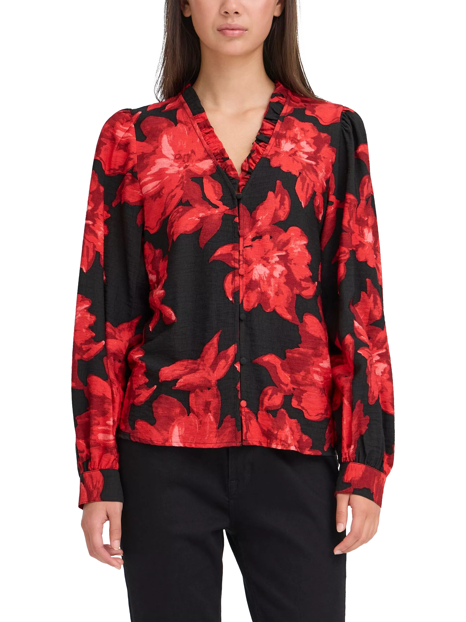 A blouse by ICHI. Featuring a V-neck and long sleeves, its printed with florals. Built for focus, made for comfort.