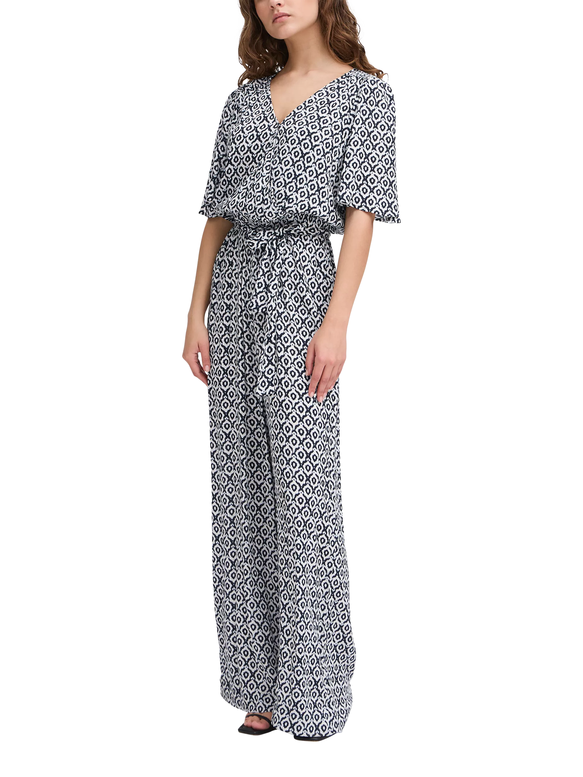 Framing with its v-neck and short sleeves, this jumpsuit by ICHI is whipped up from light and airy viscose. Featuring an elegant ikat tile pattern, this all in one is sure to keep you light and airy this summer.