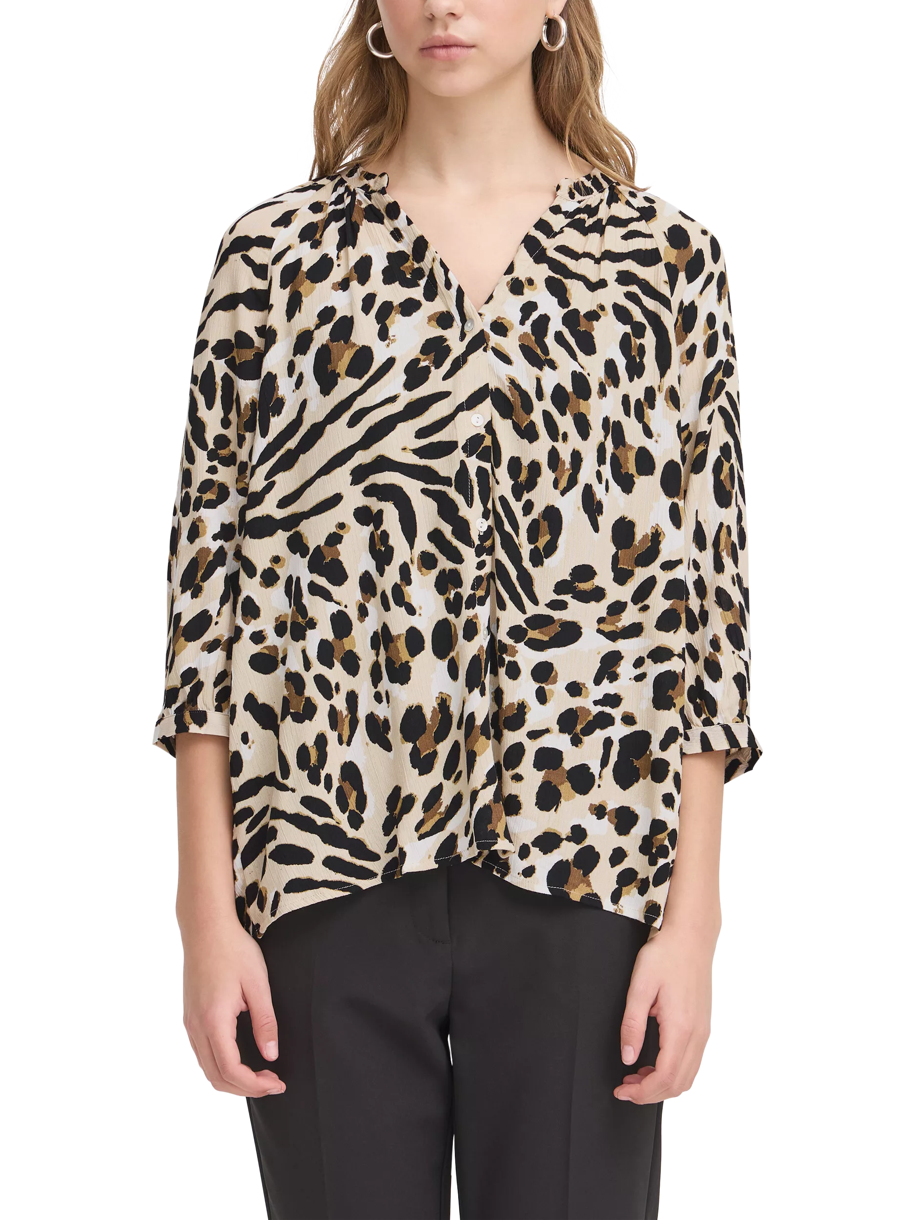 Bringing a neat addition to your wardrobe, this blouse from ICHI is fashioned with an animal print to bring a wild vibe to your wardrobe favourites. Classic in cut with a v-neckline and three-quarter length sleeves, it is made from a light yet durable fabric and will slot seamlessly into your everyday staples.