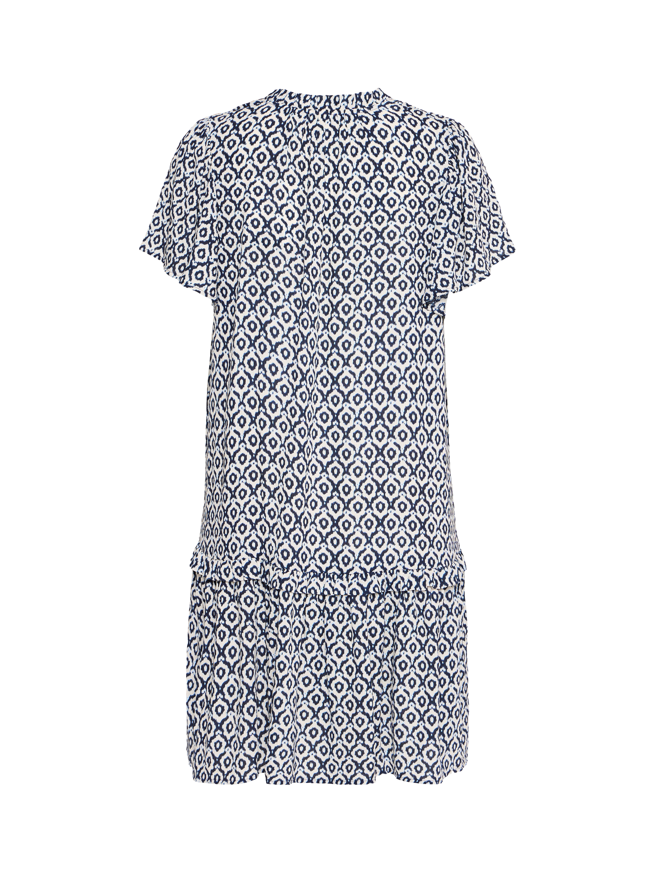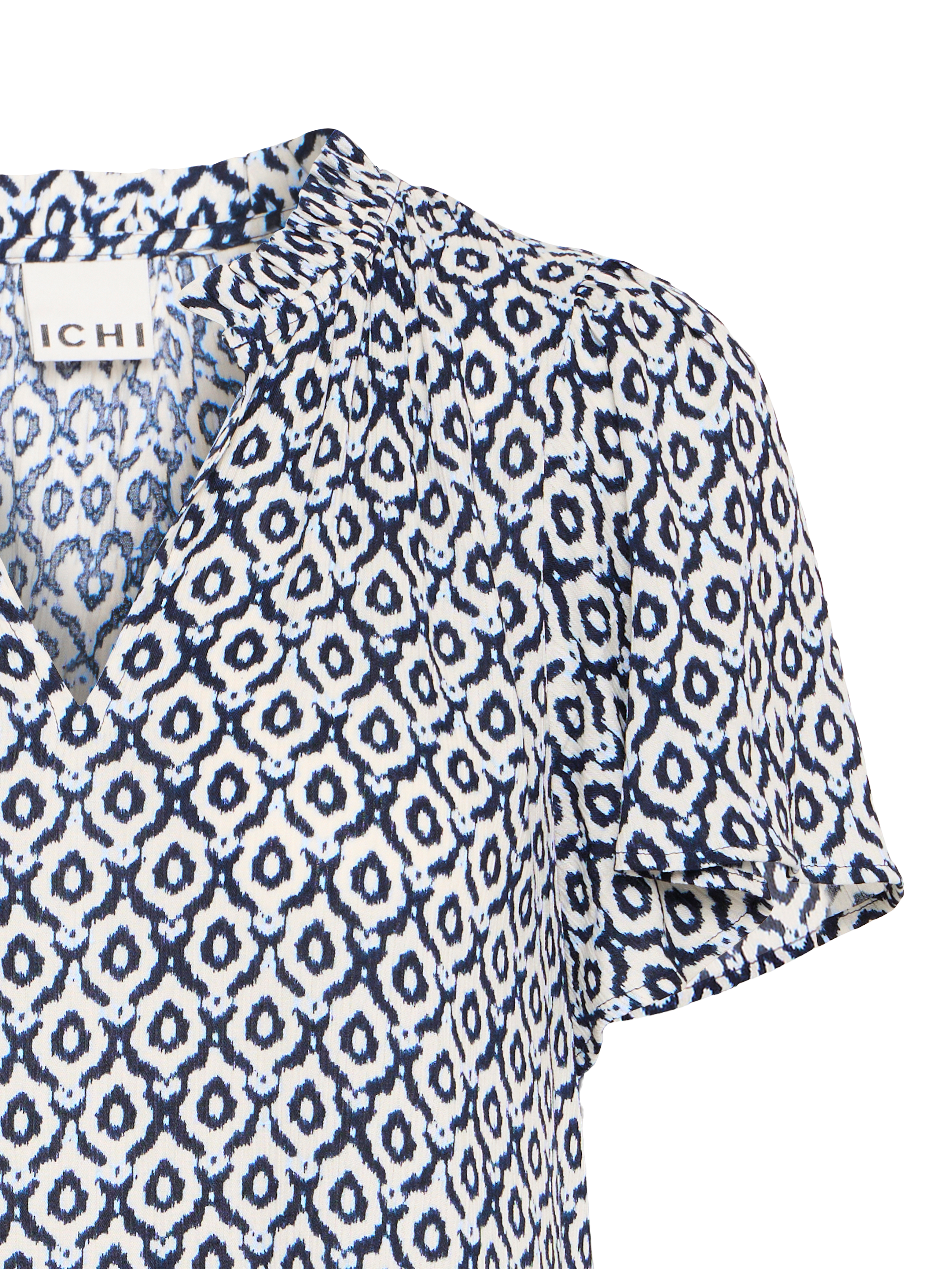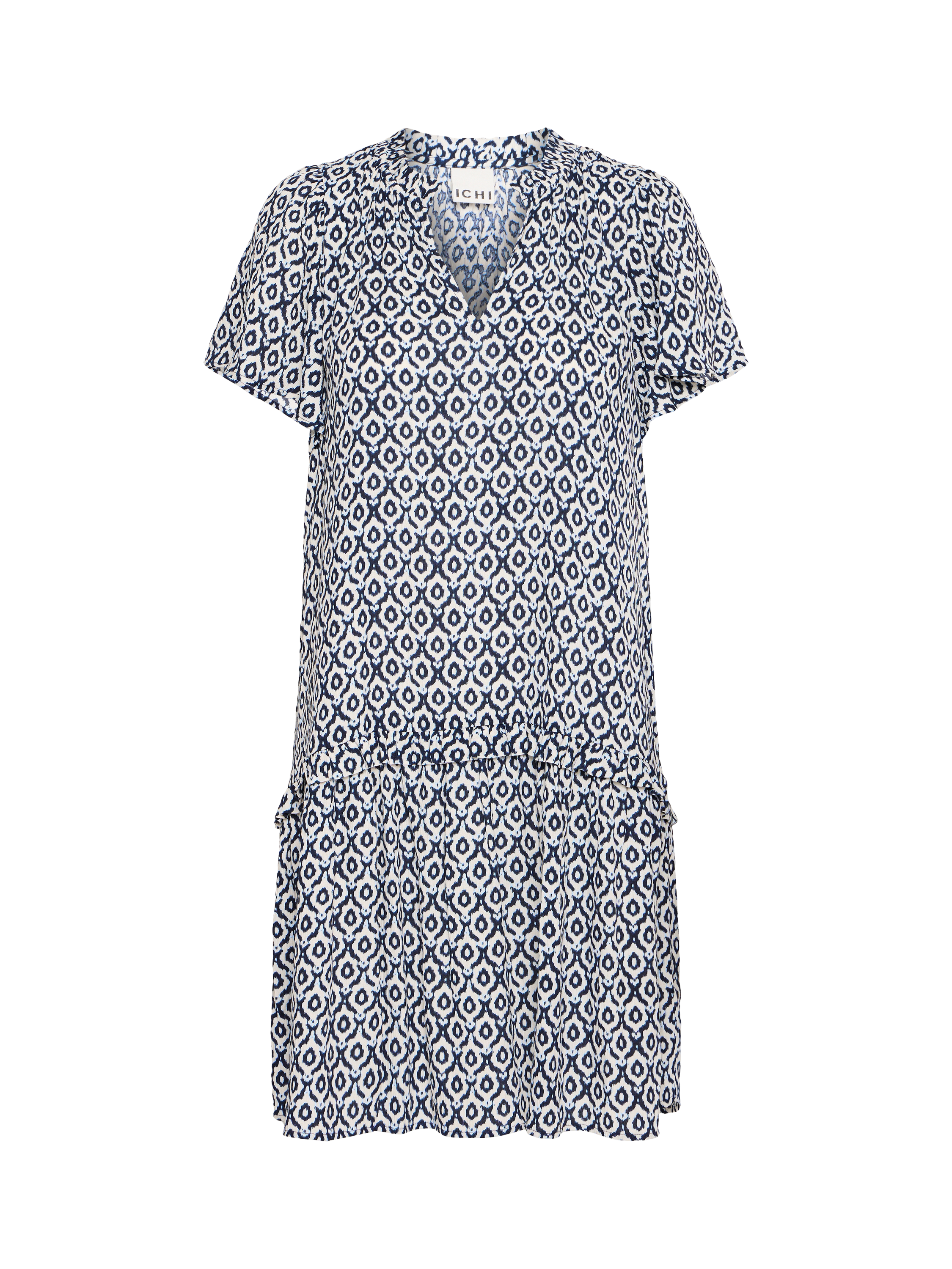 Cut with an exaggerated silhouette, this knee length dress from ICHI is perfect for a summer outing thanks to a lightweight viscose fabric. With a v-neckline and short sleeves, this style has an eye-catching ikat tile pattern providing both comfort and flair.