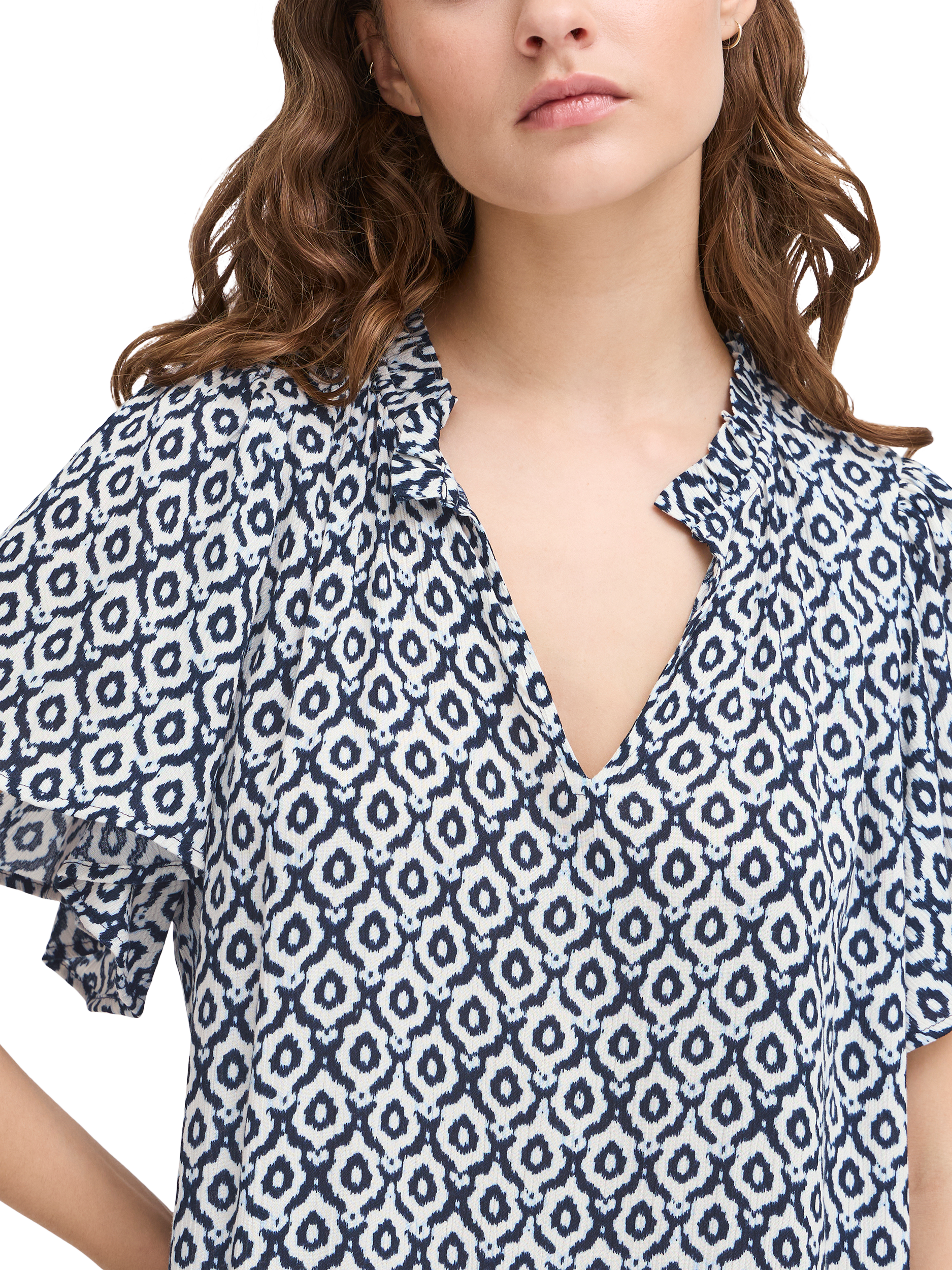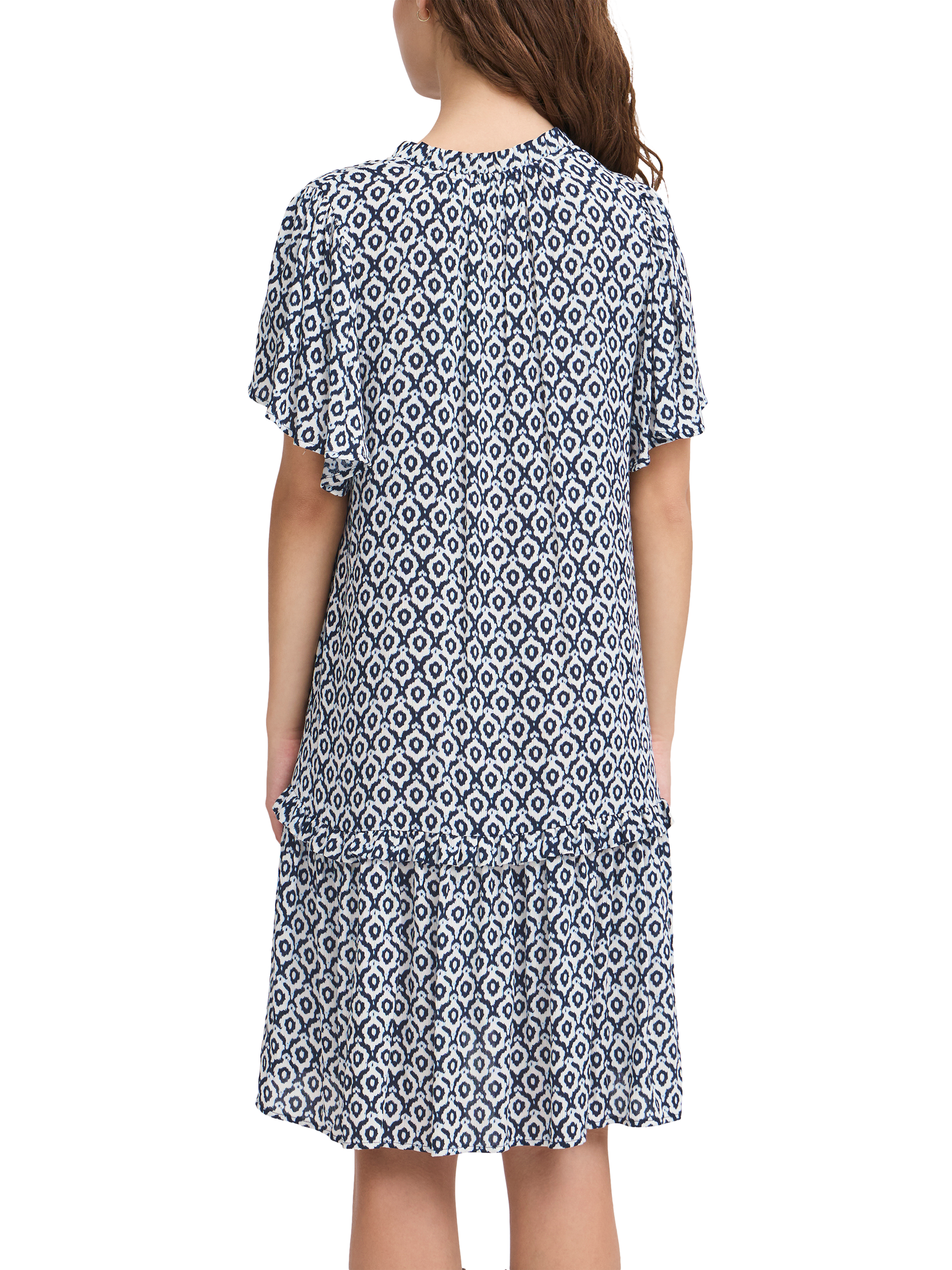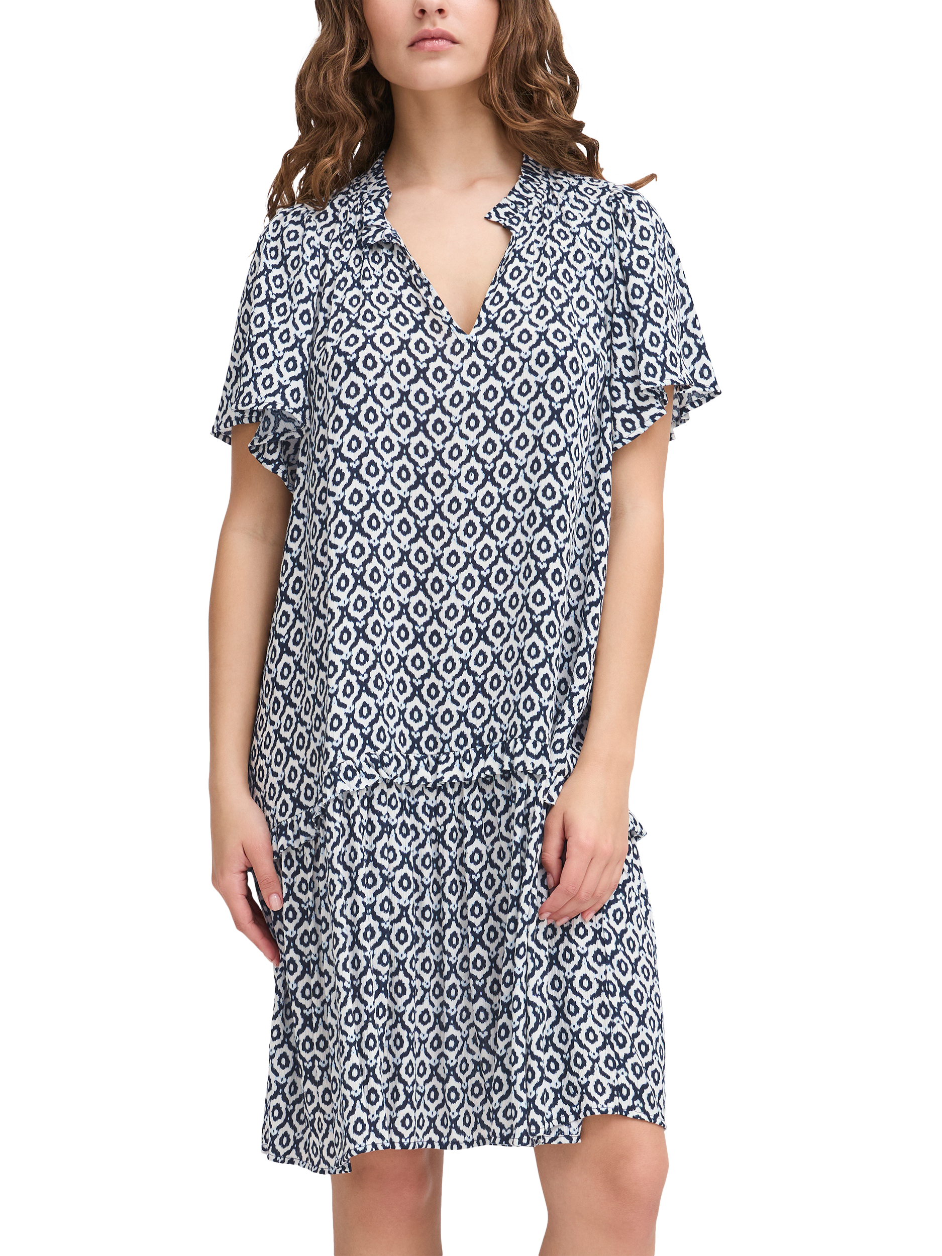 Cut with an exaggerated silhouette, this knee length dress from ICHI is perfect for a summer outing thanks to a lightweight viscose fabric. With a v-neckline and short sleeves, this style has an eye-catching ikat tile pattern providing both comfort and flair.