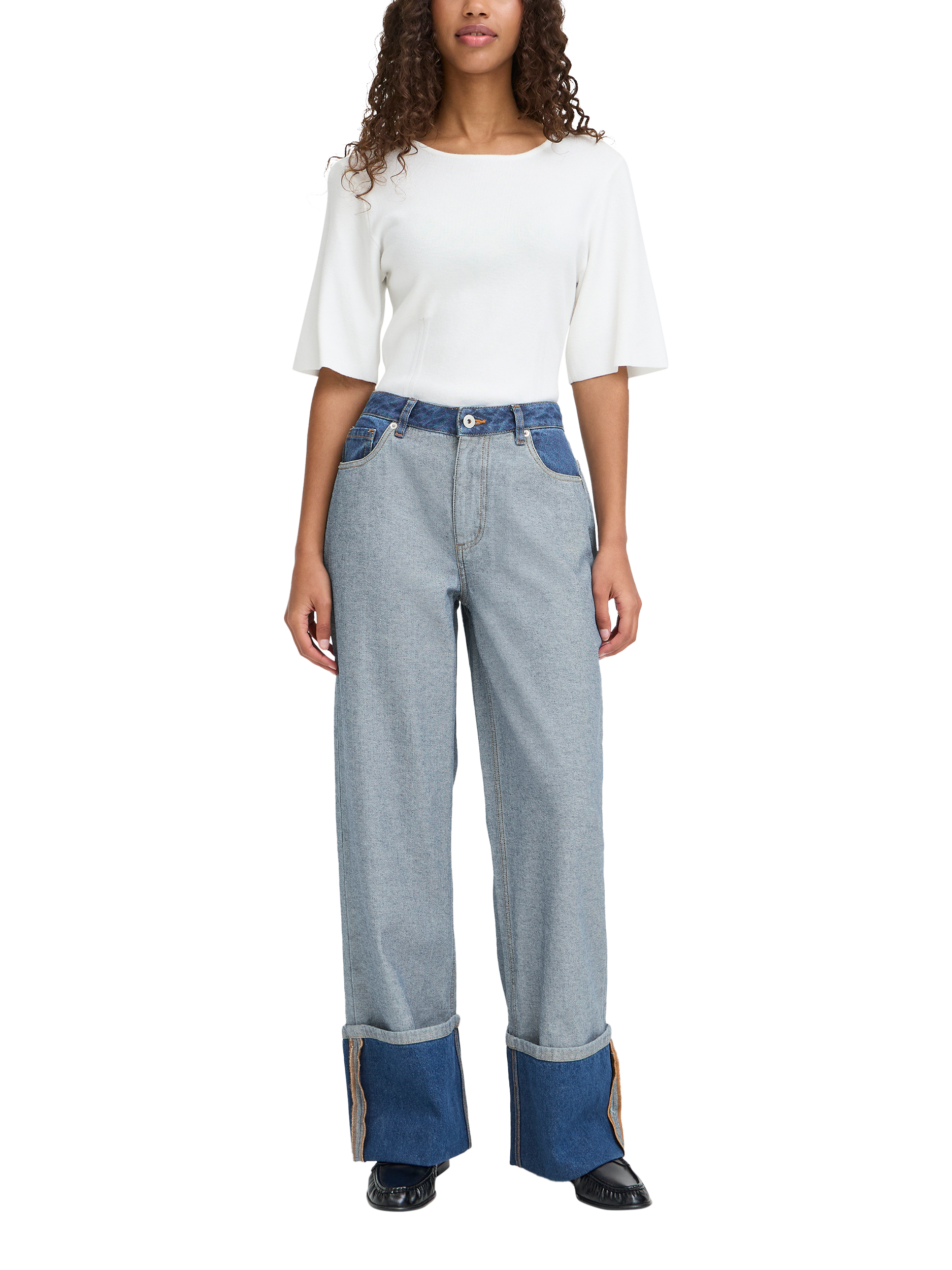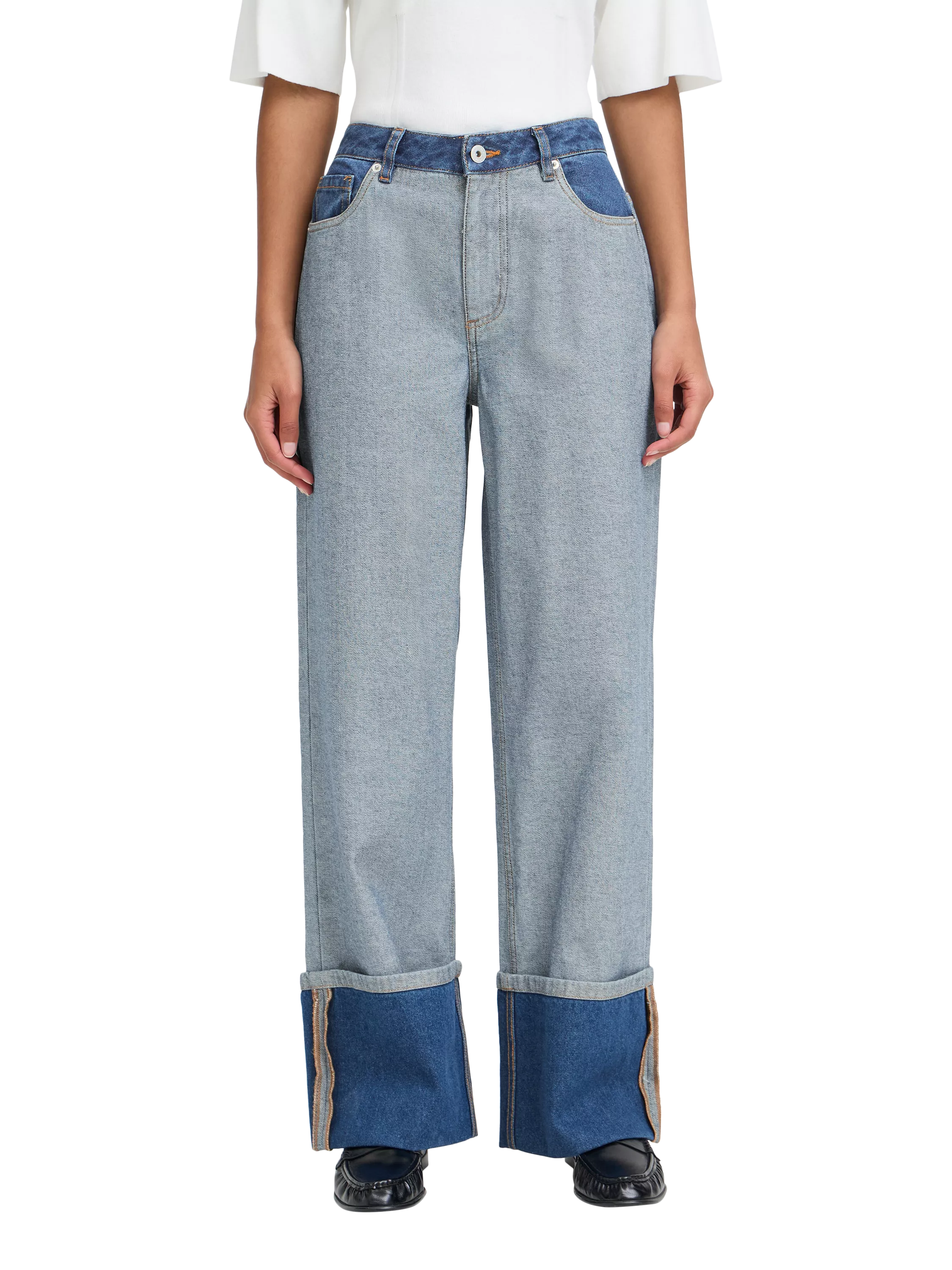 Longline wide-leg silhouette with bold folded cuffs and sculpted waistband, offering fluid drape and confident city-ready ease.