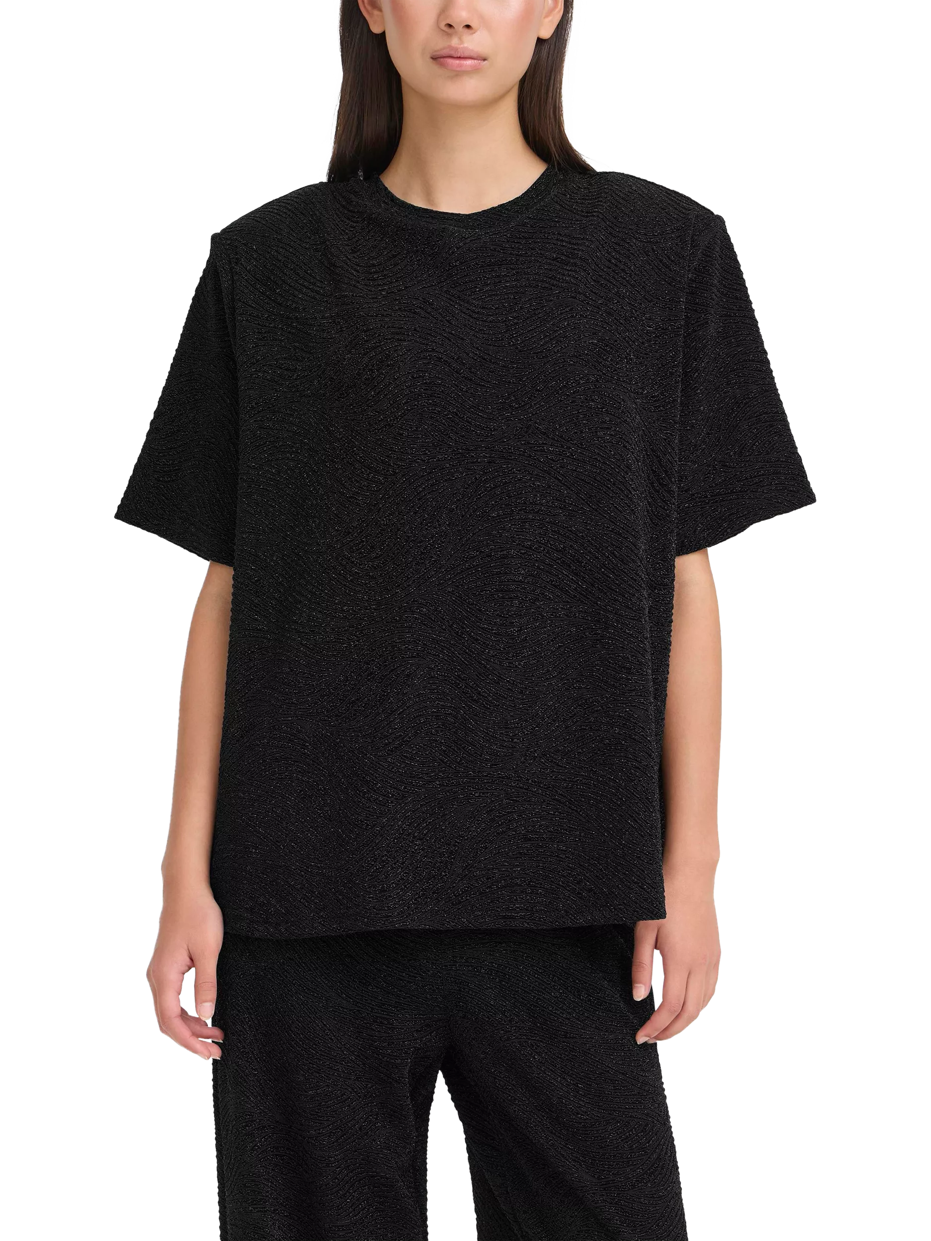 A party-ready jersey top by ICHI. Featuring a crew neck and short sleeves, it's elevated with shimmering metallics. Perfectly polished for nights filled with fun.