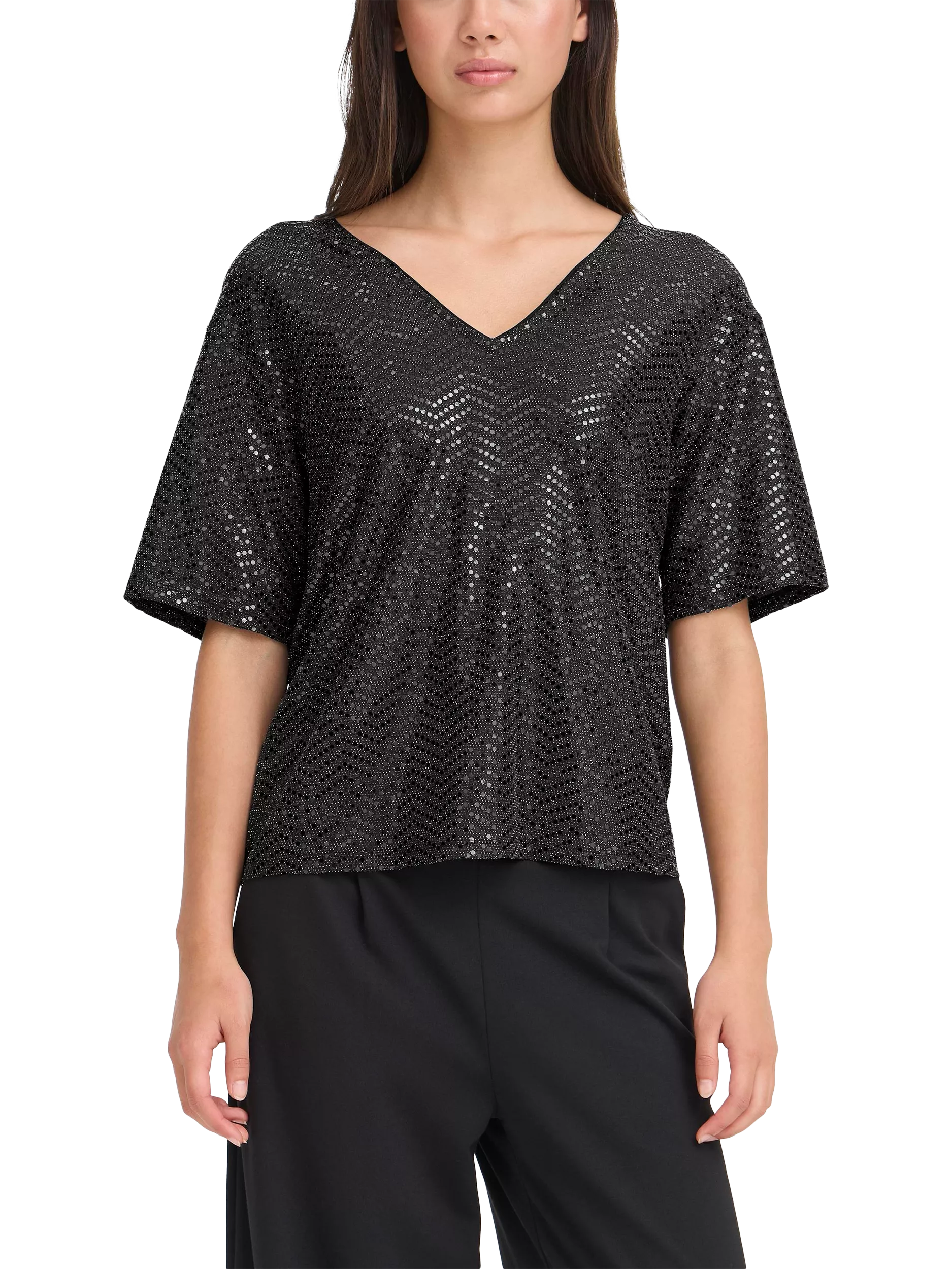 An elevated everyday T-shirt by ICHI. With a V-neck and short sleeves, its subtle shimmer gives an eye-catching look. Elevate your party wardrobe with ease.
