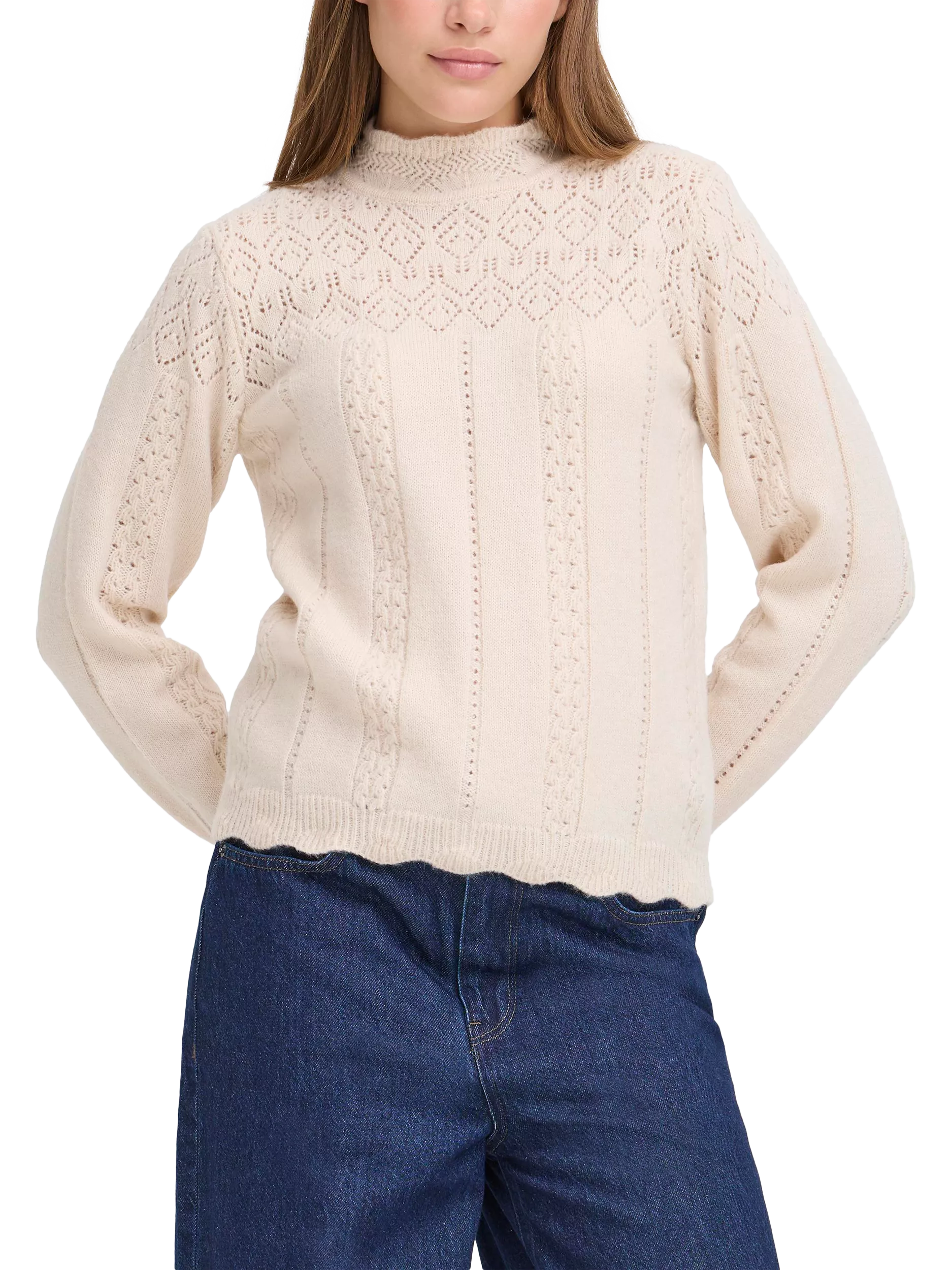 A cosy, comfortable high neck jumper by ICHI. Its medium weight and long sleeves keep you warm, while the thoughtful design makes it perfect for layering or wearing on its own.