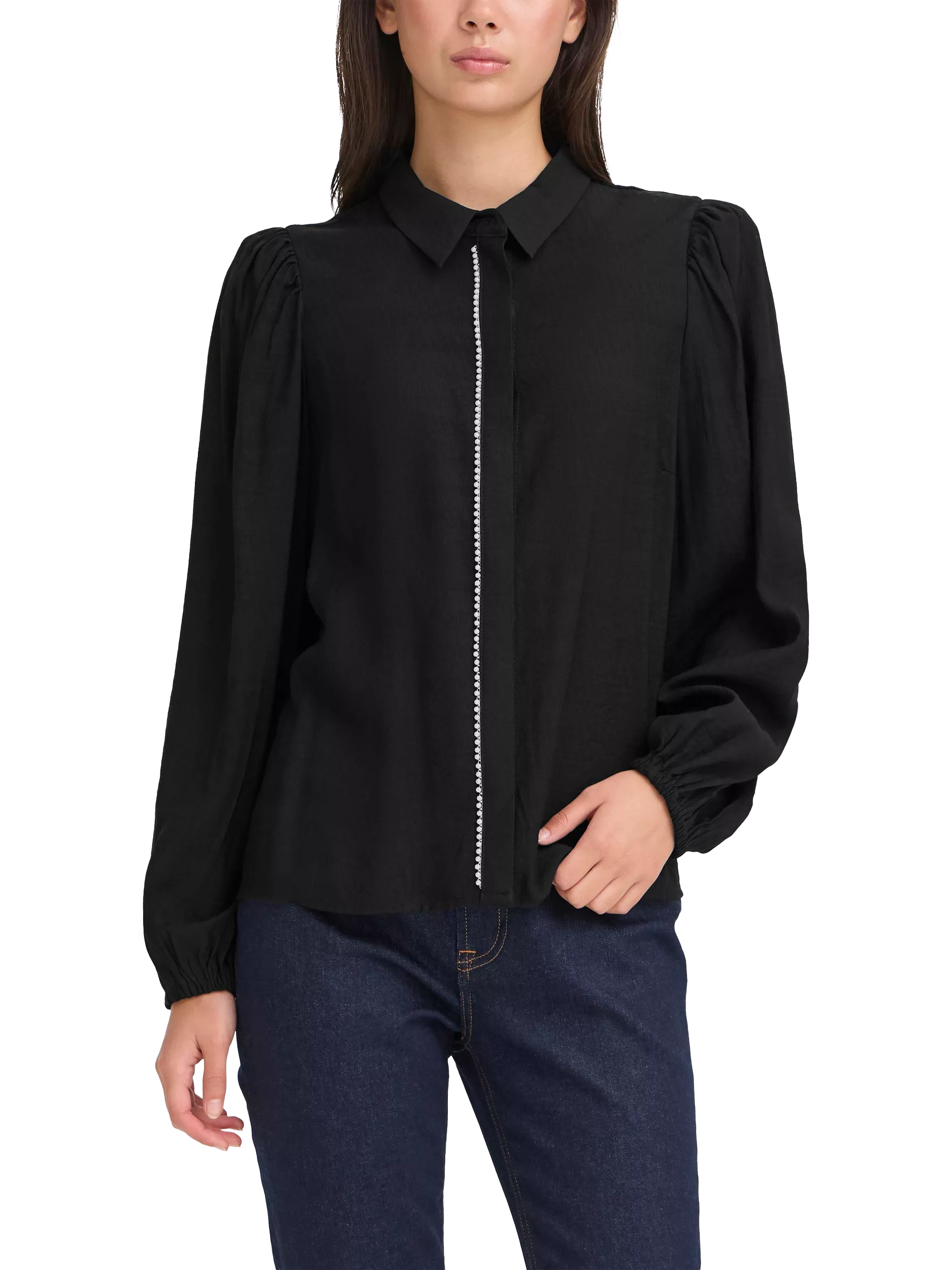A tailored fit blouse by ICHI, made from a soft viscose blend. With a collar neck and long sleeves, it's elevated with rhinestone embellishment. Perfectly polished for daily wear.